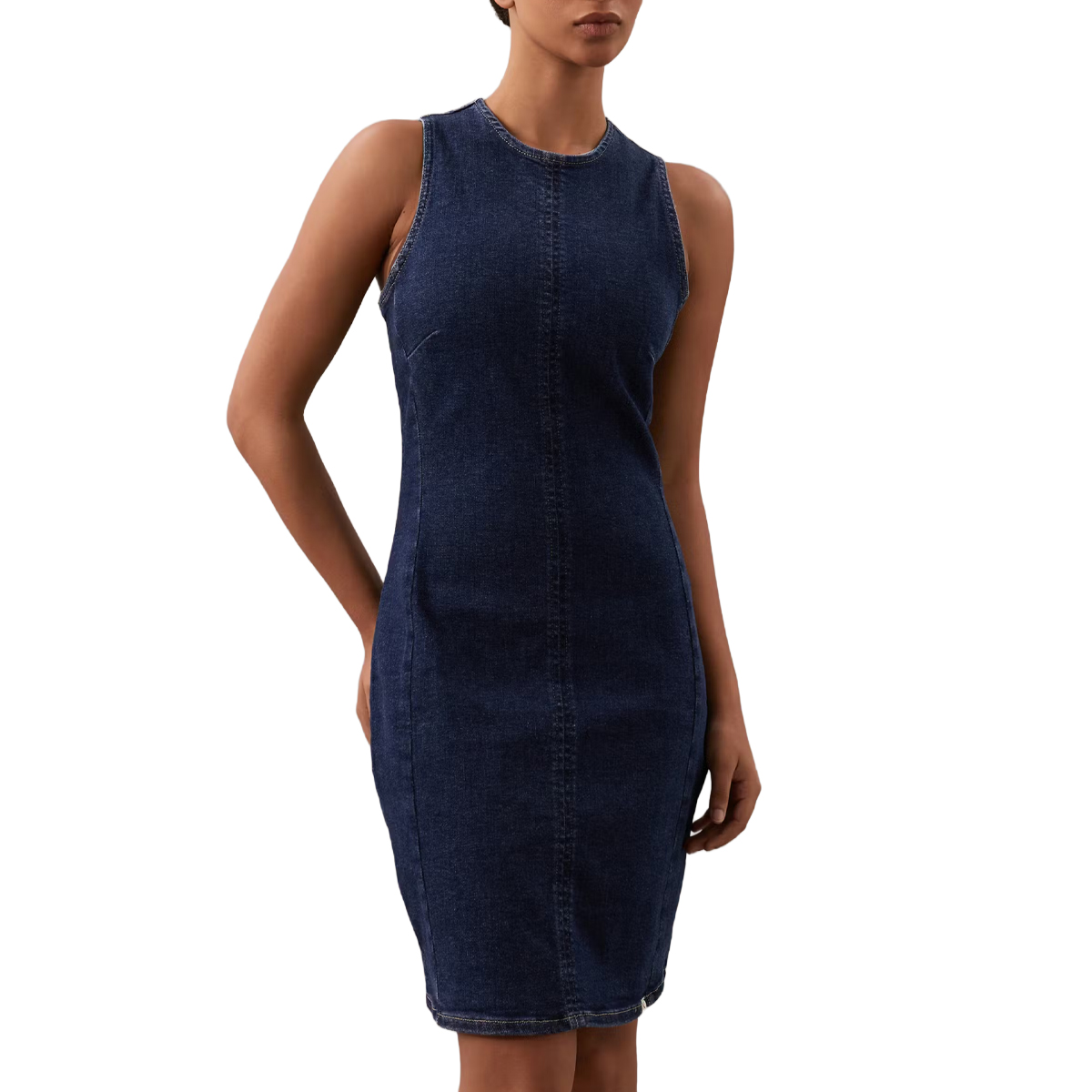 DENIM DRESS, FOR WOMEN, ROUND NECK, ARMHOLES, SOLID COLOUR, WITH LOGO, ZIP CLOSURE