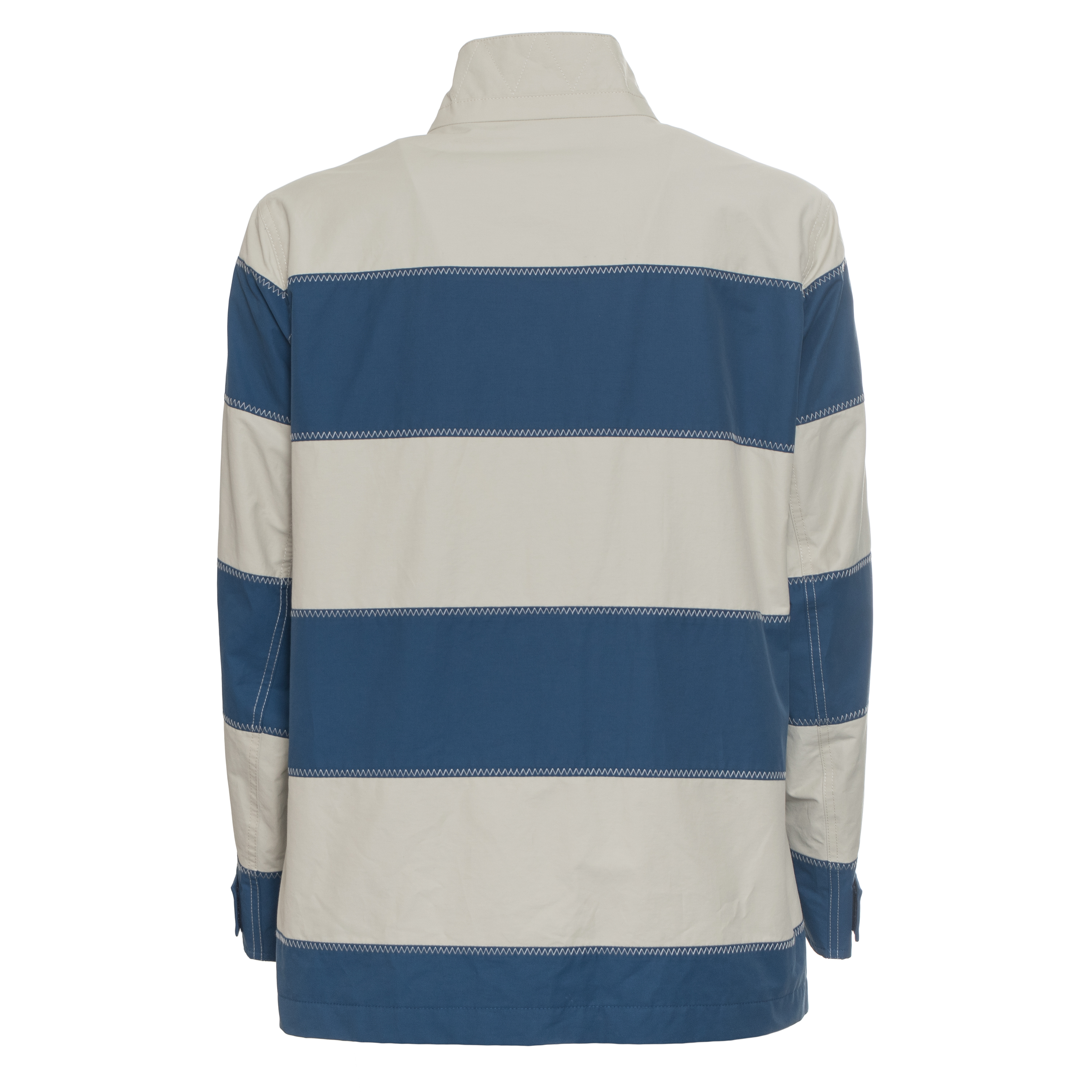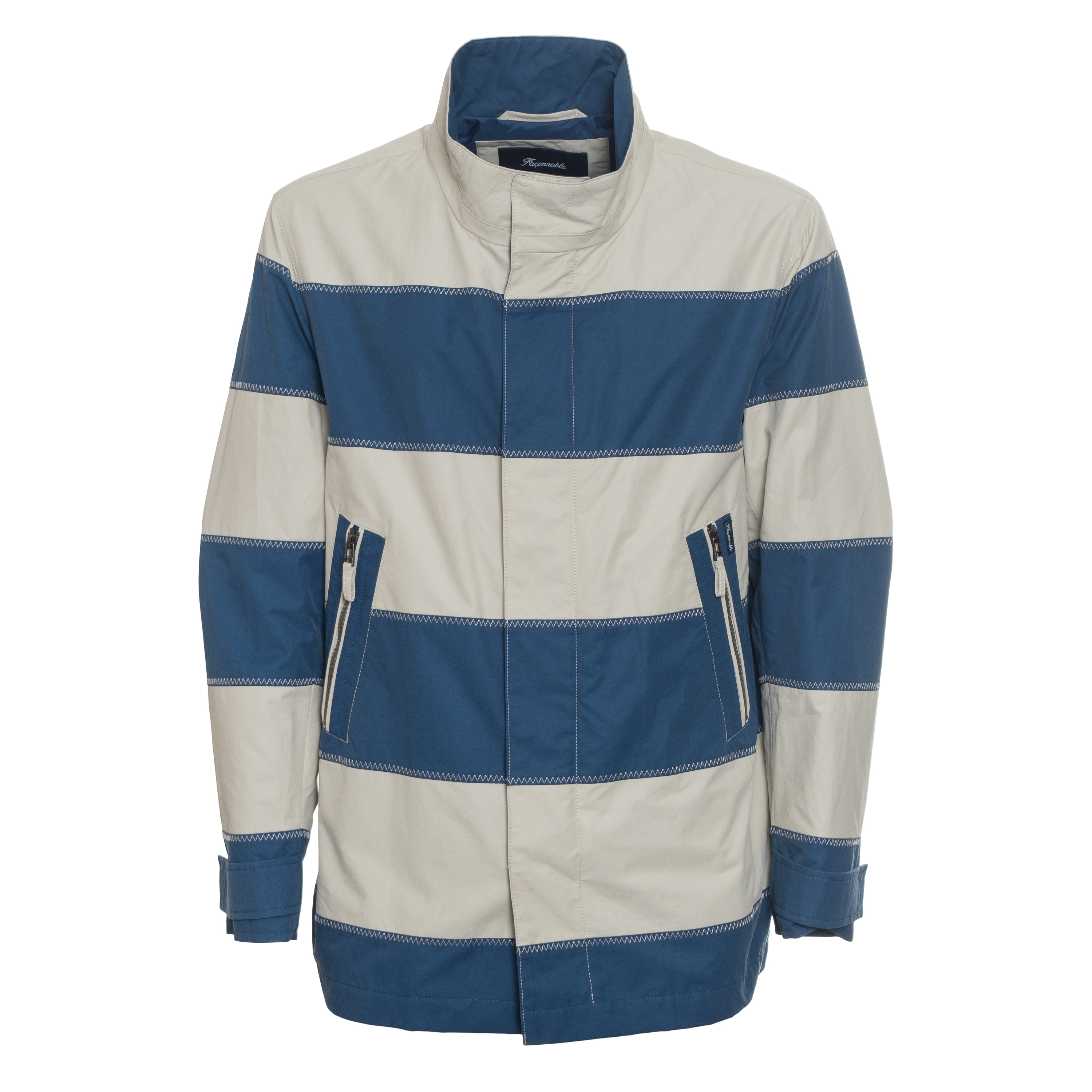 Tato IMPERMEABILE ARCHIVE STRIPE PARKA od FACONNABLE představuje precizně zpracovaný kus svrchního oděvu s důrazem na geometrickou čistotu. Dvoubarevné horizontální pruhy jsou spojeny výrazným klikatým stehem, který podtrhuje řemeslnou kvalitu a zajišťuje pevnost konstrukce.