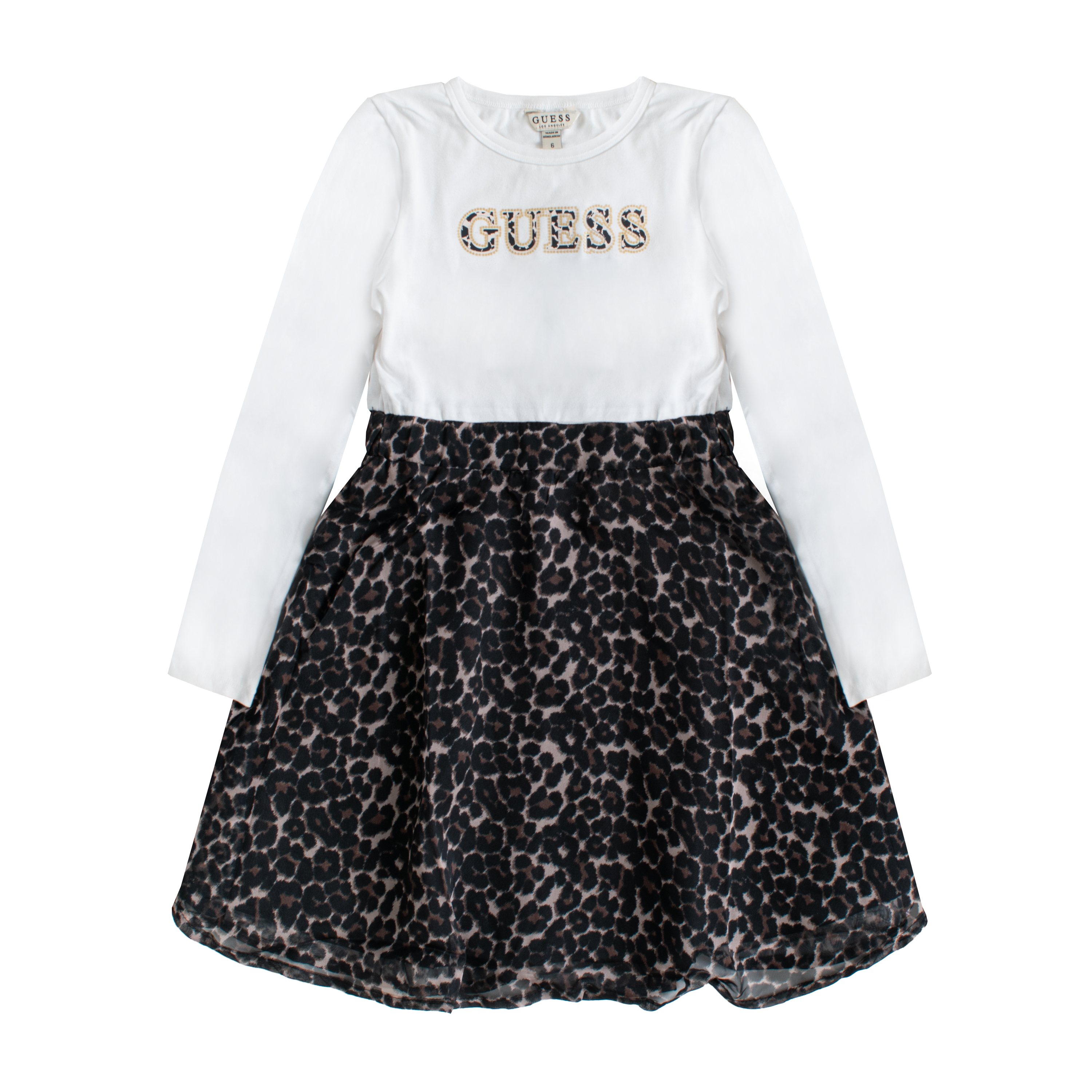 KNEE-LENGHT DRESS, FOR GIRLS, ROUND NECK, LONG SLEEVES, MULTICOLOR, LEOPARD, WITH LOGO
