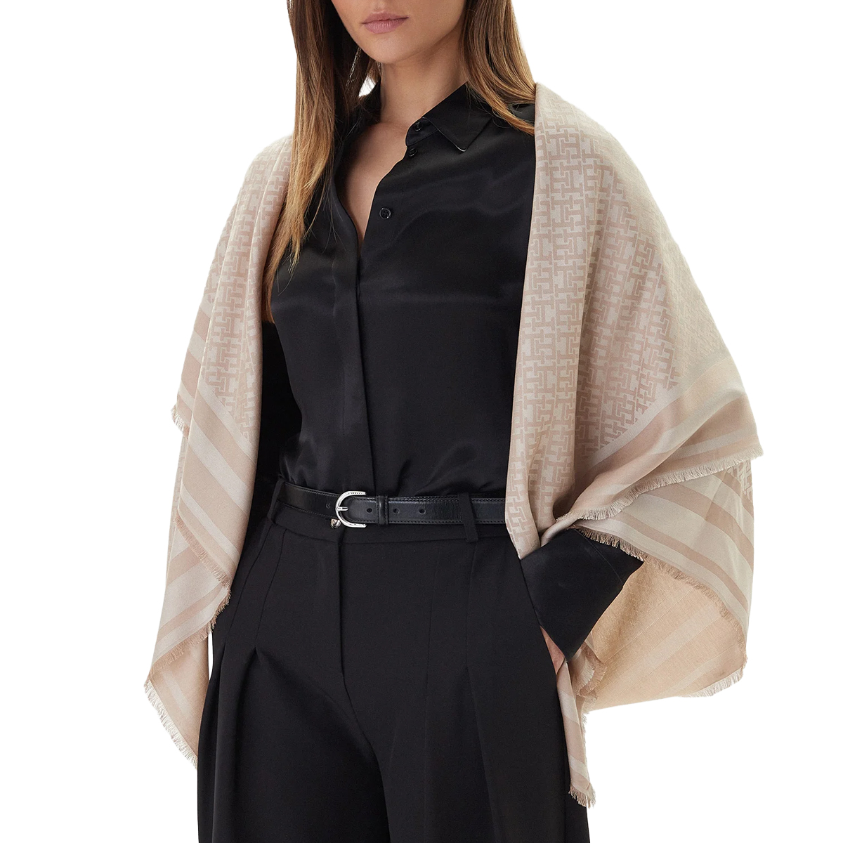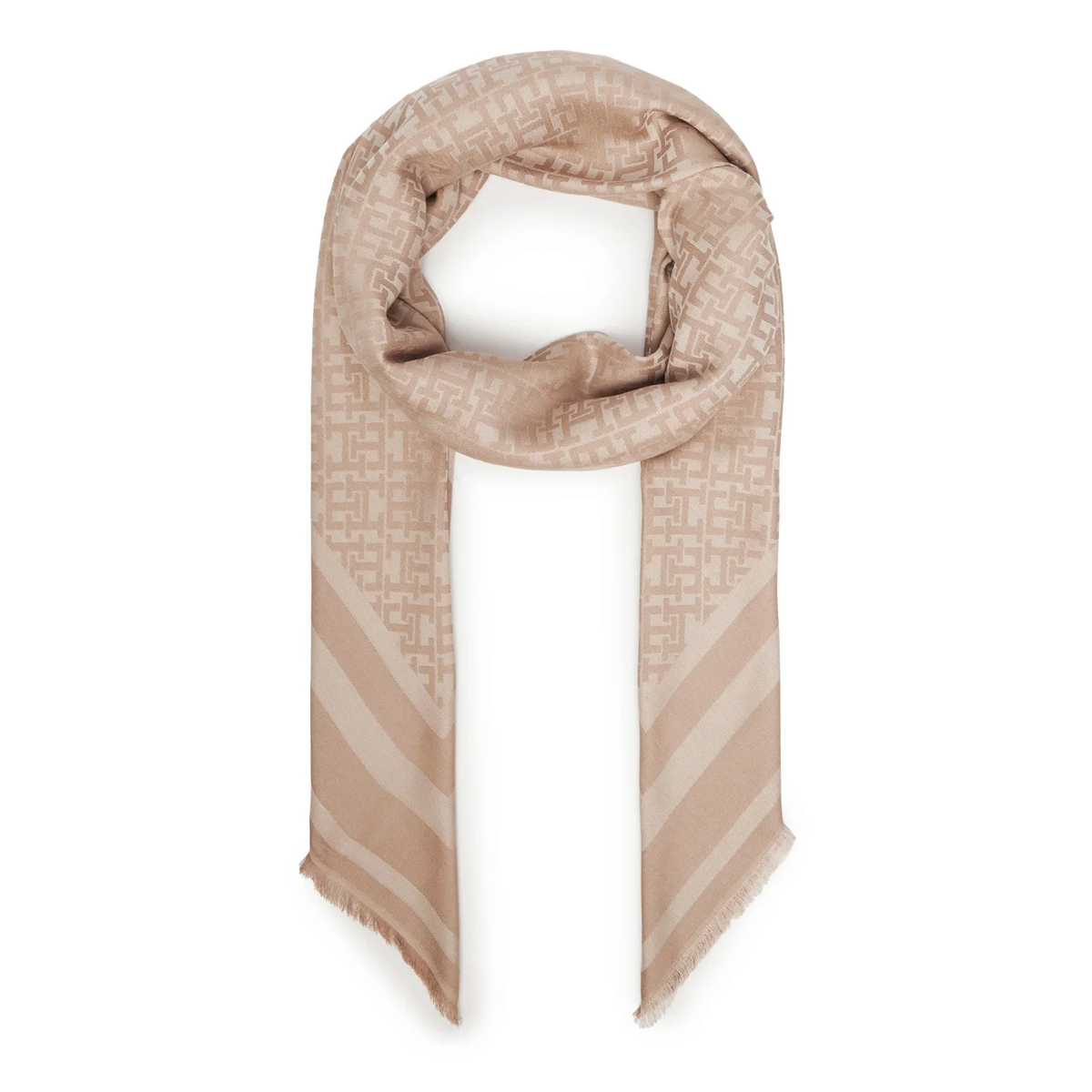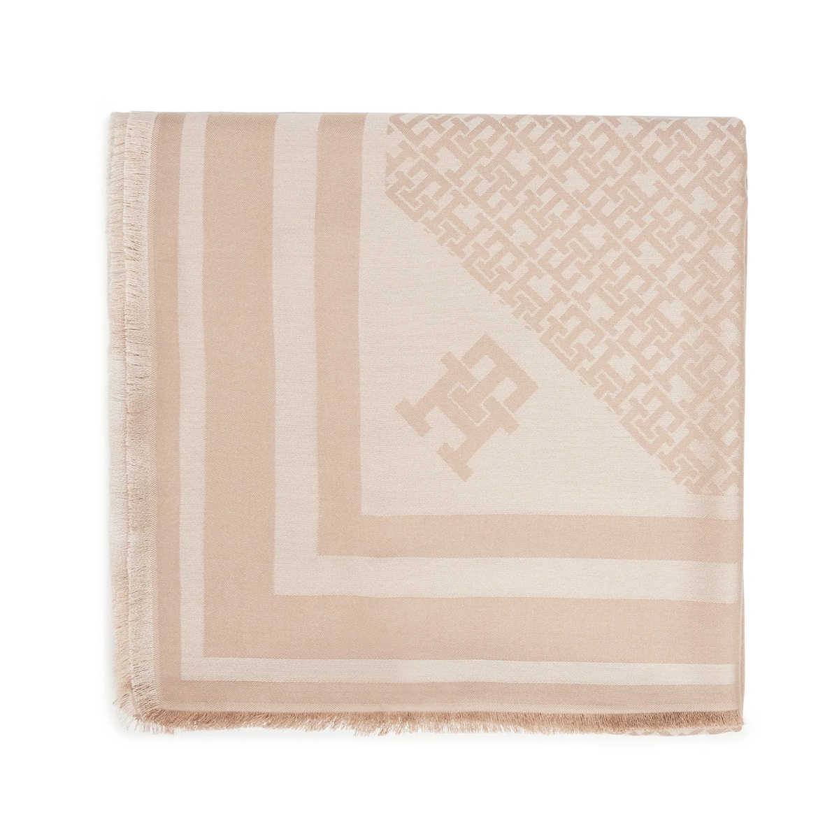 Tato pashmina TH MONOGRAM SQUARE, ACI od TOMMY HILFIGER je elegantním doplňkem s celoplošným vzorem monogramů, který jasně definuje její vizuální identitu. Čtvercový střih lemují jemné řasinkové třásně a postranní pruhy, které dodávají tkanině vzdušný a čistý vzhled. Celková konstrukce se vyznačuje lehkostí, která umožňuje krásné řasení a vyniknutí precizního zpracování všech okrajů.