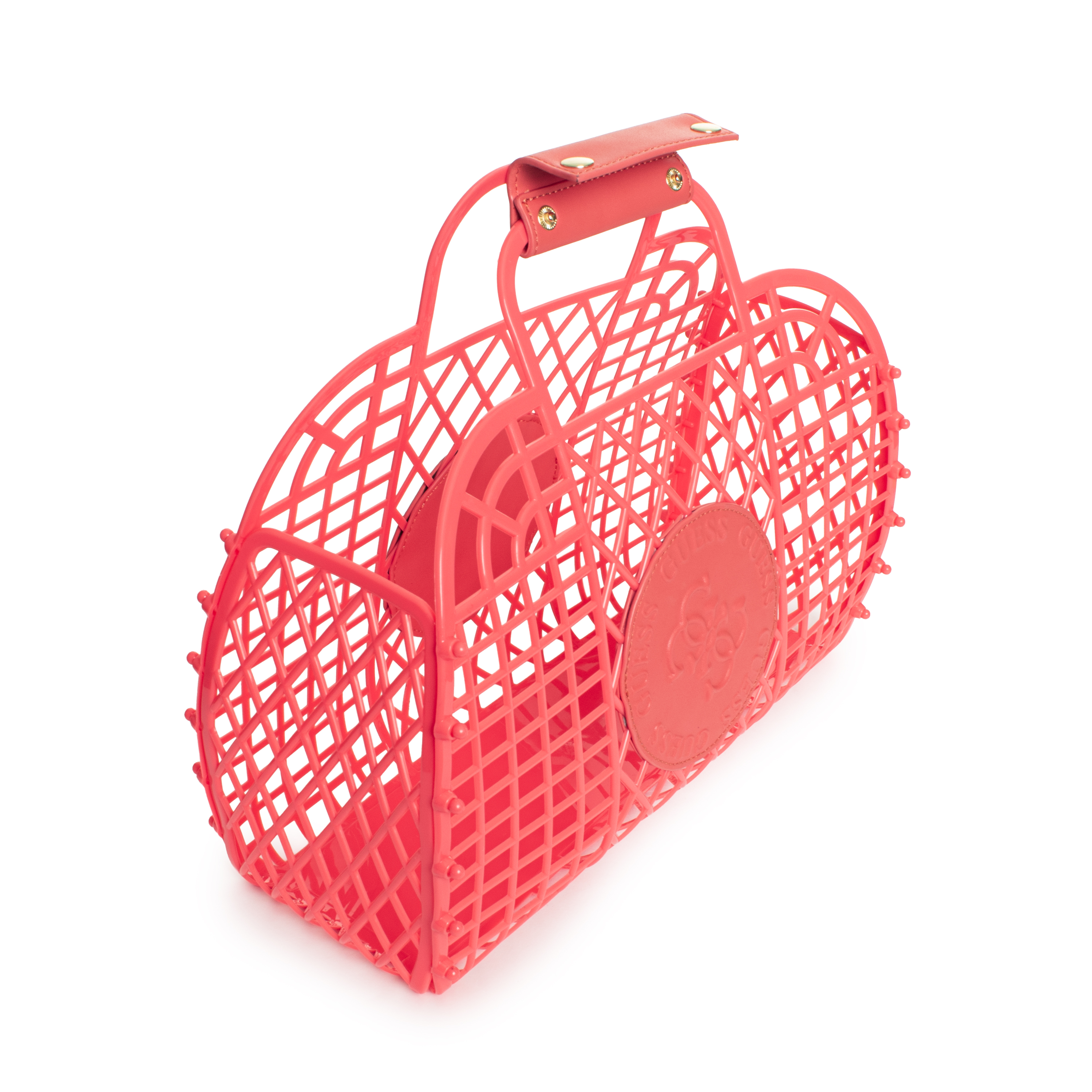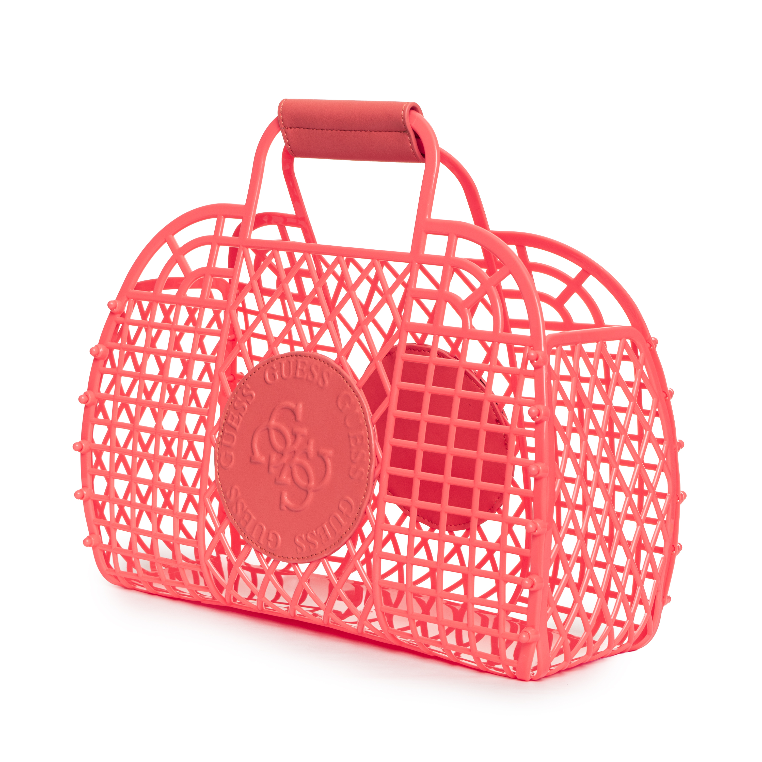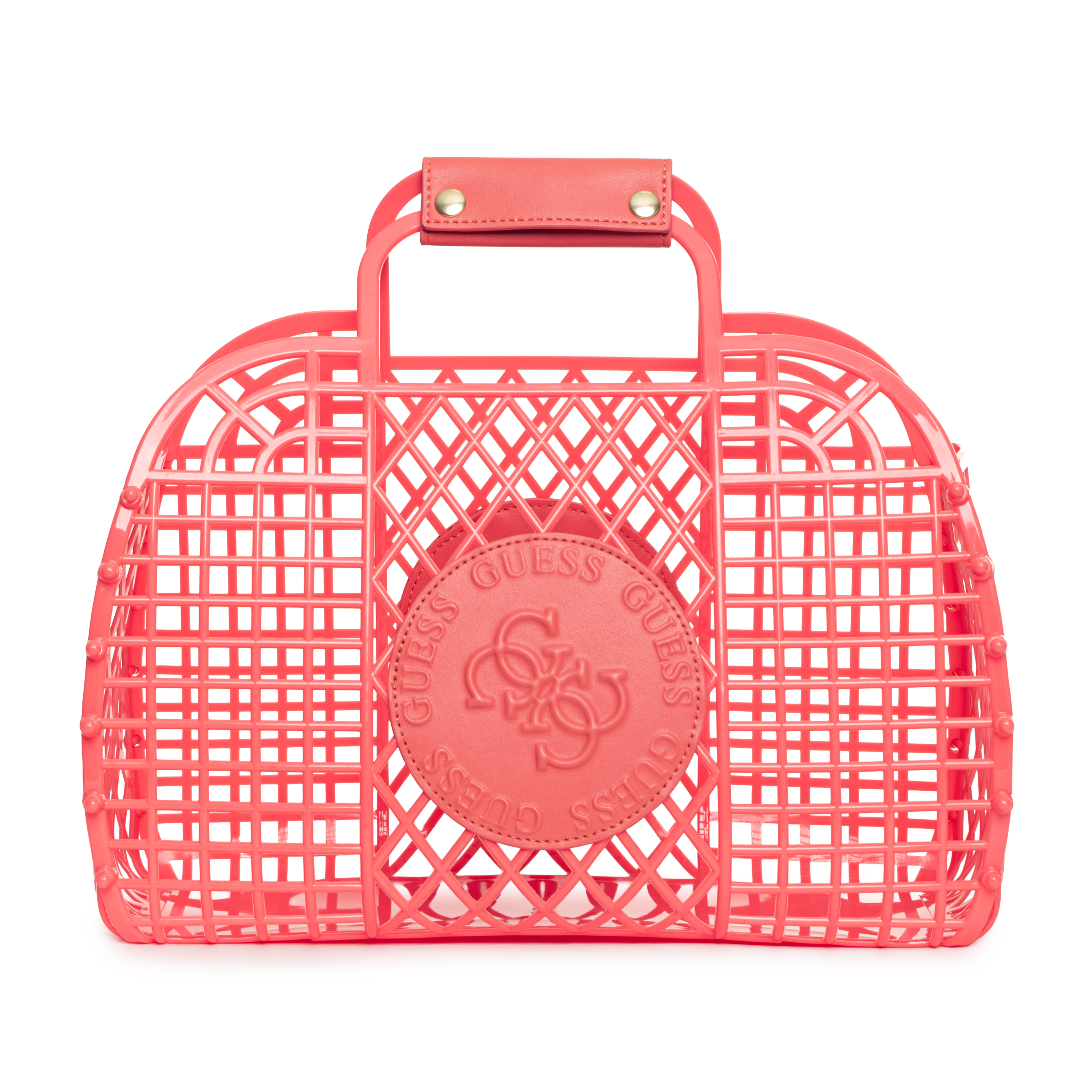 Diese BEACH PLASTIC BAG Handtasche von GUESS besticht durch ihre markante Gitterstruktur und ihre funktionale Ästhetik. Das Design wird durch ein durchbrochenes Muster definiert, das der Tasche eine skulpturale Anmutung verleiht und gleichzeitig Einblick in den großzügigen Innenraum gewährt. Ein markantes, kreisförmiges Logo-Patch auf der Vorderseite setzt ein klares Statement. Die Tragegriffe sind mit einer Manschette samt Druckknopfverschluss versehen, was die Stabilität erhöht.