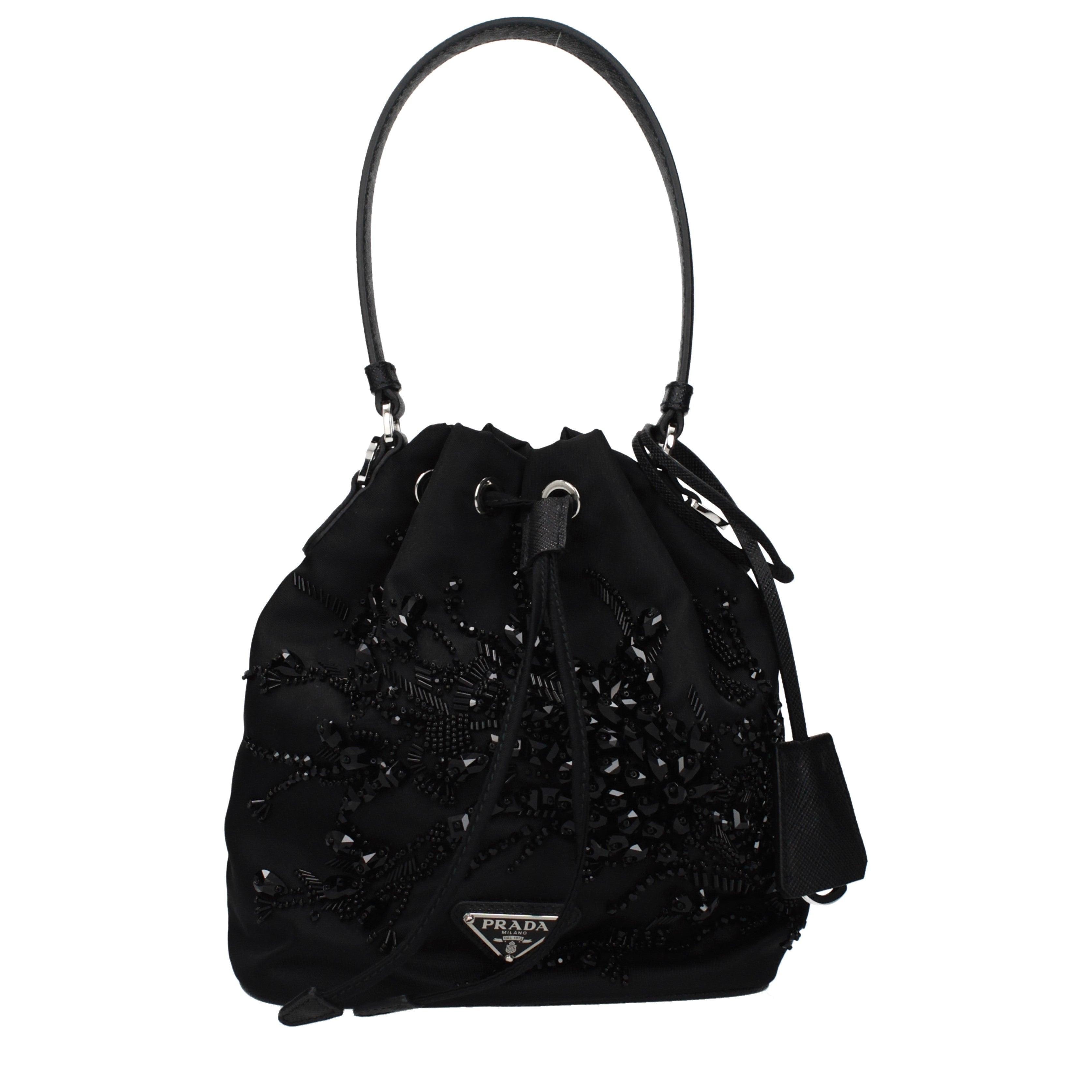 Diese Handtasche von PRADA besticht durch ihre kompakte Beutelform und die aufwendige Verzierung auf der Vorderseite. Die plastischen Applikationen verleihen dem Modell eine besondere Tiefe und unterstreichen den handwerklichen Anspruch. Ein praktischer Kordelzugverschluss und der schmale Tragegriff aus Leder vervollständigen das Design. Gefertigt wird dieses exklusive Accessoire als MADE IN ITALY Erzeugnis nach höchsten Standards.