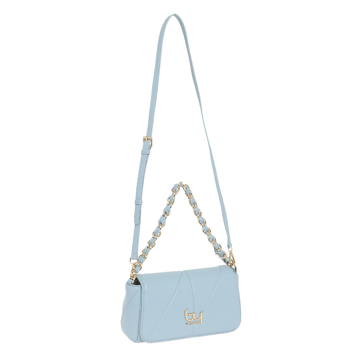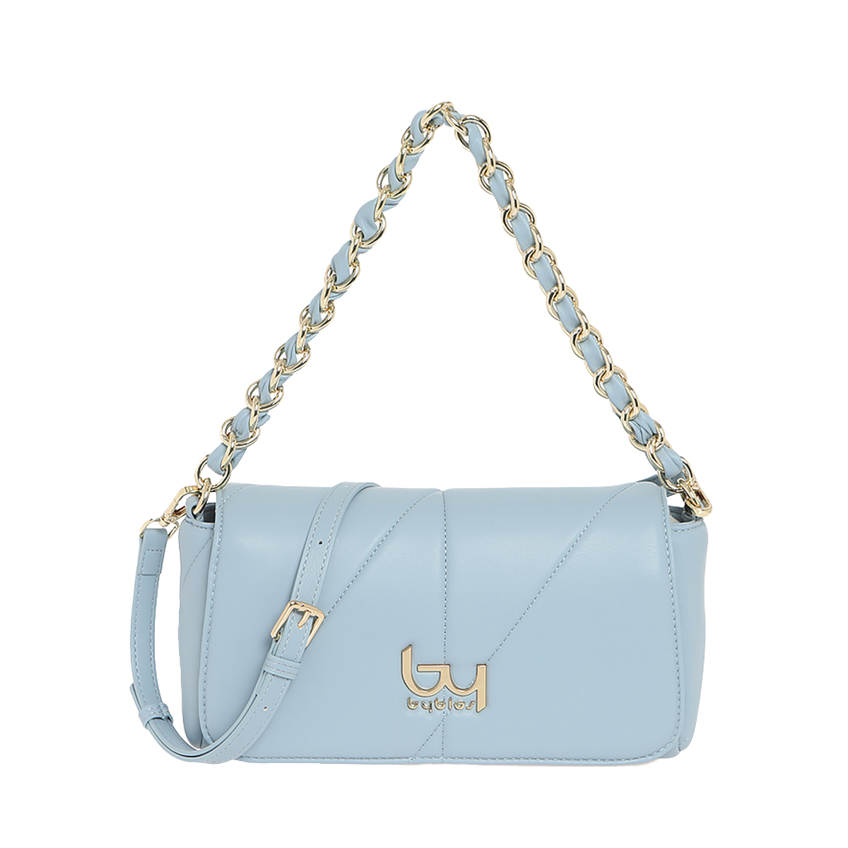 This Rocket shoulder bag by Byblos showcases a sleek, rectangular silhouette characterized by its padded construction and decorative diagonal stitching. The clean lines are complemented by a prominent metallic logo, reflecting a contemporary approach to accessory design.