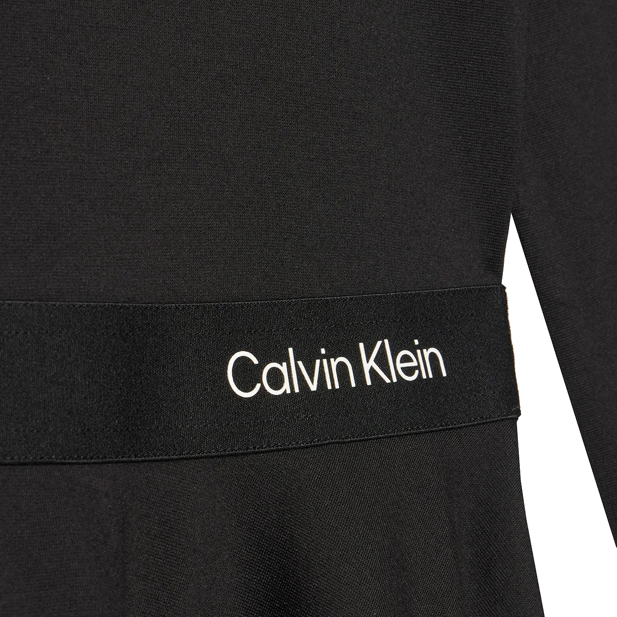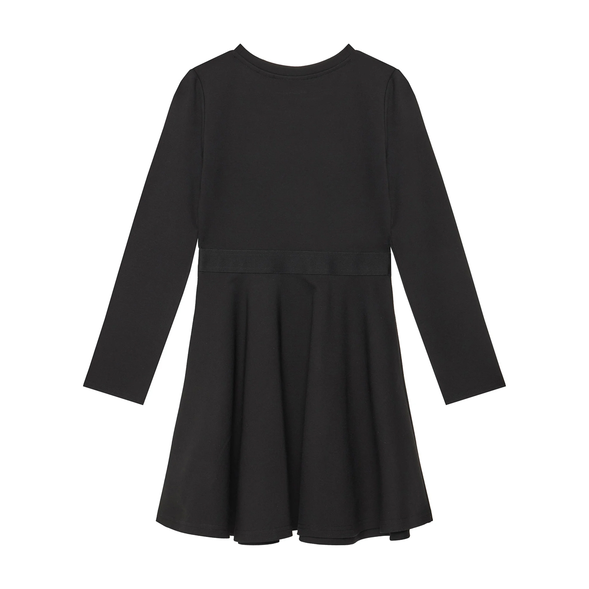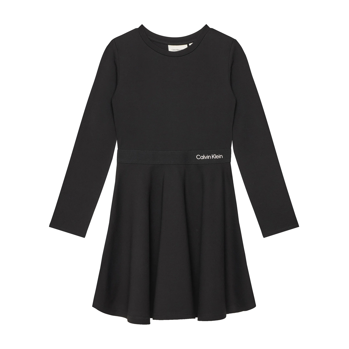 This dress LS LOGO TAPE PUNTO DRESS by CALVIN KLEIN is crafted with a focus on textile innovation and timeless shape. The garment features a classic round neckline and long sleeves, providing a refined silhouette that works effectively for diverse retail environments. The waist is accented by a branded tape that breaks the solid surface with a touch of modern identity, adding a graphic element to the flared skirt.