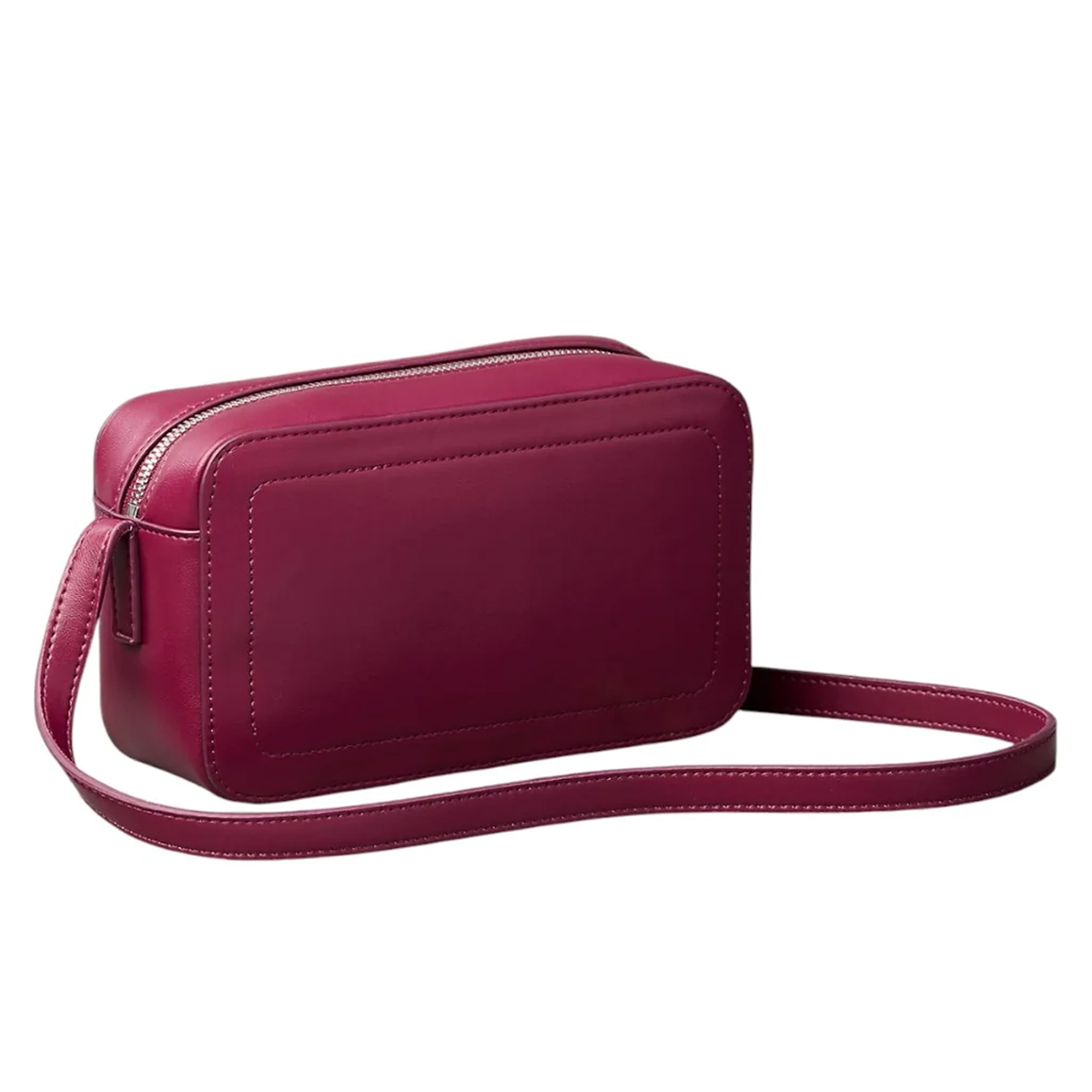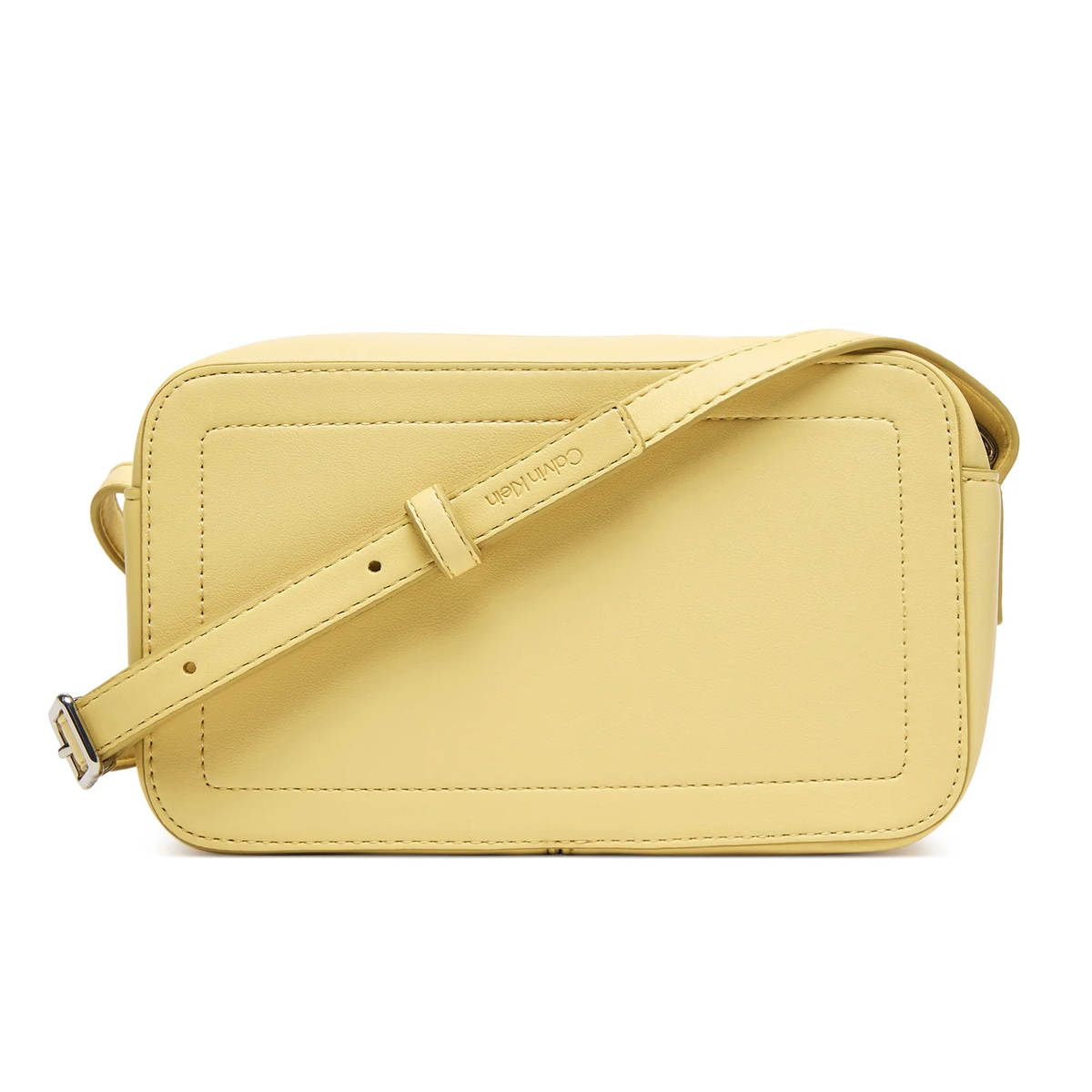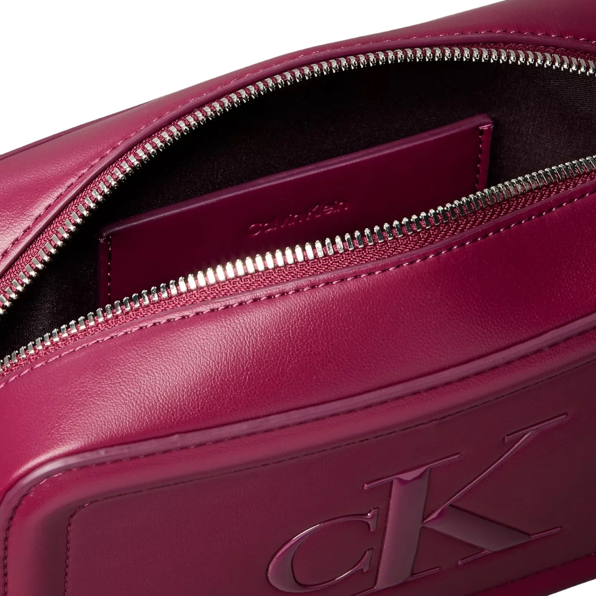 Sleek polyurethane provides a sturdy foundation for this CALVIN KLEIN camera bag. The construction highlights a padded rectangular border that adds depth to the front face. At the center, a tonal monogram logo creates a subtle visual focal point without disrupting the monochrome aesthetic. A metallic zipper runs across the top, revealing a practical interior space. Measuring 20 centimeters in width, the bag maintains a structured form that resists losing its shape. The slender strap integrates into the sides for a streamlined look.