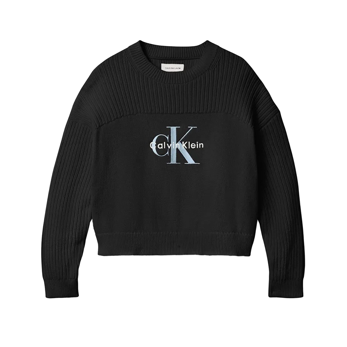 This MAGLIA MONOLOGO CN SWEATER by CALVIN KLEIN is a premium knitwear piece that prioritizes tactile variation through its expert construction. The garment features a prominent ribbed pattern across the yoke and sleeves, providing a visual and physical contrast to the smooth jersey knit of the torso. A central embroidered logo provides a signature finish to the dropped-shoulder silhouette.