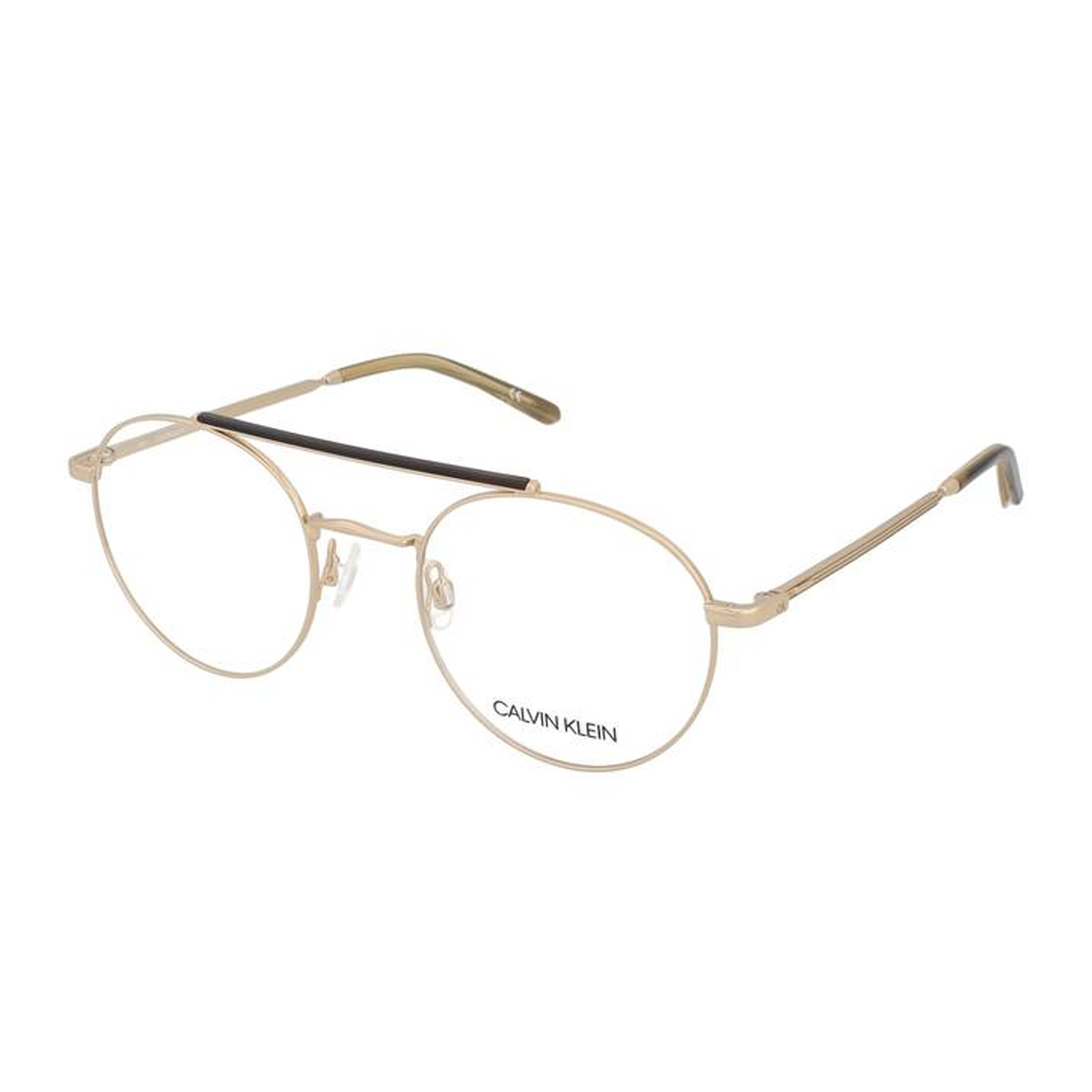 These CALVIN KLEIN eyewear frames showcase a meticulous metal construction, defined by a 53mm lens diameter and a 19mm bridge width. The frame architecture utilizes a sophisticated double-bridge layout, featuring a textured horizontal bar that reinforces the upper rim. Slim temples provide a streamlined profile, transitioning smoothly into curved tips for a secure and comfortable fit.