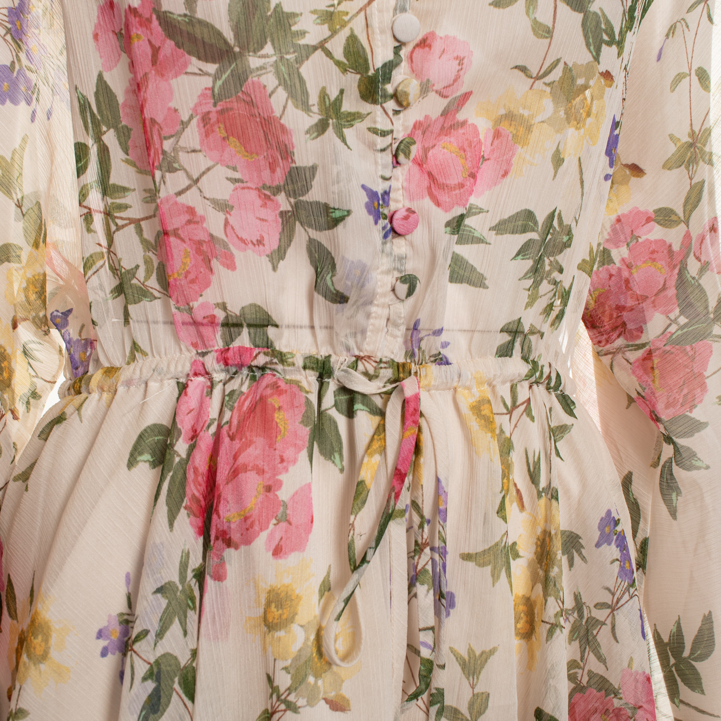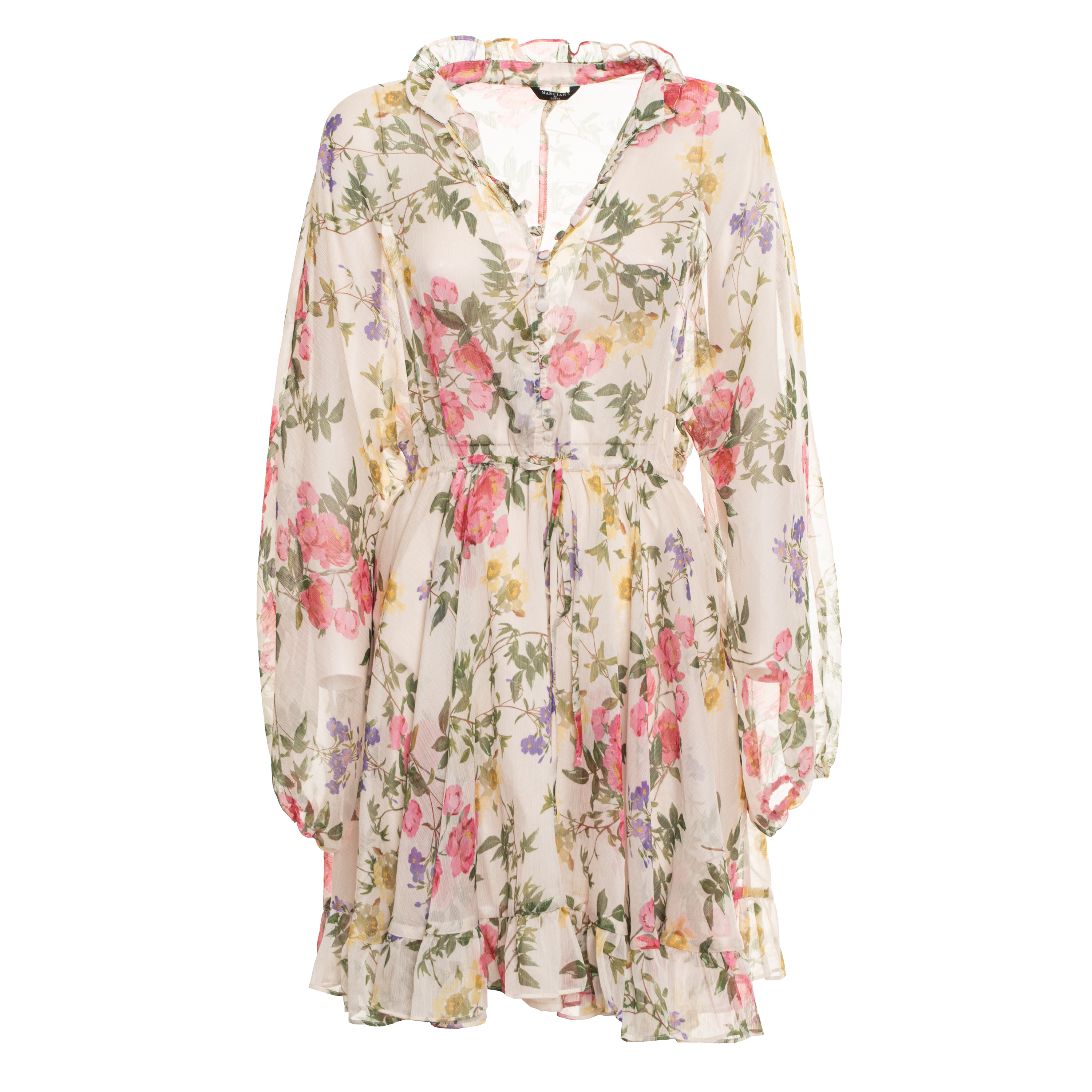 SHORT DRESS, FOR WOMEN, V-NECK, LONG SLEEVES, FLORAL PATTERN, MULTICOLOR, WITH LOGO, BUTTON CLOSURE