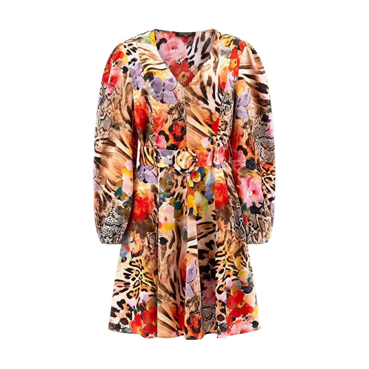 SHORT DRESS, FOR WOMEN, V-NECK, LONG SLEEVES, MULTICOLOR, WITH LOGO, WITH BELT