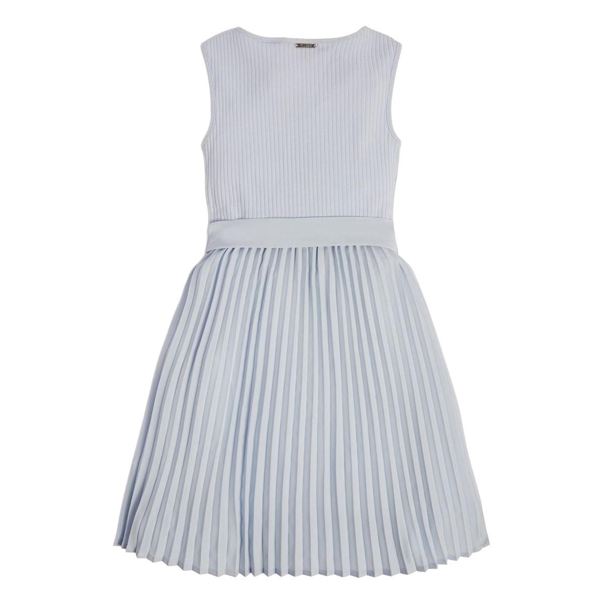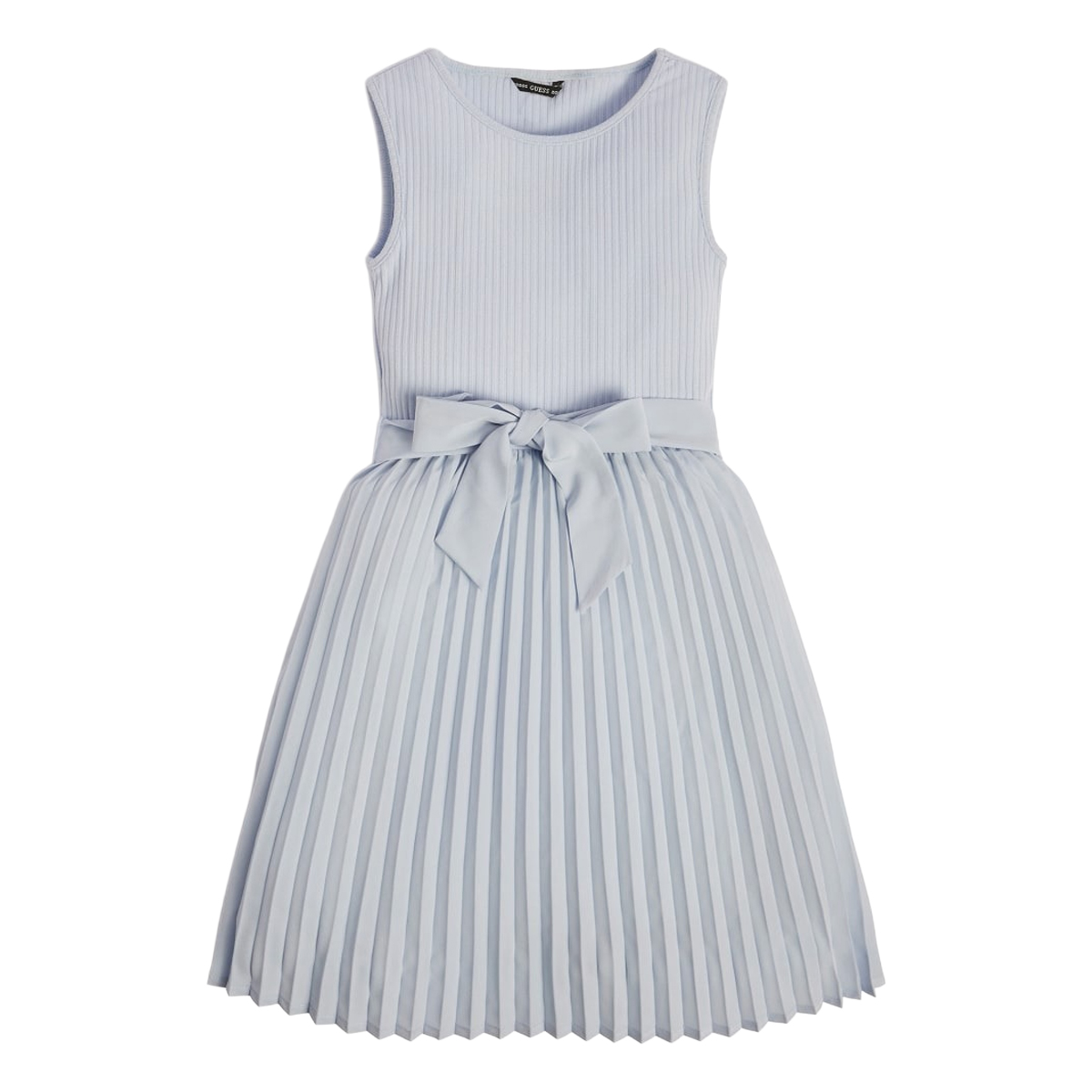 This SL ERYNN PLEATED DRESS_MINI ME by GUESS is a refined sleeveless garment featuring a striking contrast between its textures. The upper section is defined by a vertically ribbed bodice that provides a snug fit, leading down to a voluminous skirt with crisp, heat-pressed pleats that offer a dynamic visual rhythm.