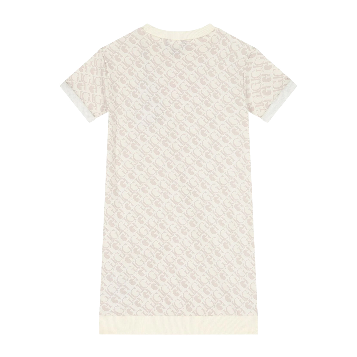 This dress FRENCH TERRY SS DRESS by GUESS is a sophisticated garment that highlights the brand's iconic logo through a refined all-over print. The construction features a straight-cut body with a relaxed fit, complemented by short sleeves with fixed turn-up cuffs and a classic ribbed crew neck. An elegant embroidered brand name across the chest provides a textural contrast against the printed background, ensuring clear brand recognition for a wholesale audience.