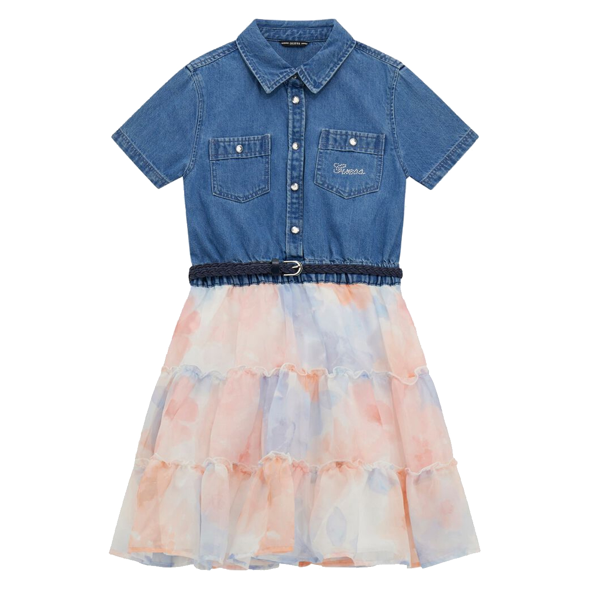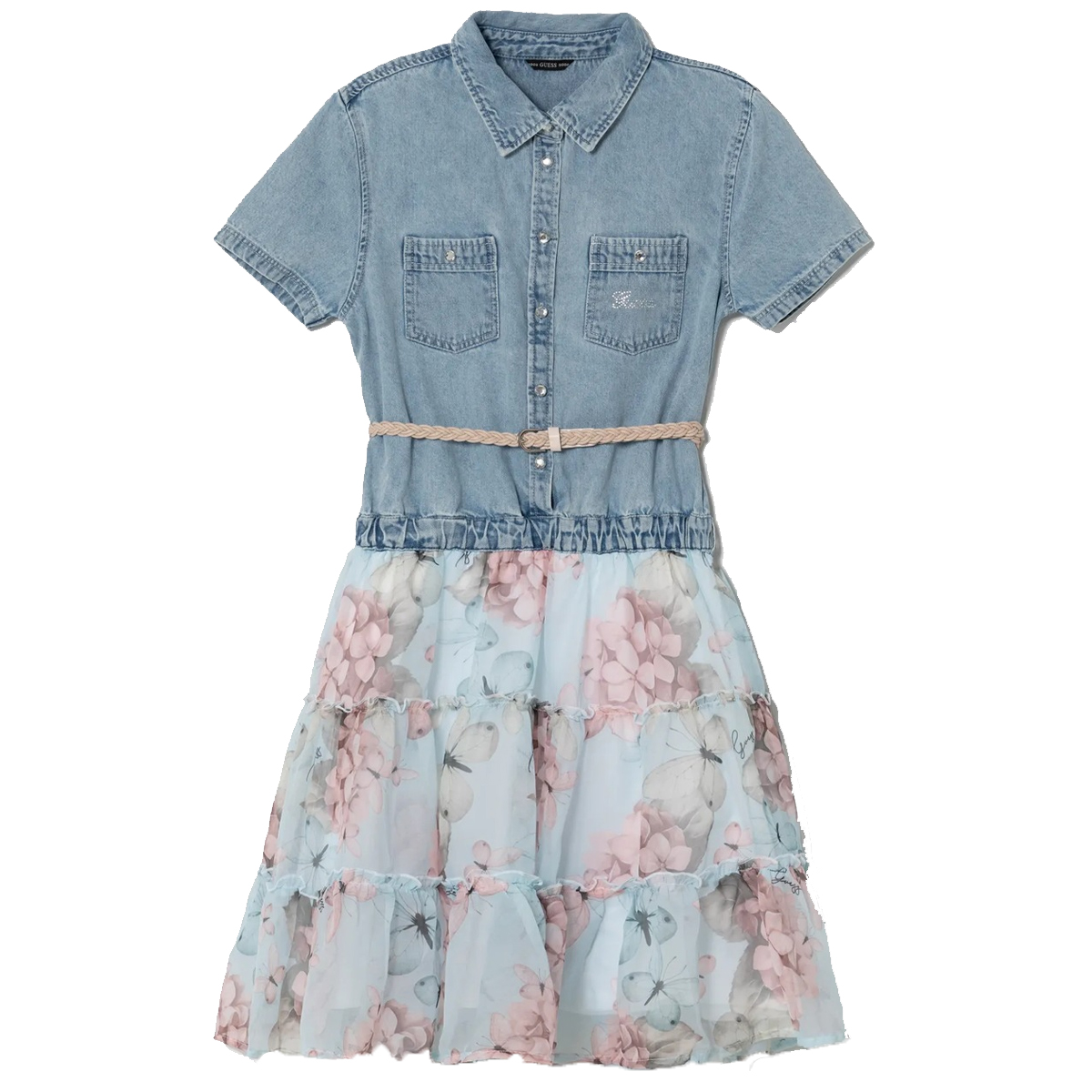 This MIXED FABRICS SS DRESS dress by GUESS offers a captivating silhouette through its distinct construction. The design features a structured denim bodice with a pointed collar and functional chest pockets, providing a crisp contrast to the light, tiered skirt. A delicate braided belt cinches the waist, allowing the flared bottom to create a graceful, airy volume that moves naturally.