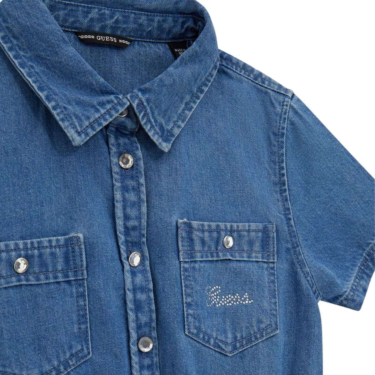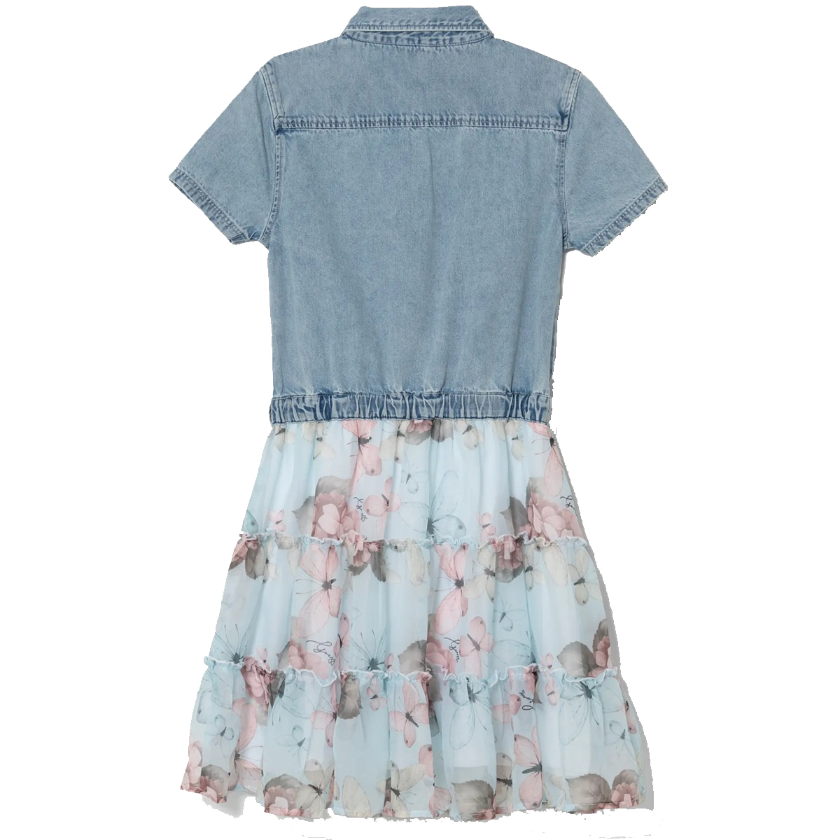 KNEE-LENGHT DRESS, DENIM DRESS, FOR GIRLS, WITH POCKET, ROUND NECK, SHORT SLEEVES, FLORAL PATTERN, MULTICOLOR, WITH LOGO, BUTTON CLOSURE, WITH BELT
