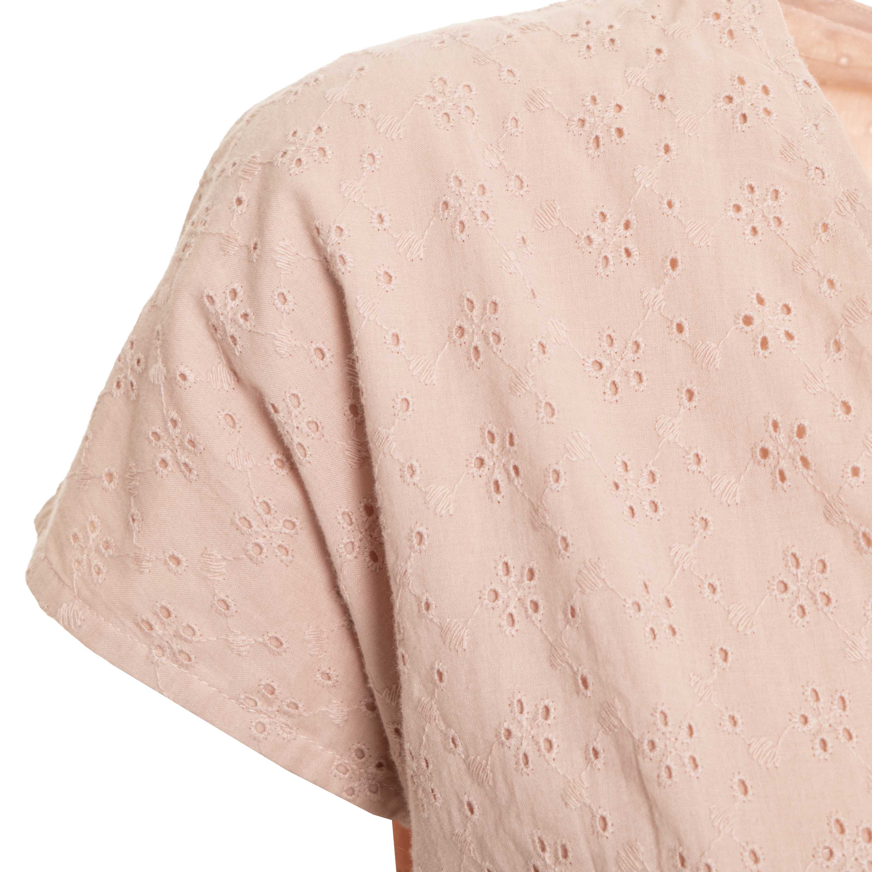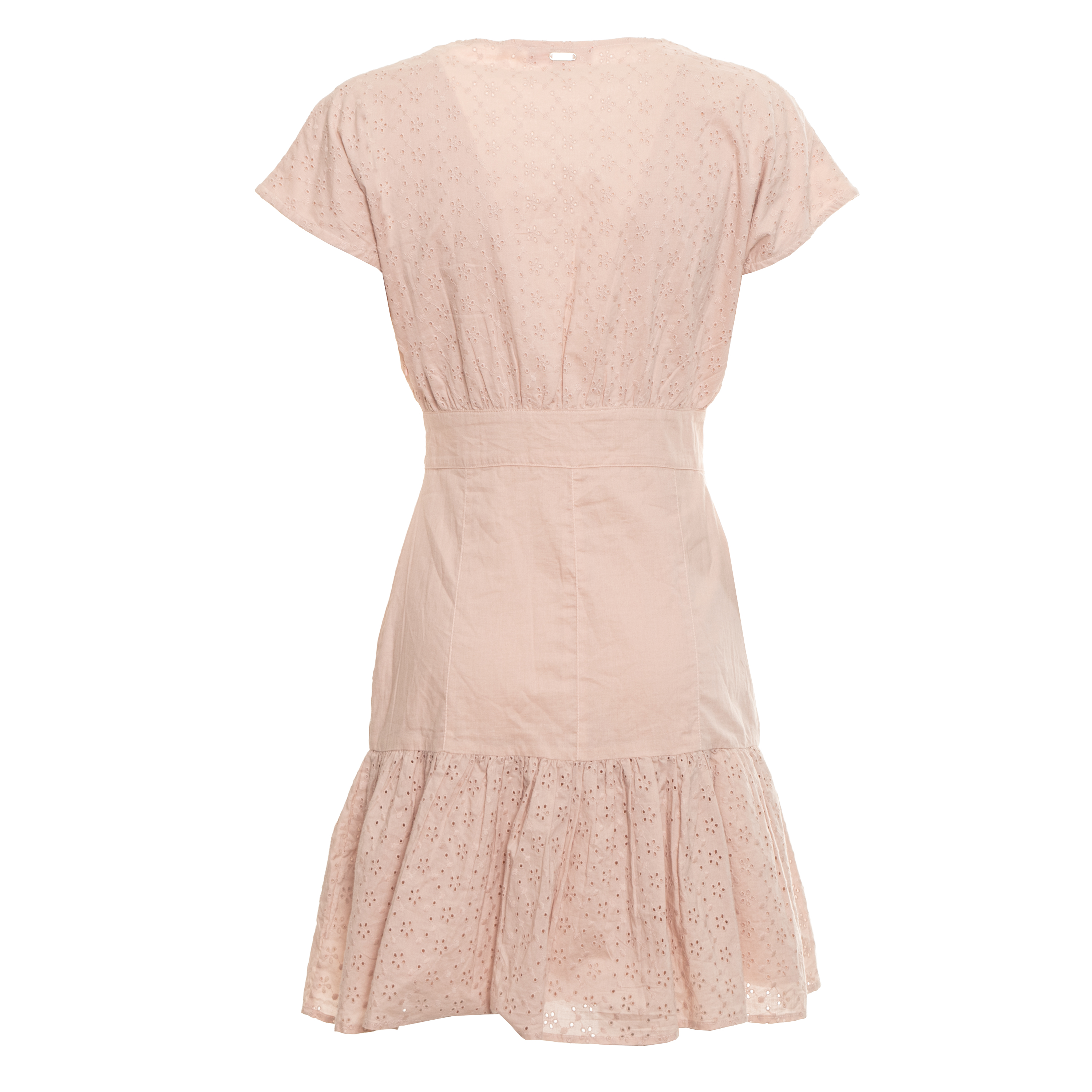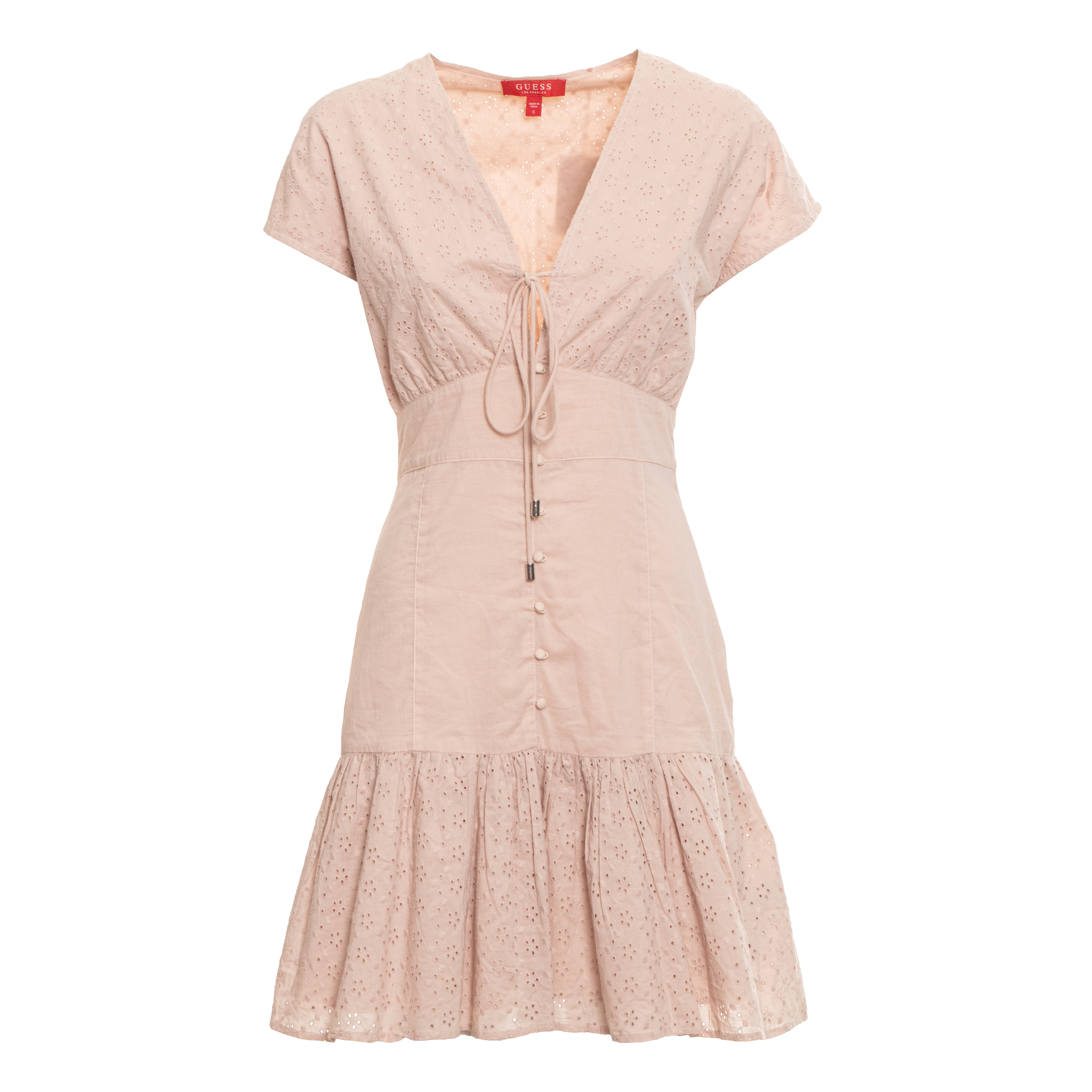 KNEE-LENGHT DRESS, FOR WOMEN, V-NECK, SHORT SLEEVES, SOLID COLOUR, WITH LOGO, BUTTON CLOSURE