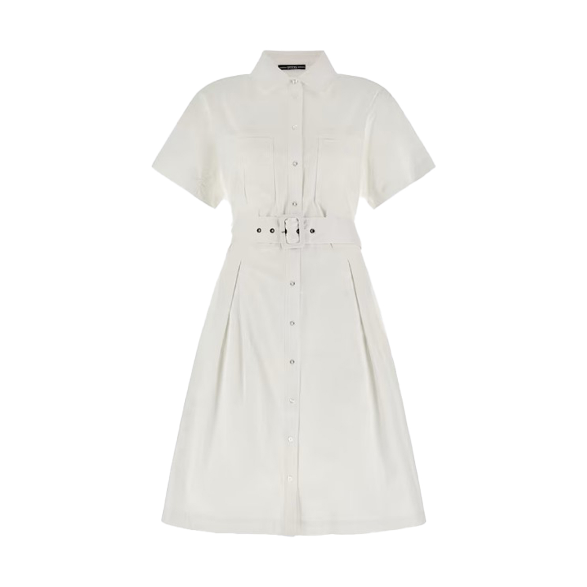KNEE-LENGHT DRESS, FOR WOMEN, SHORT SLEEVES, SOLID COLOUR, WITH BELT, BUTTONS CLOSURE
