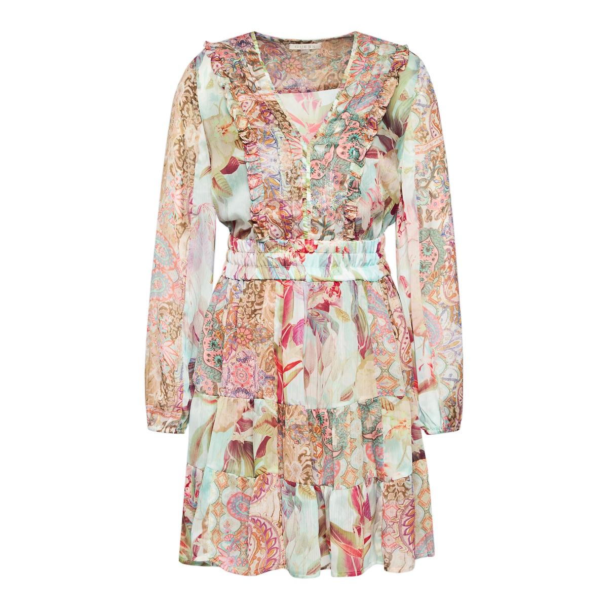 SHORT DRESS, FOR WOMEN, V-NECK, LONG SLEEVES, MULTICOLOR, WITH LOGO