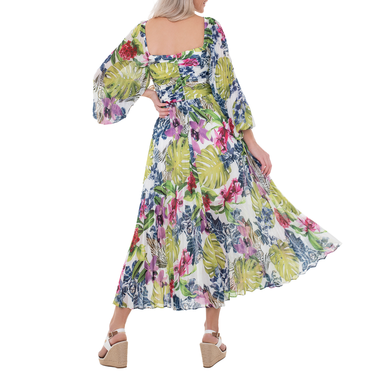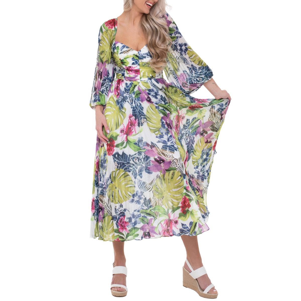 DRESS, FOR WOMEN, BOAT NECK, LONG SLEEVES, FLORAL PATTERN, WITH LOGO, ZIP CLOSURE