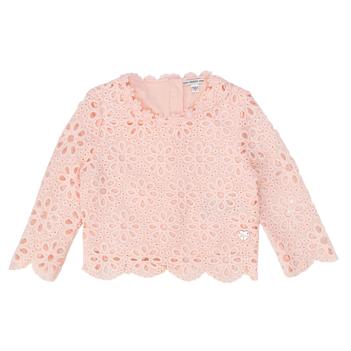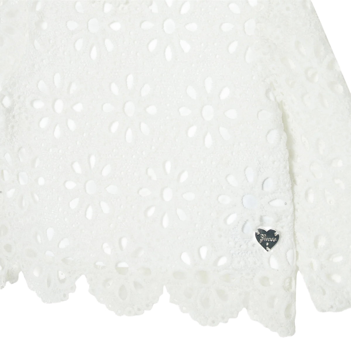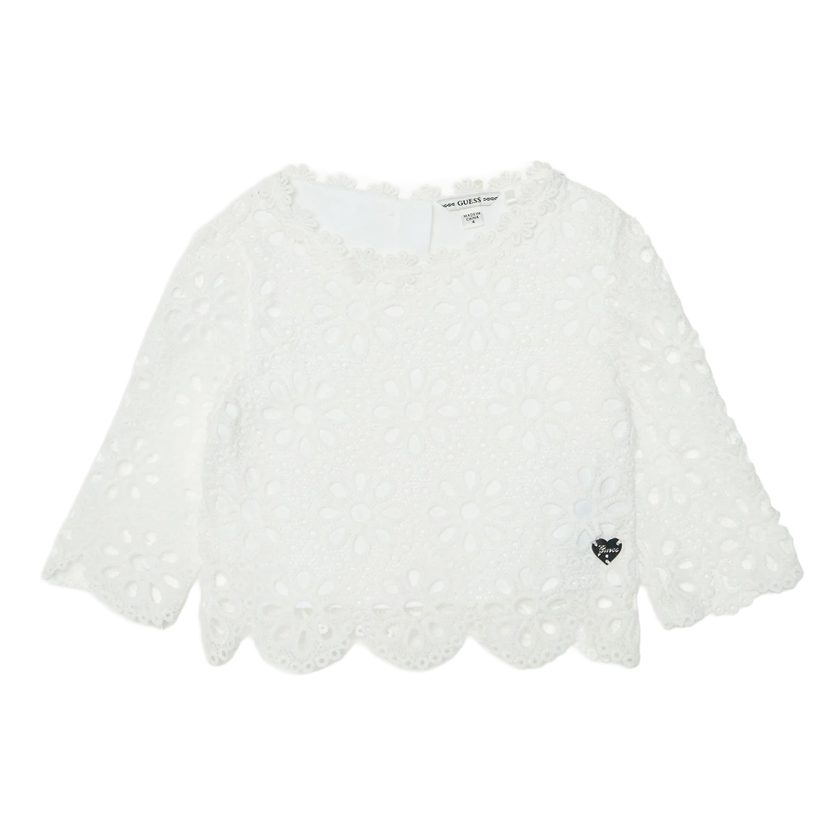 This shirt LACE 3/4S SHIRT_CEREMONY by GUESS is a garment defined by its intricate craftsmanship and geometric lace overlay. The boxy silhouette is complemented by 3/4 length sleeves, featuring a scalloped edge that mirrors the bottom hem for a cohesive aesthetic. A subtle logo charm is positioned near the waist, providing a signature touch, while the round neckline is finished with a delicate trim that follows the floral pattern of the textile.