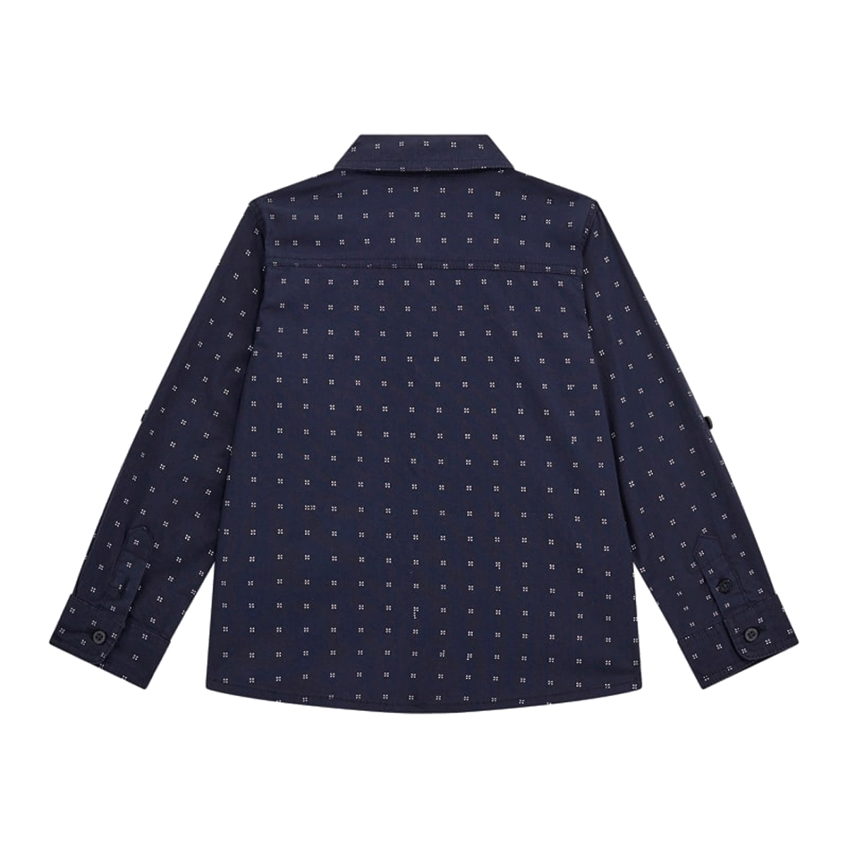 This CAMICIE POPLIN ADJ. LS SHIRT_CEREMONY by GUESS is a sharp garment showcasing a structured silhouette tailored for a polished appearance. The piece features a meticulous all-over micro-pattern that adds visual depth without overwhelming the classic design. Notable construction details include a traditional pointed collar, a full-length button placket, and functional sleeve tabs that allow for a versatile rolled-up look.
