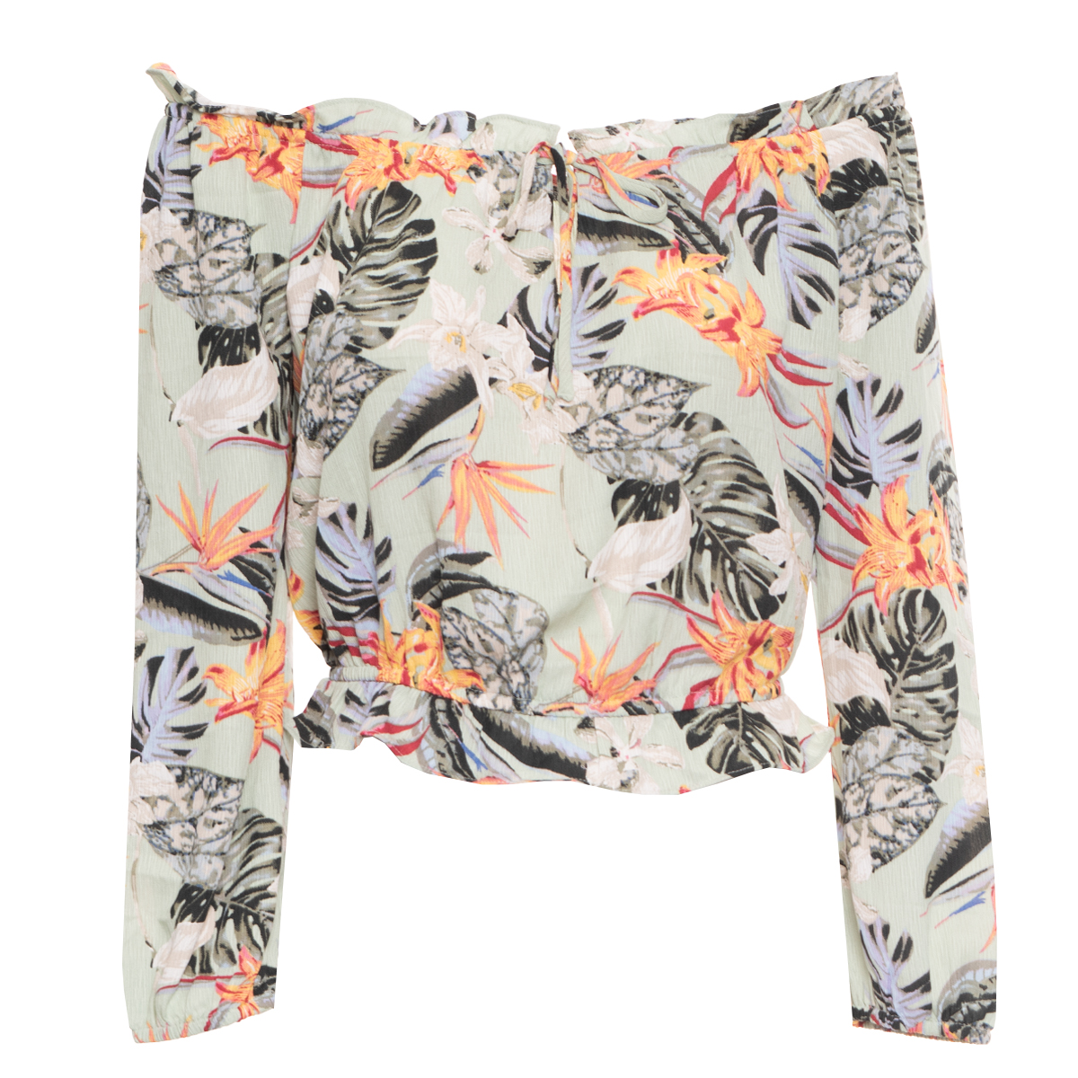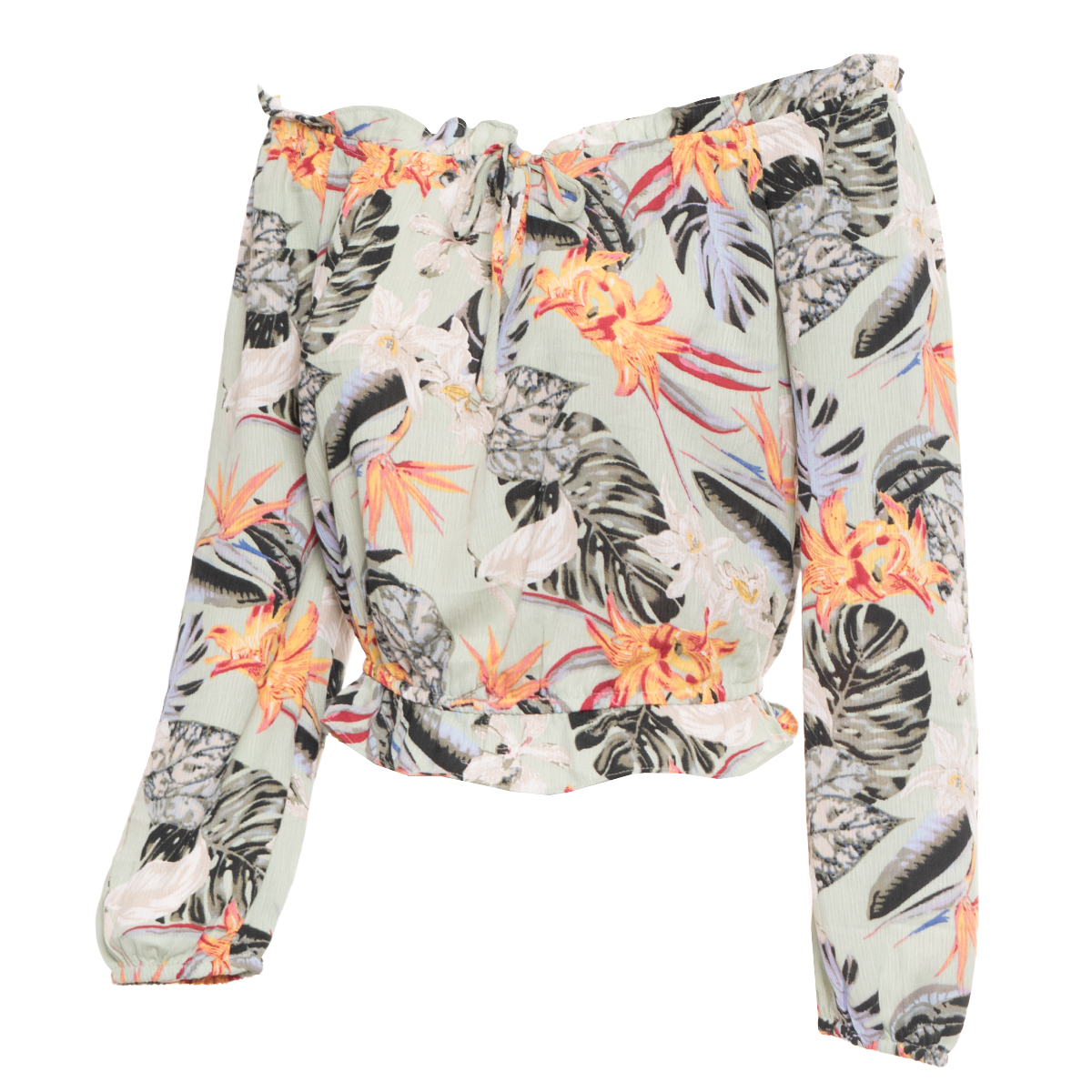 This shirt LS GALLIA OFF SHLDR TOP by GUESS is a refined garment featuring a striking off-the-shoulder neckline. The construction highlights a gathered elasticated waistline that creates a subtle ruffle at the hem, providing a fluid silhouette that moves gracefully with the wearer.