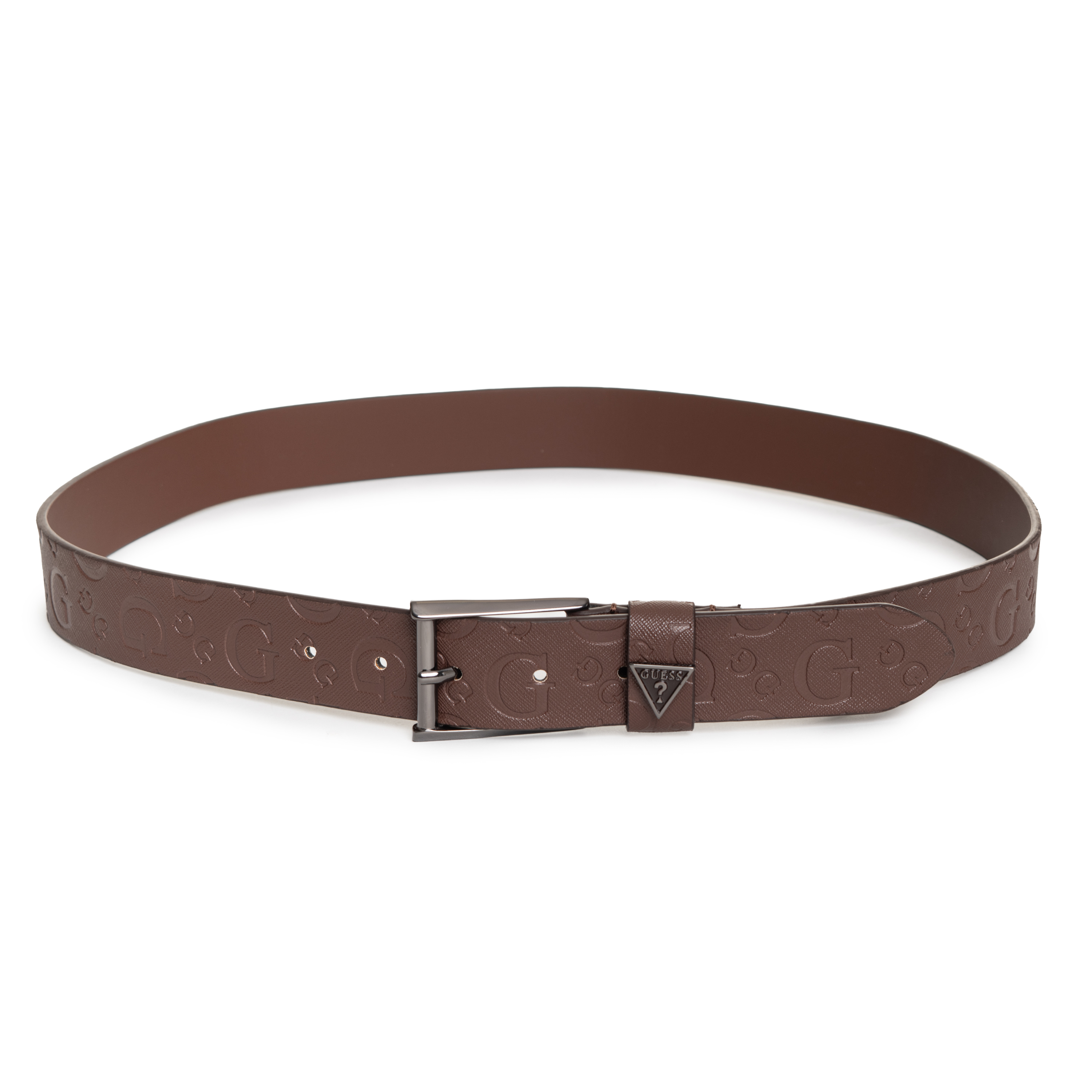 This belt BELTRAN NOT ADJ&NOT REV H35 by GUESS features a distinct all-over embossed logo pattern that provides a dynamic texture. The strap is finished with a classic metal buckle and a signature triangular logo plaque on the keeper, showcasing meticulous attention to detail. Its non-reversible construction emphasizes a solid, high-quality build.