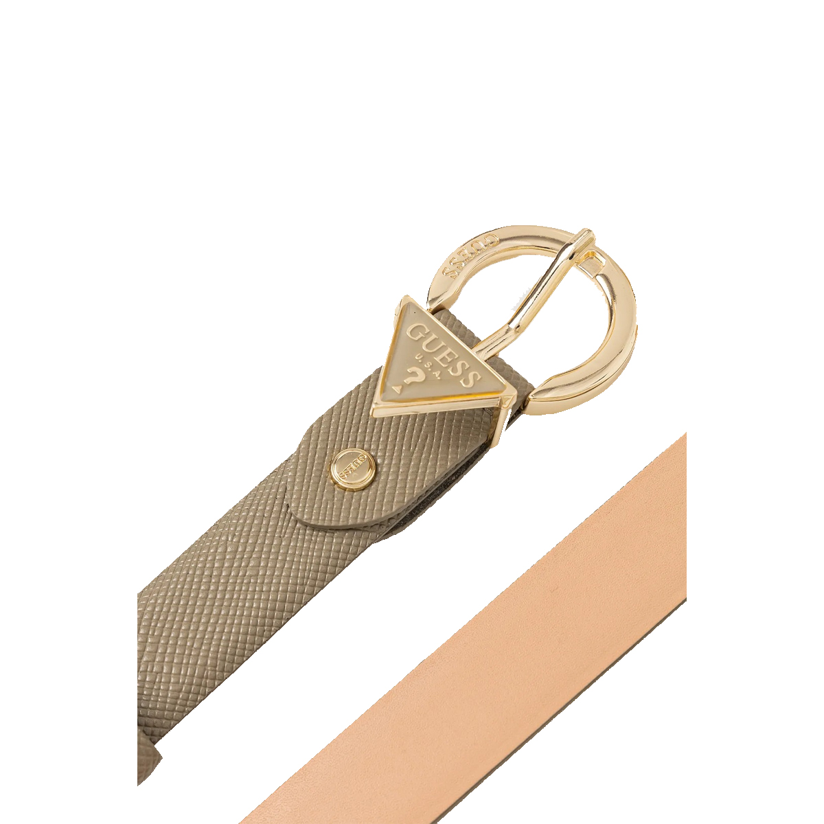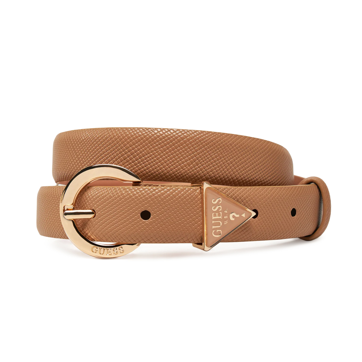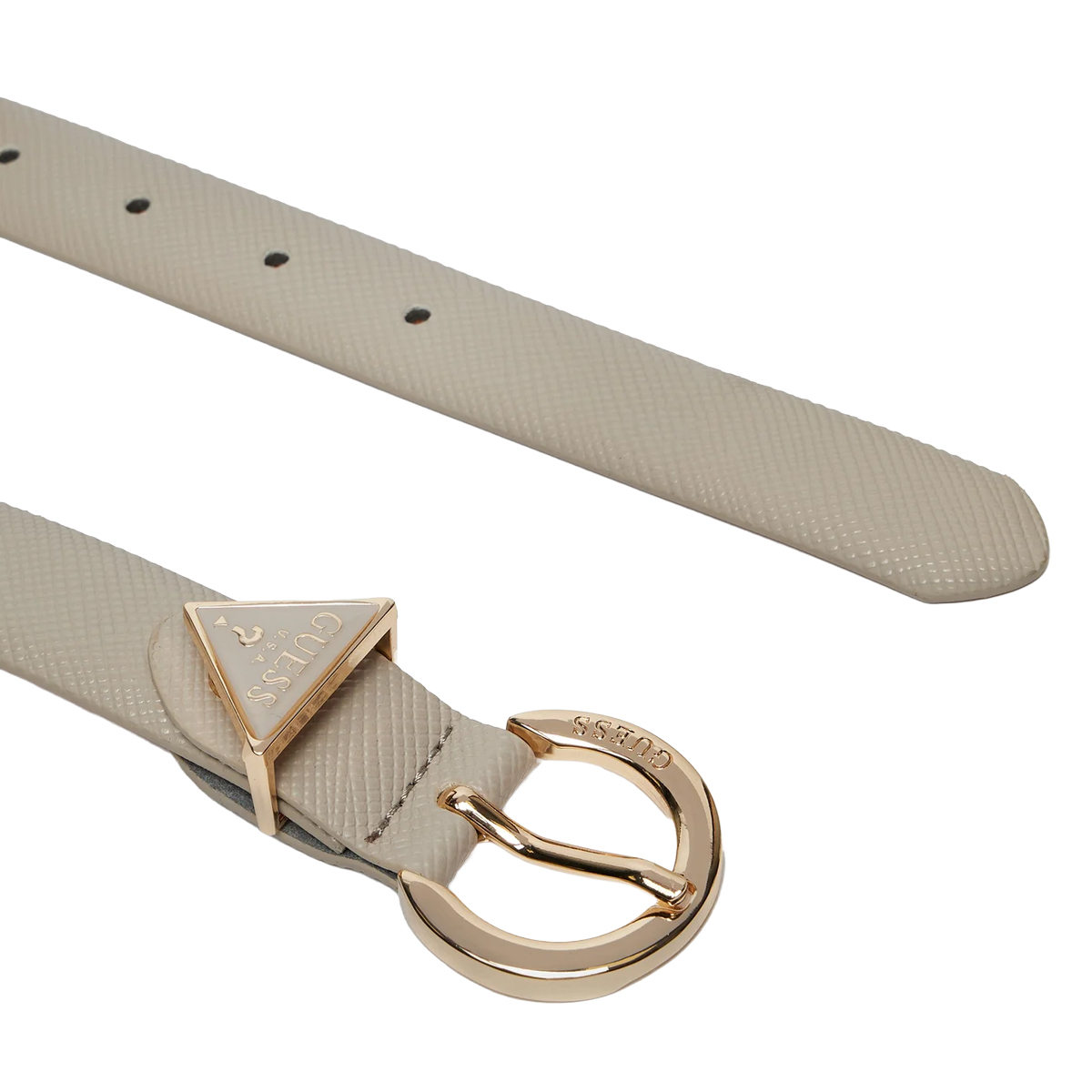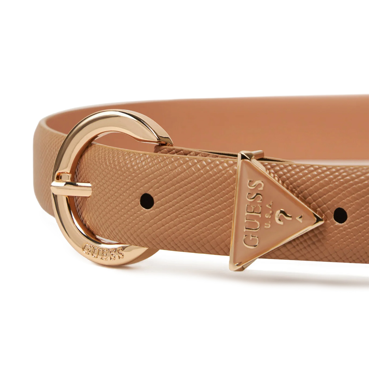 This NOELLE ADJ PANT BELT H25 belt by GUESS is a study in structural resilience and modern branding. The design features a circular pin buckle and a distinctive triangular logo plaque at the tip, creating a balanced visual flow along the strap. Its surface displays a cross-hatched texture that provides a sophisticated tactile experience while ensuring a non-slip grip when fastened through the loops.