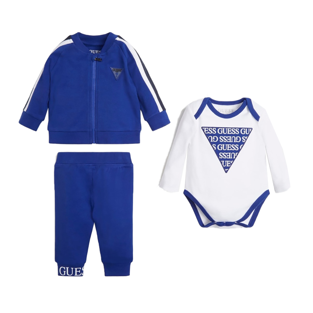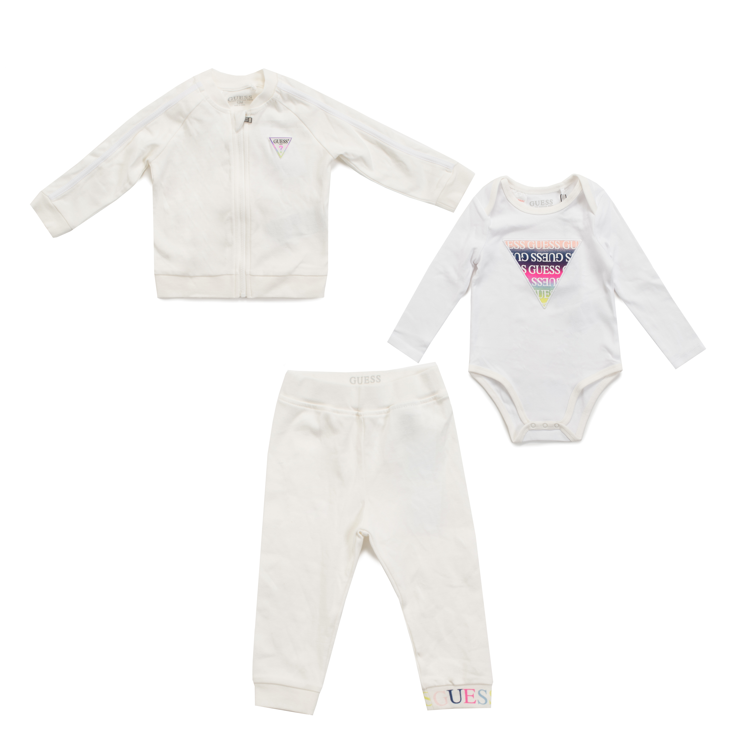 This outfit SET LS ACTIVE TOP+LS BODY+PANT by GUESS is a coordinated ensemble featuring a streamlined silhouette designed for effortless movement. The zip-up outer layer is defined by its clean lines and ribbed finishes on the cuffs and hem, complemented by a long-sleeved base layer and trousers with a precise, tapered cut that provides a secure fit.