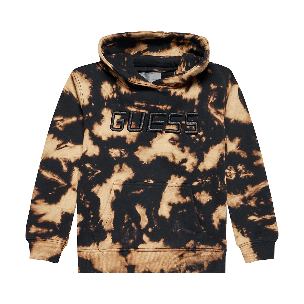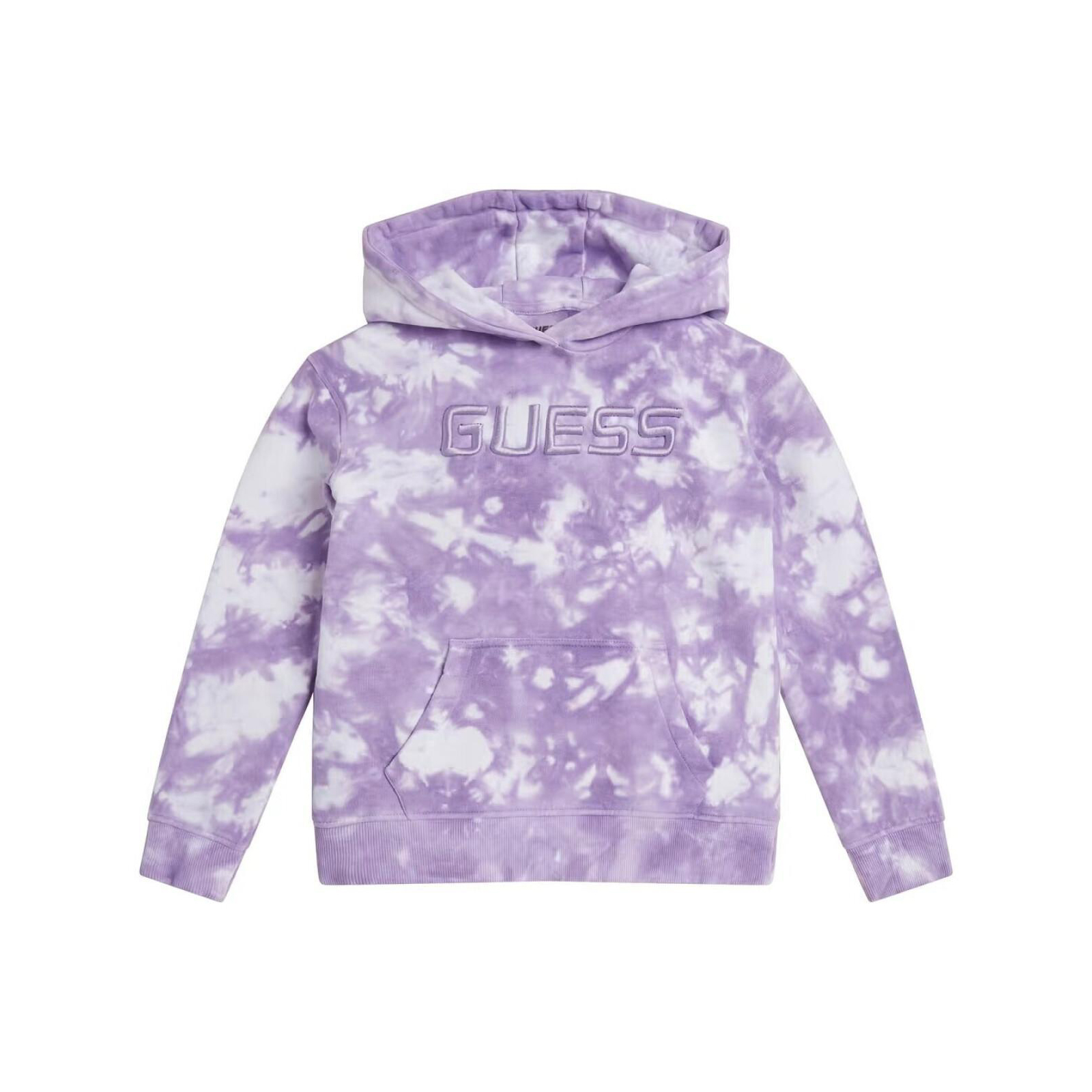 This hoodie TIE DYE HOODED ACTIVE TOP by GUESS is a contemporary garment featuring a relaxed silhouette and a bold visual impact. The boxy cut provides a comfortable fit, complemented by the wide kangaroo pocket and robust ribbed finishes at the waist and sleeves. A thick, textured logo application across the chest emphasizes the iconic identity of the brand, creating a professional look for B2B collections.