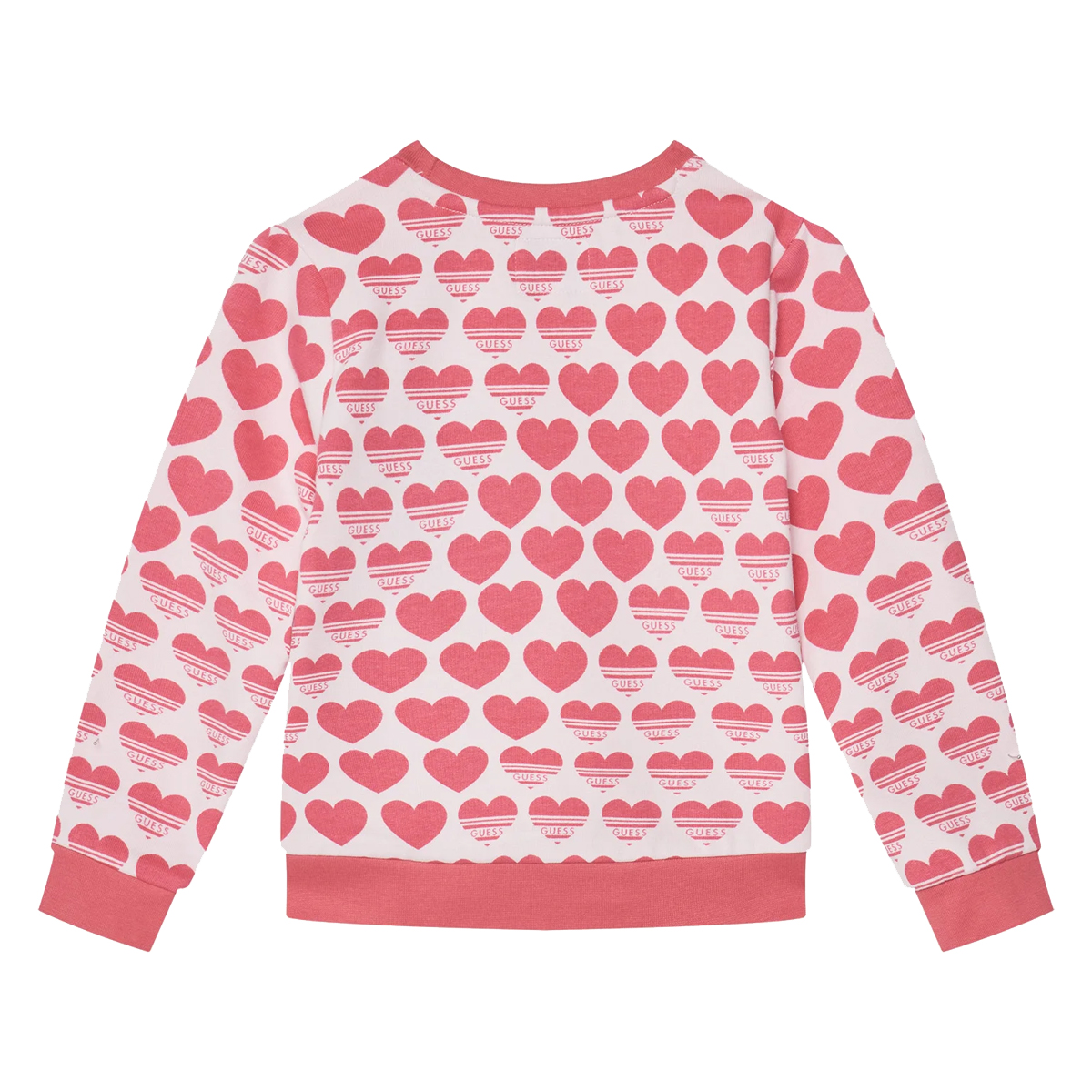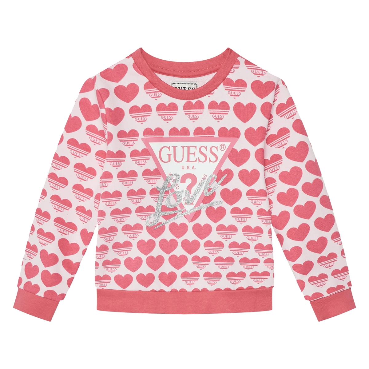 This sweatshirt LS ACTIVE TOP by GUESS is a striking example of expressive design merged with athletic-inspired comfort. The garment features an extensive heart pattern and a prominent glitter-accented logo on the chest, creating a vibrant visual identity that appeals to contemporary retail selections. The crew neck silhouette and long sleeves provide a classic foundation for the bold graphic elements, ensuring the piece remains a versatile staple in any commercial collection.
