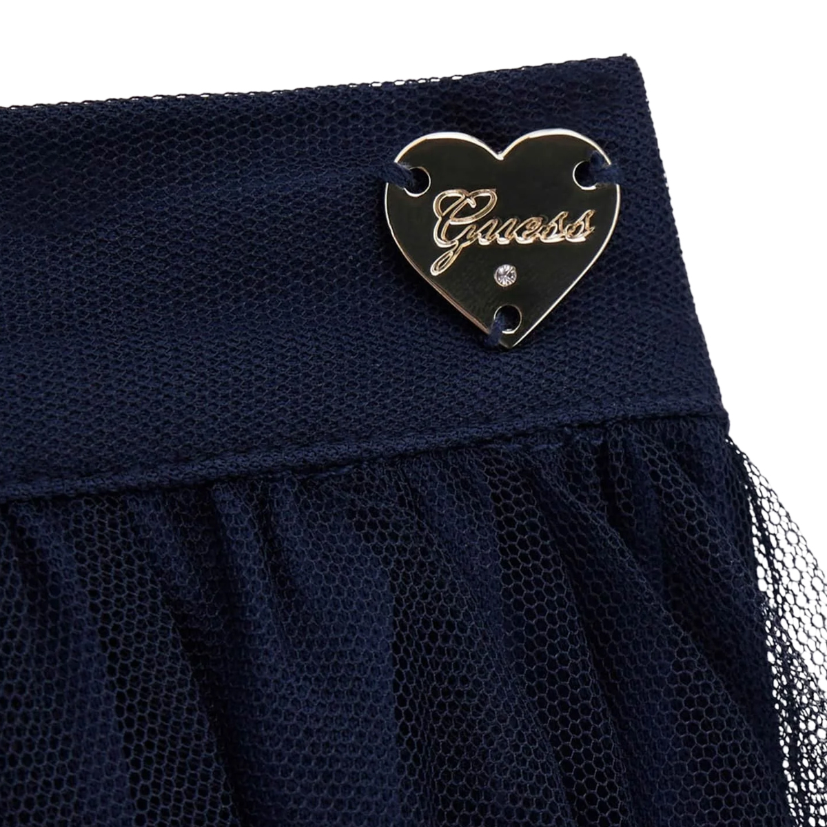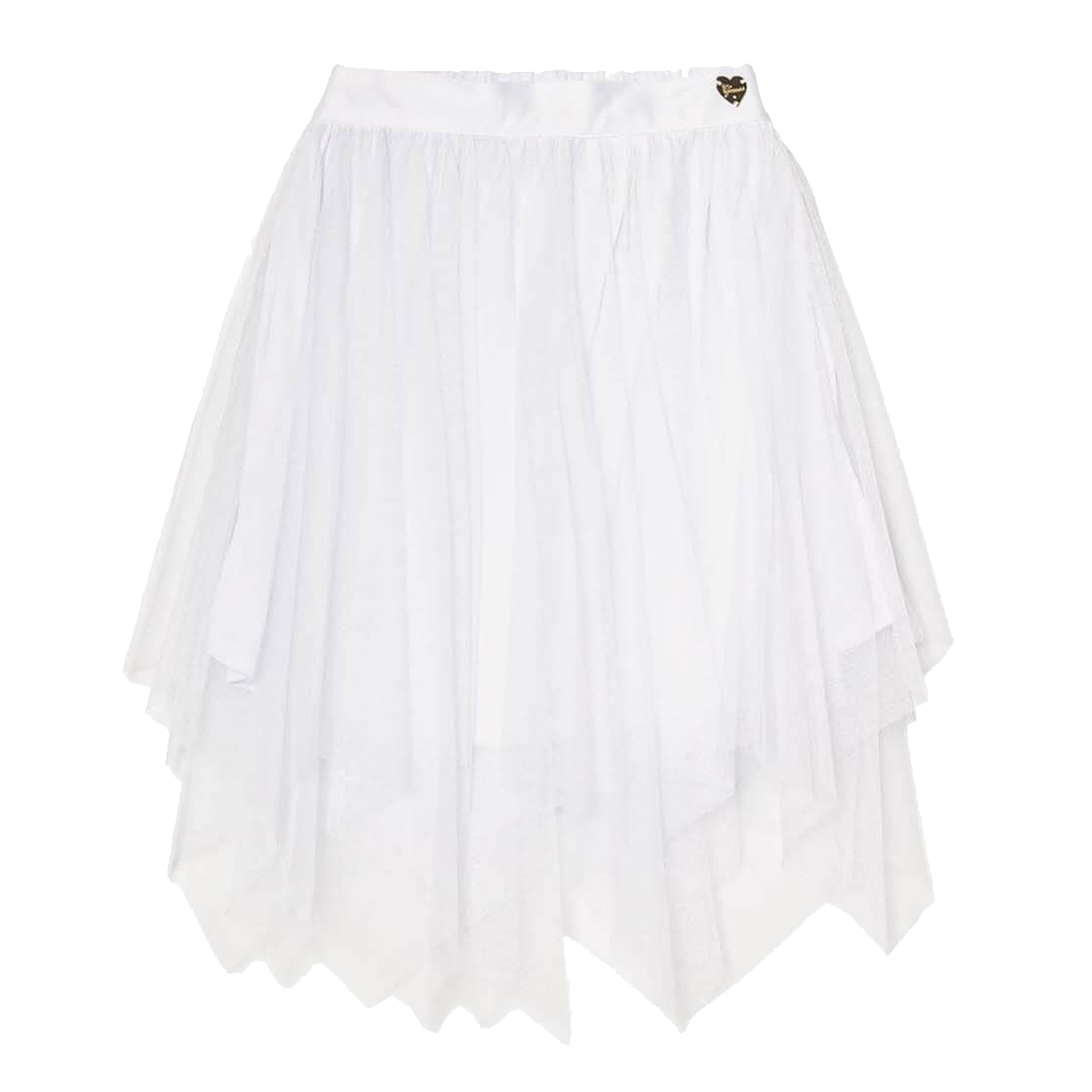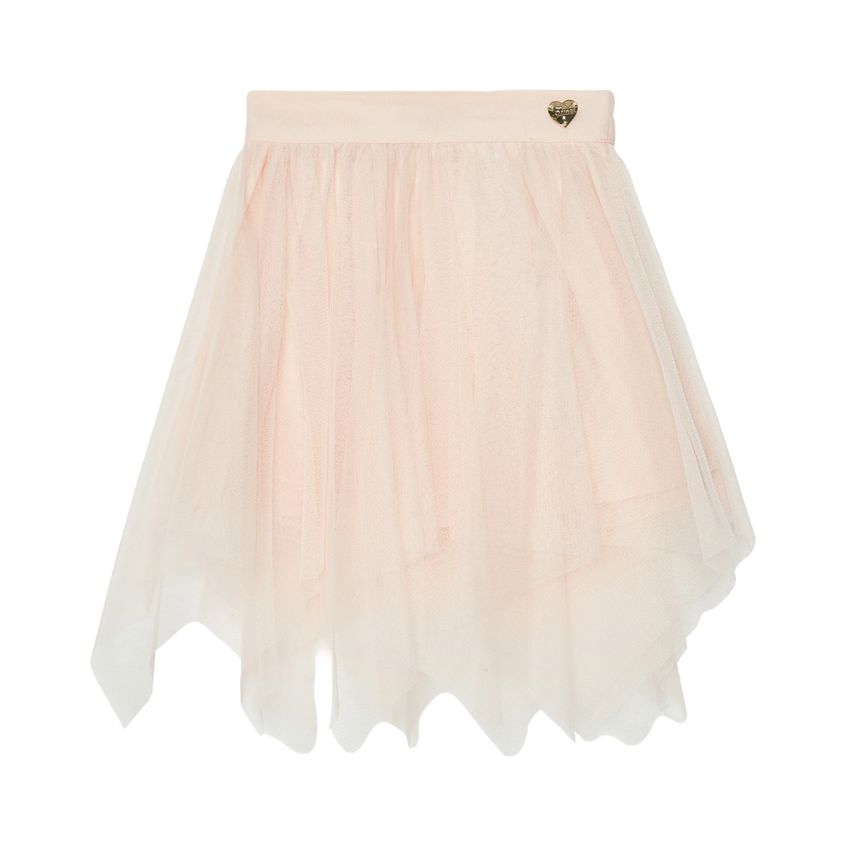 This skirt MESH MINI SKIRT_CEREMONY by GUESS is a masterclass in asymmetrical design and textile layering. The silhouette is defined by multiple mesh panels cut at varying angles, resulting in a dramatic handkerchief hemline that flows with every movement. A clean, structured waistband provides a sharp contrast to the voluminous lower half, accented by a signature metallic heart charm that underscores the brand's attention to detail.