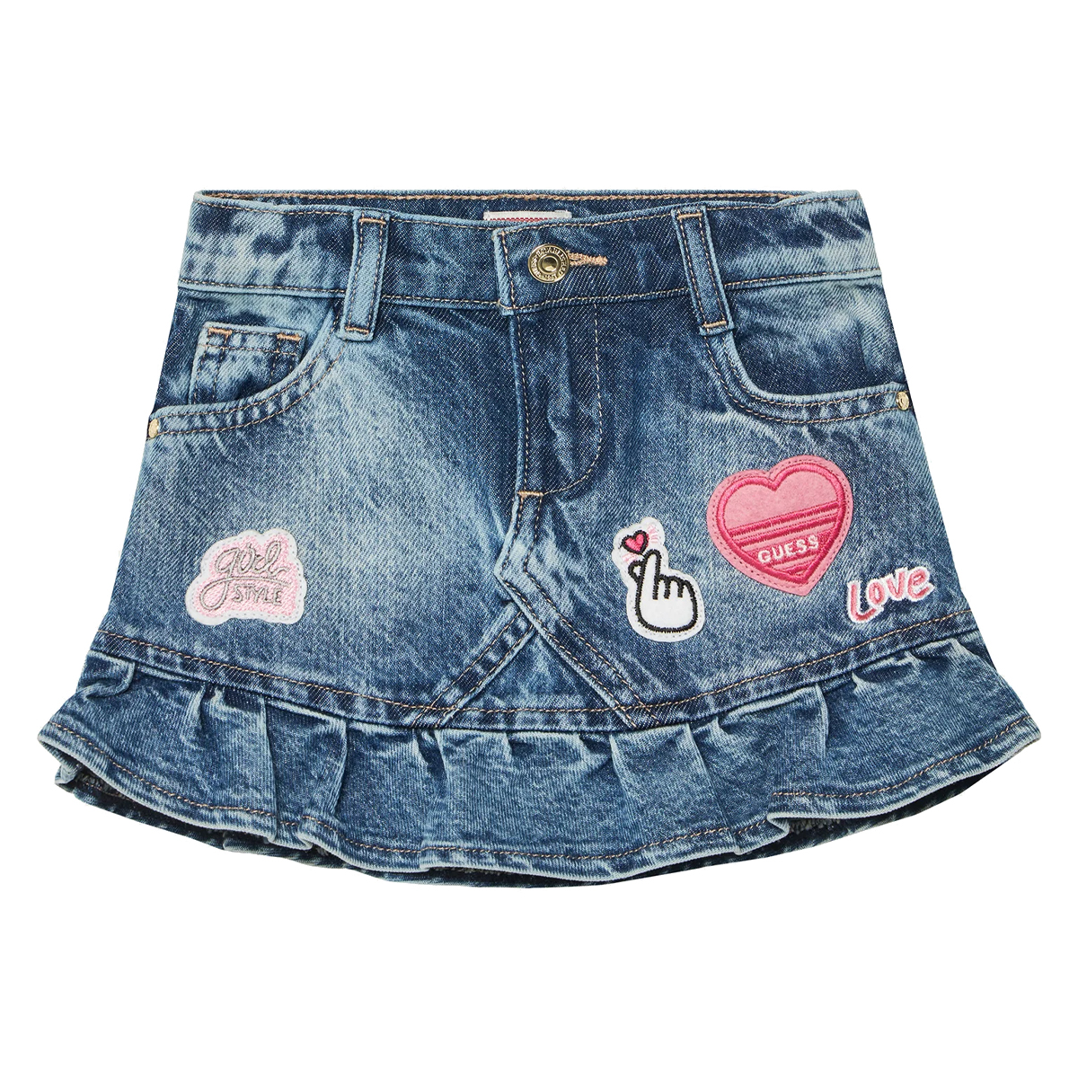 This skirt RIGID DENIM SKIRT by GUESS is a meticulously crafted garment featuring a classic five-pocket construction and unique decorative elements. The design is characterized by its structured silhouette and the addition of a pleated flounce at the hemline, which provides a dynamic volume. Decorative patches on the front reflect the brand's attention to detail and creative spirit.