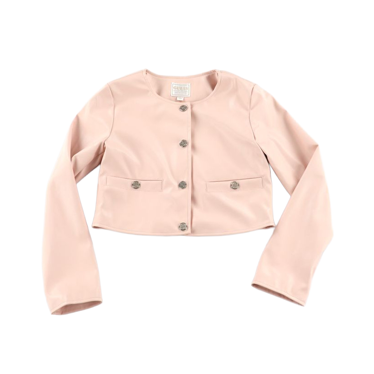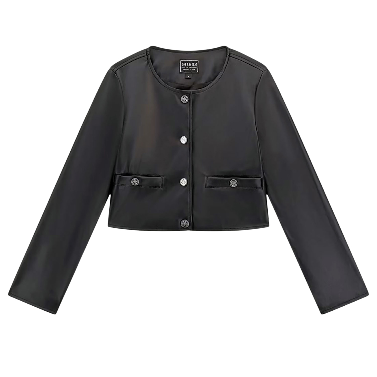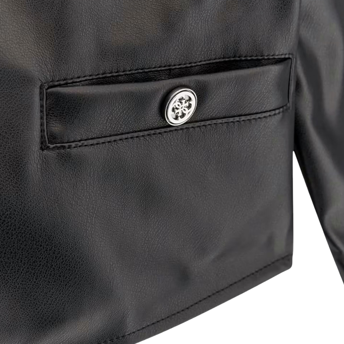 This PU LEATHER LS JACKET_CEREMONY jacket by GUESS is characterized by its sharp, cropped silhouette and minimalist collarless design. The front closure features four signature metallic buttons, reflecting the brand's attention to decorative hardware and structural precision.