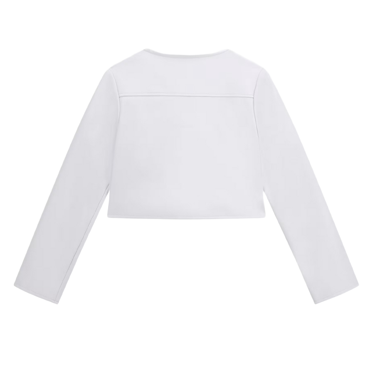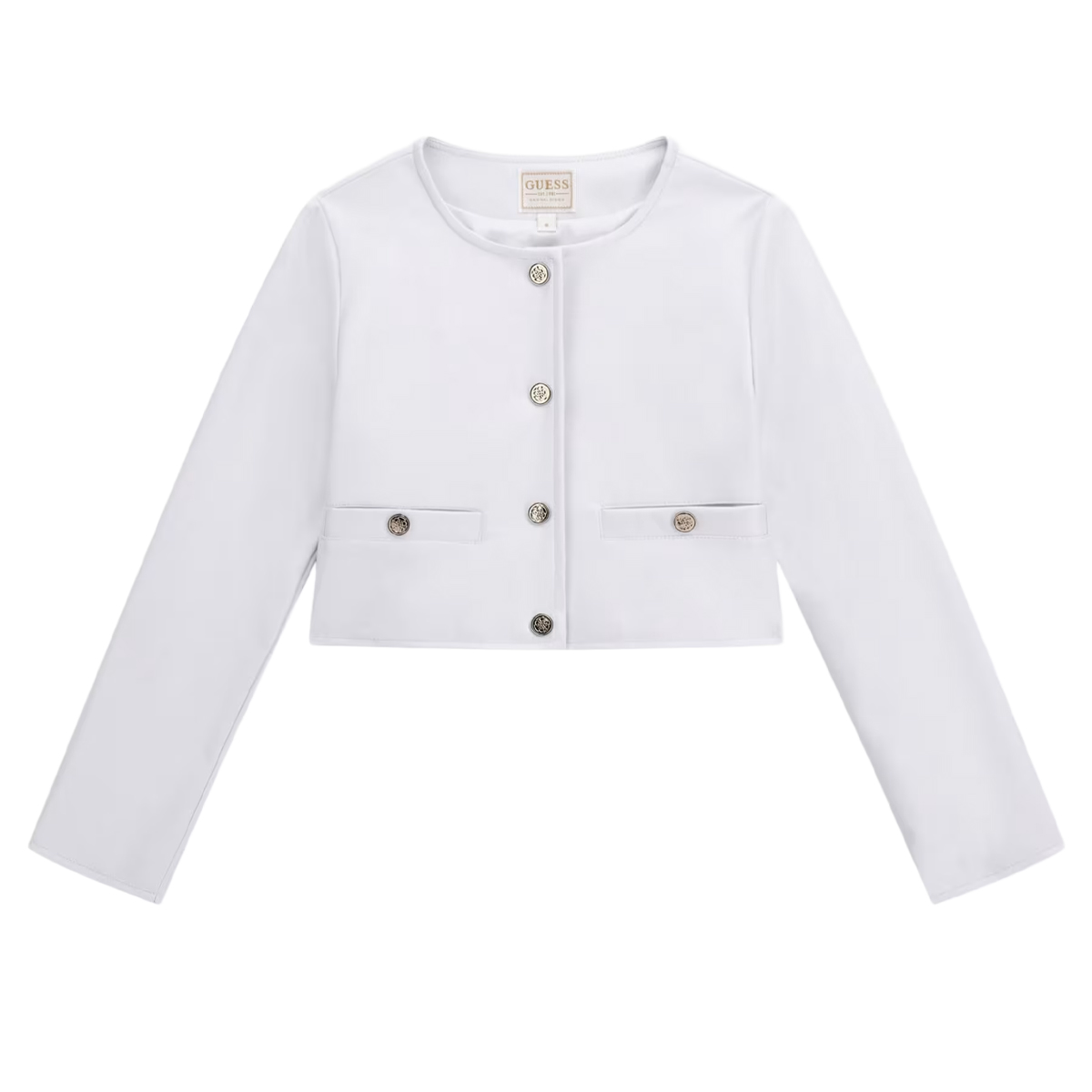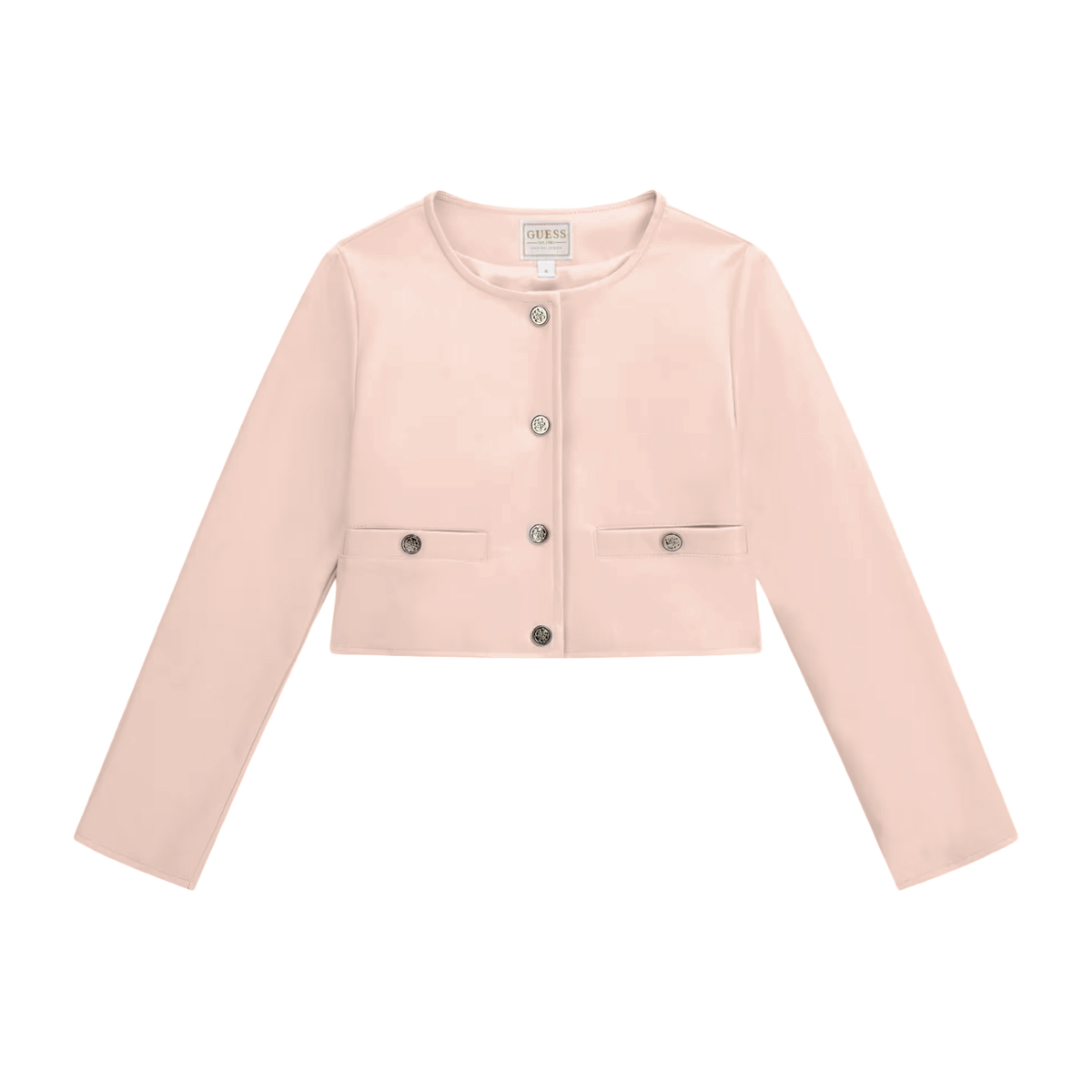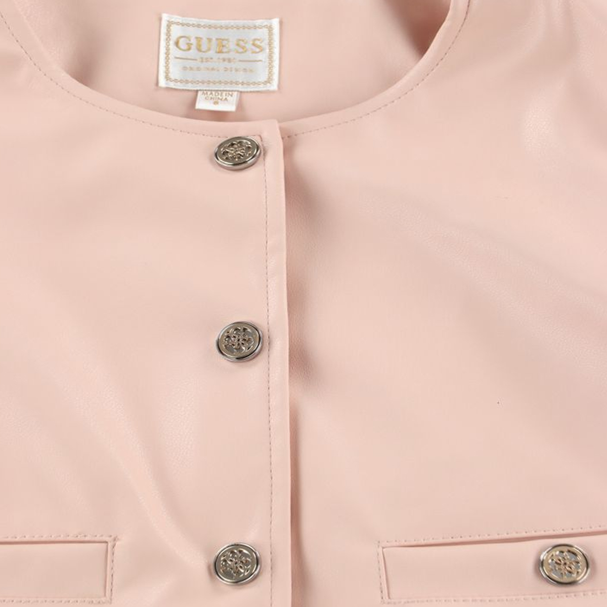 This PU LEATHER LS JACKET_CEREMONY jacket by GUESS is characterized by its sharp, cropped silhouette and minimalist collarless design. The front closure features four signature metallic buttons, reflecting the brand's attention to decorative hardware and structural precision.