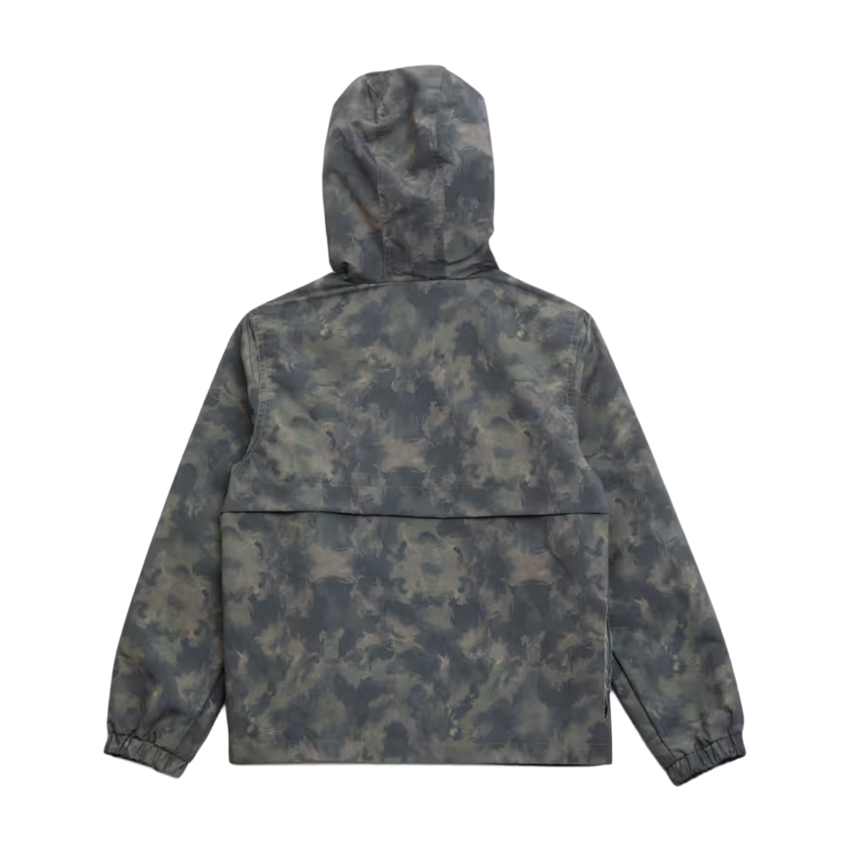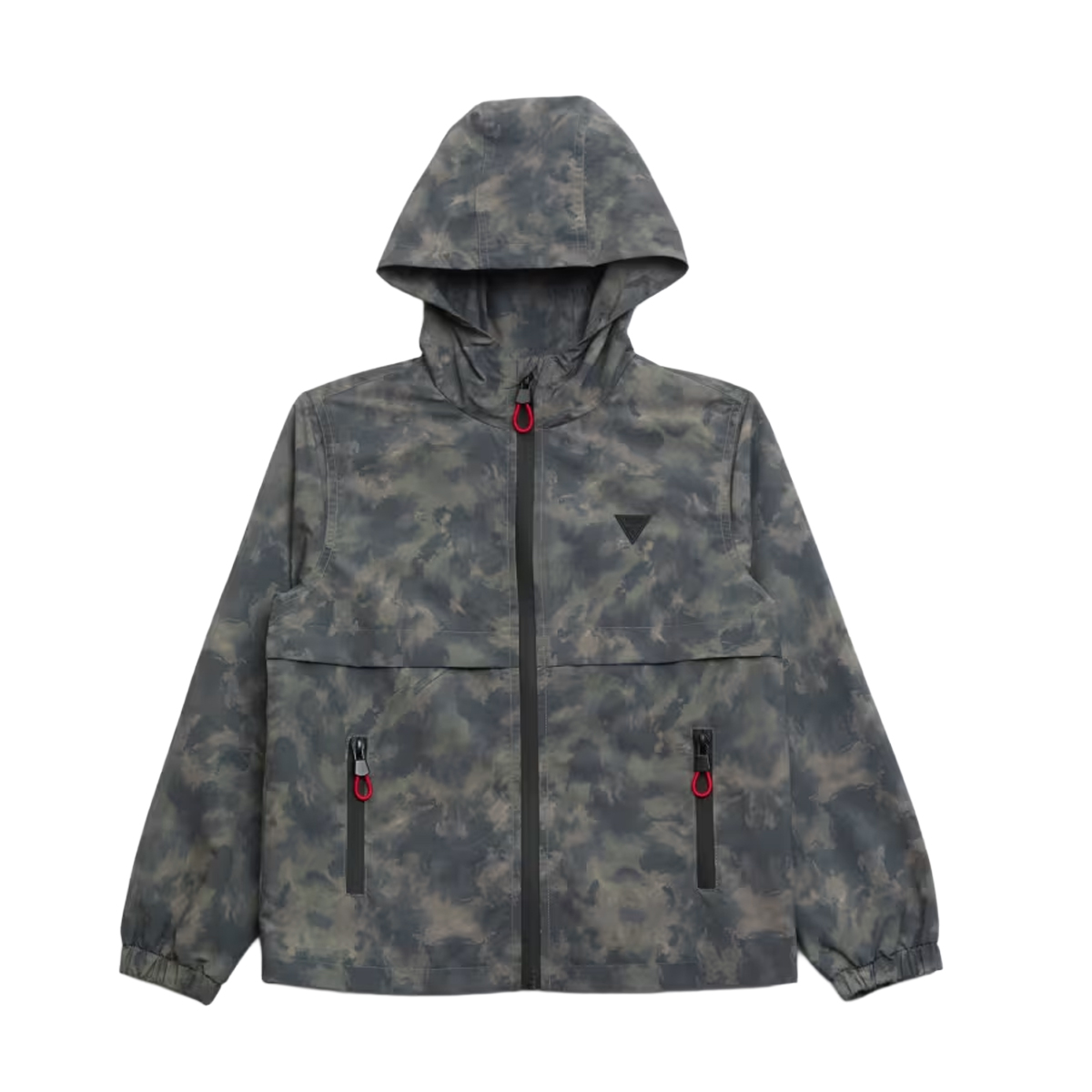 This jacket MANCHESTER NYLON CAMU JKT by GUESS FACTORY is a sophisticated windbreaker designed with a focus on durability and active wear. The garment features a precise silhouette with a protective hood and secure zippered pockets, highlighted by distinctive pullers that emphasize its utilitarian character. The chest is subtly branded with the iconic triangular patch, adding a layer of professional finish to the all-over patterned exterior.