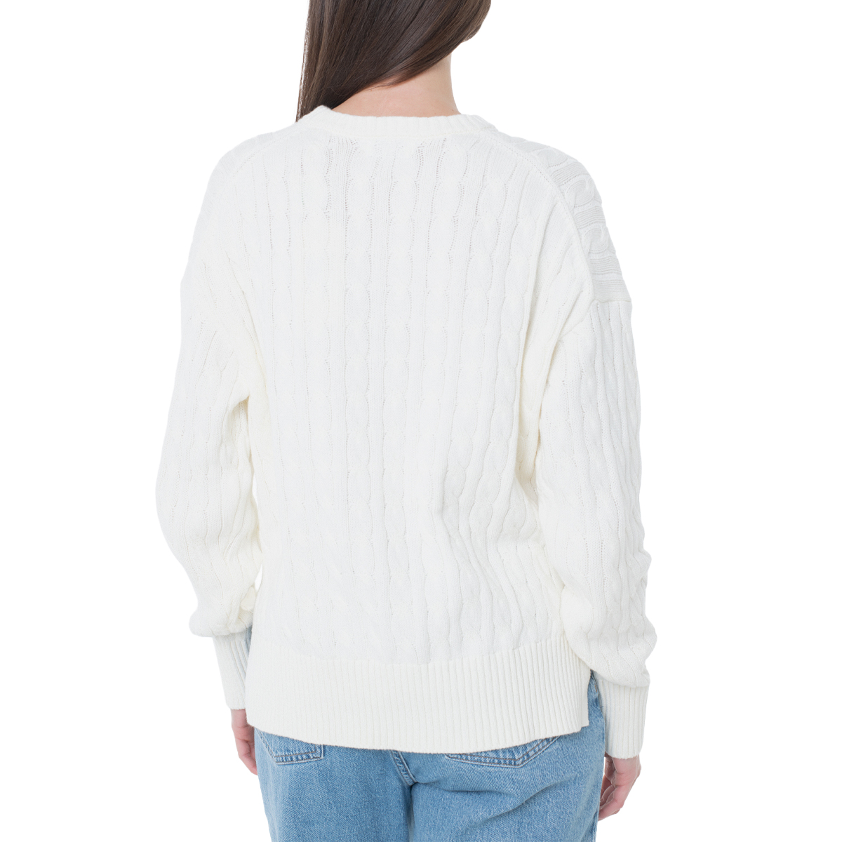 This sweater GJ LS CN 81 CABLE SWTR by GUESS JEANS is a sophisticated knitwear piece featuring a classic cable pattern that provides a tactile and dimensional appearance. The silhouette is enhanced by ribbed finishes on the cuffs and hem, ensuring the garment maintains its shape while providing a relaxed aesthetic. A prominent central embroidery serves as a focal point, emphasizing the brand's heritage.
