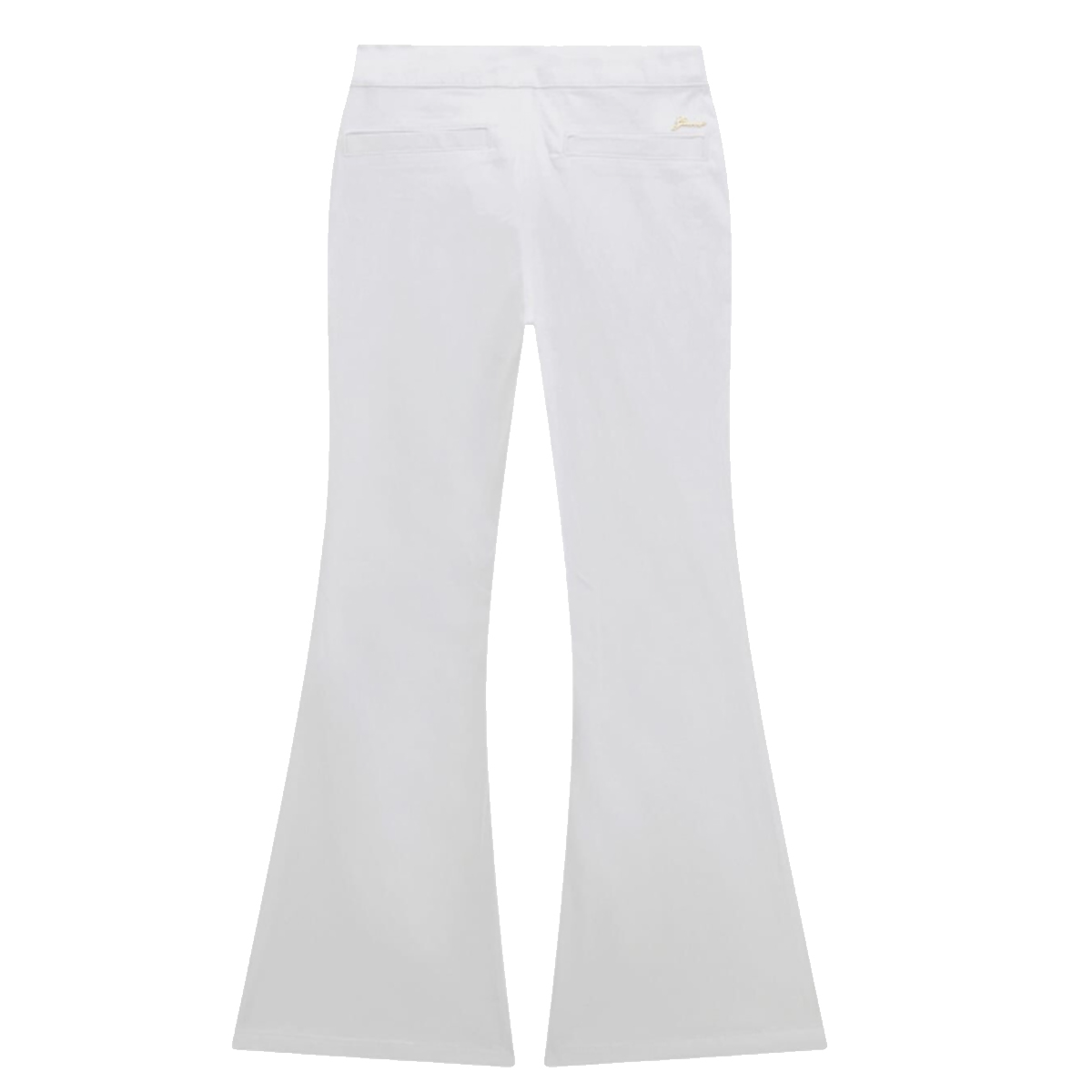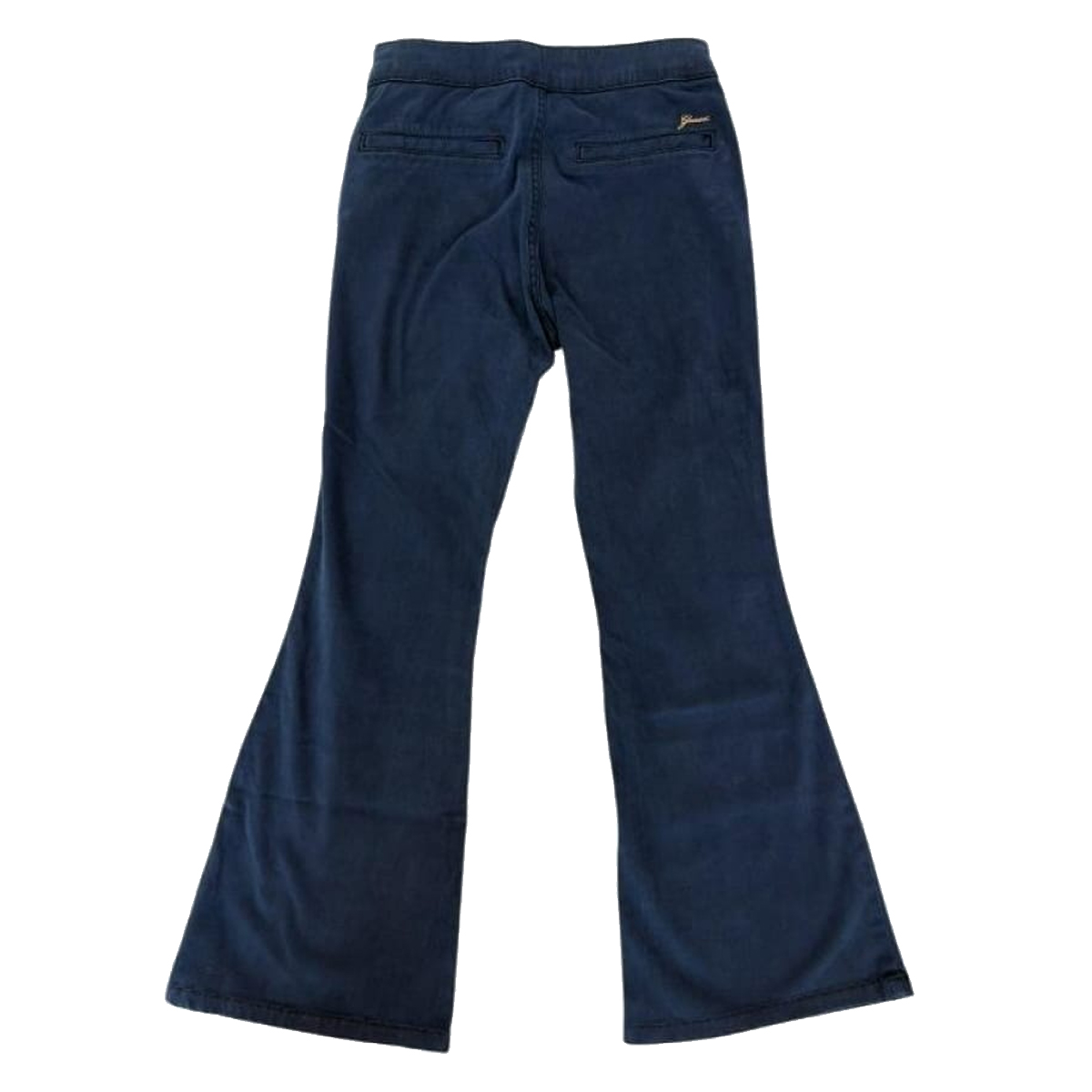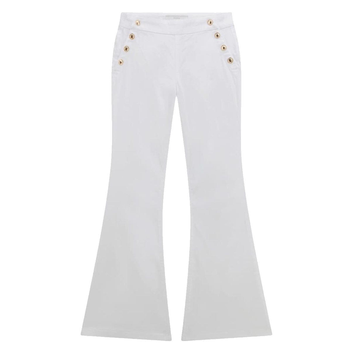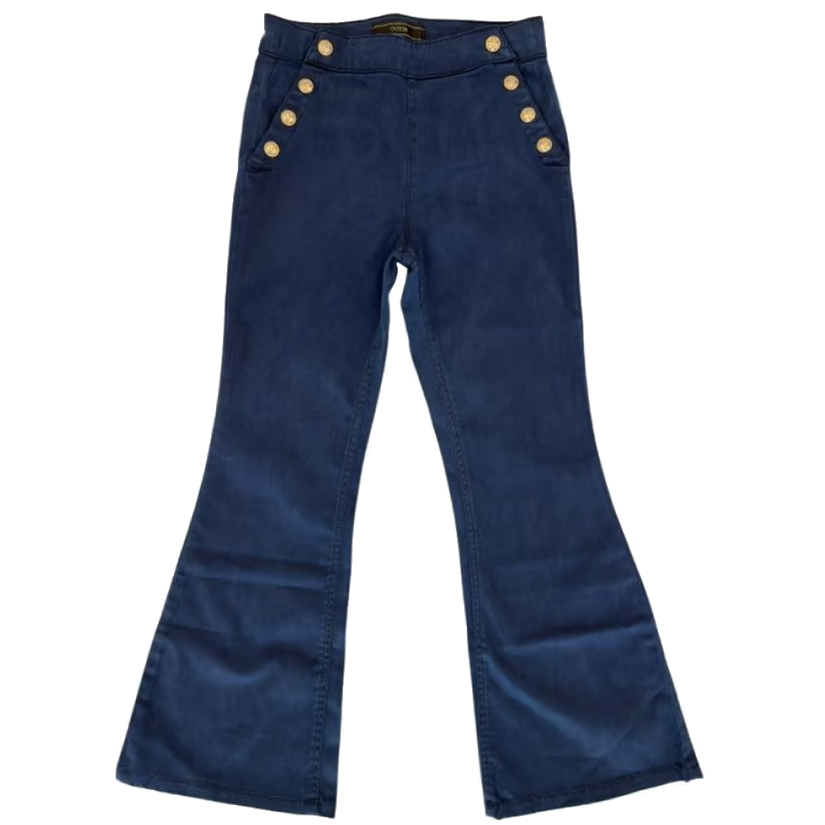 These PANTALONI GMT DYE SATEEN FLARE PANTS by GUESS showcase a distinctive silhouette with a pronounced flare starting from the knee. The front panel is meticulously detailed with polished metallic buttons, creating a structured aesthetic that emphasizes the high-waisted construction. This garment is designed with a smooth sateen finish that reflects light subtly, highlighting the clean lines and professional tailoring of the piece for a premium catalog.