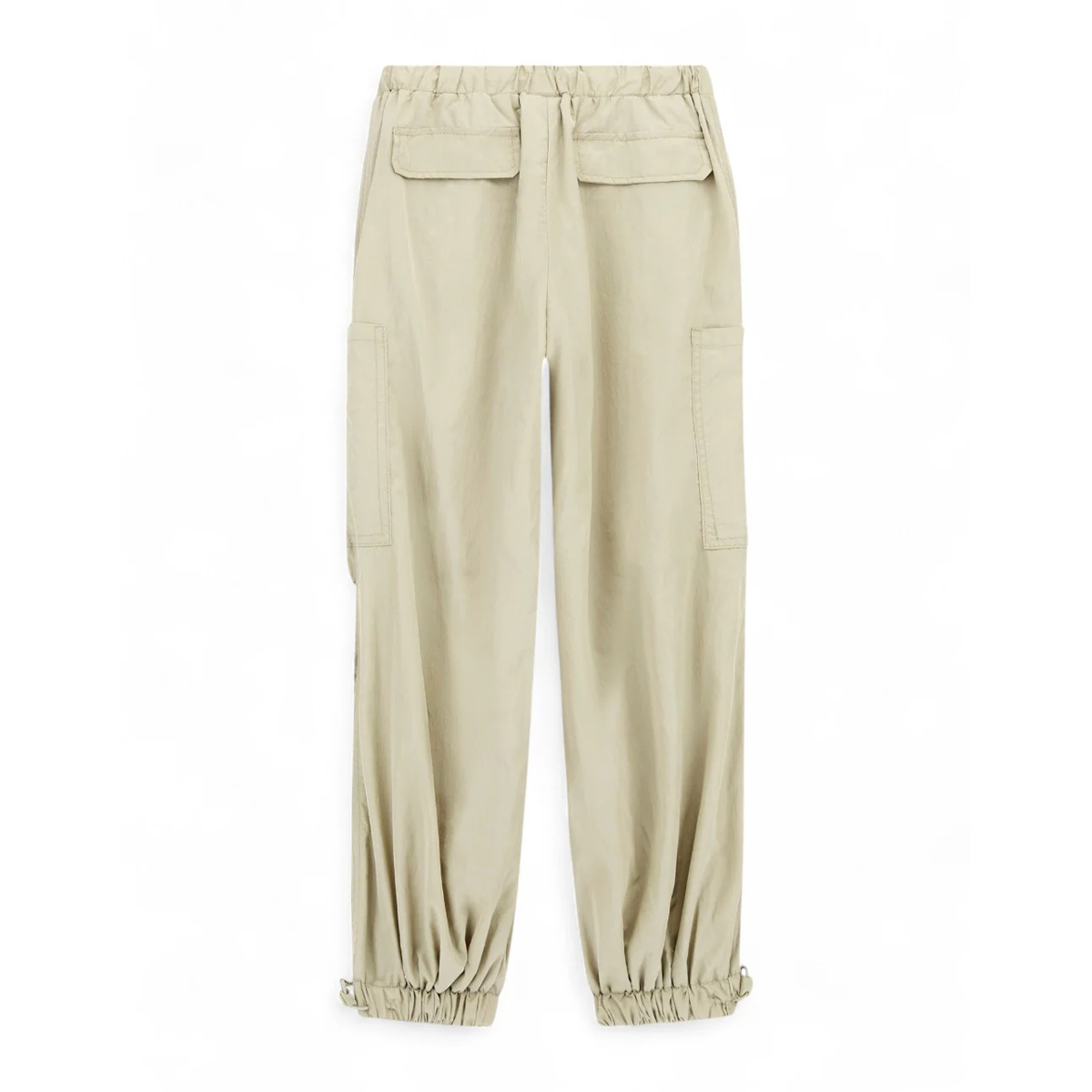 Crafted from 100% Polyamide/Nylon, the garment benefits from the inherent strength and lightweight nature of high-quality synthetic fibers. This material is particularly valued for its durability and ability to maintain its shape over time. The utilitarian aesthetic is completed by gathered ankle cuffs that emphasize the wide leg cut while ensuring a comfortable grip at the bottom.