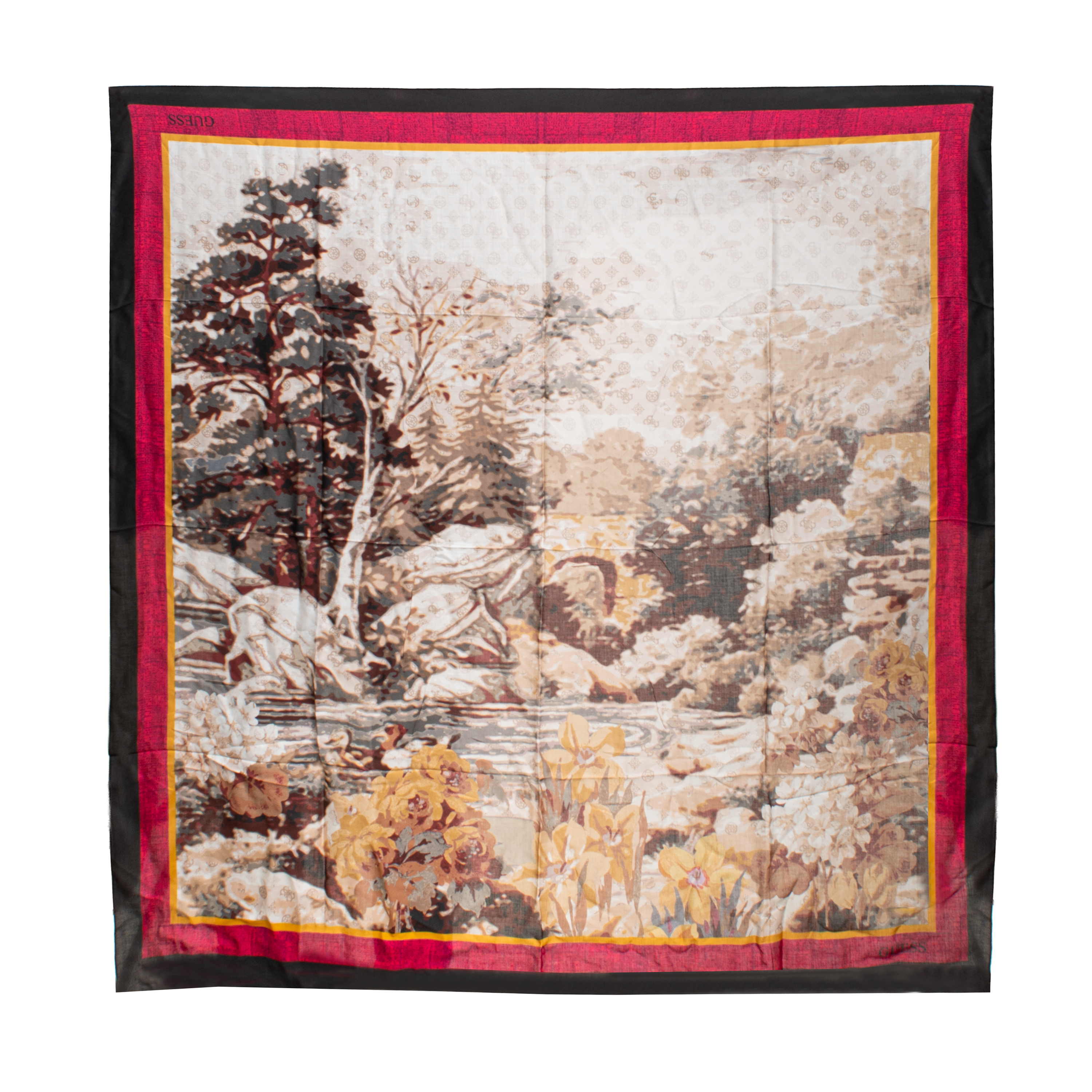 This PASHMINA KEFIAH 120X120 by GUESS is a sophisticated accessory featuring an intricate floral motif overlaid with the recognizable brand monogram. The generous square dimensions allow for versatile styling, while the precise hem finishing reflects the high-tier production standards of being made in ITALY. It presents a balanced silhouette that draped elegantly when worn.