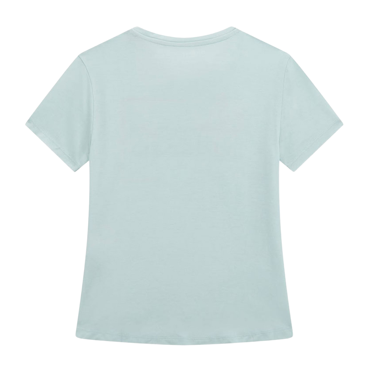This T SHIRT HIGH LOW VISCOSE SS T-SHIRT by GUESS is an exercise in textile balance and decorative flair. The center features a distinctive rectangular patch with raised lettering and nature-inspired graphics, finished with a glimmering edge that provides a sophisticated contrast to the smooth jersey body and the prominent vertical seam.