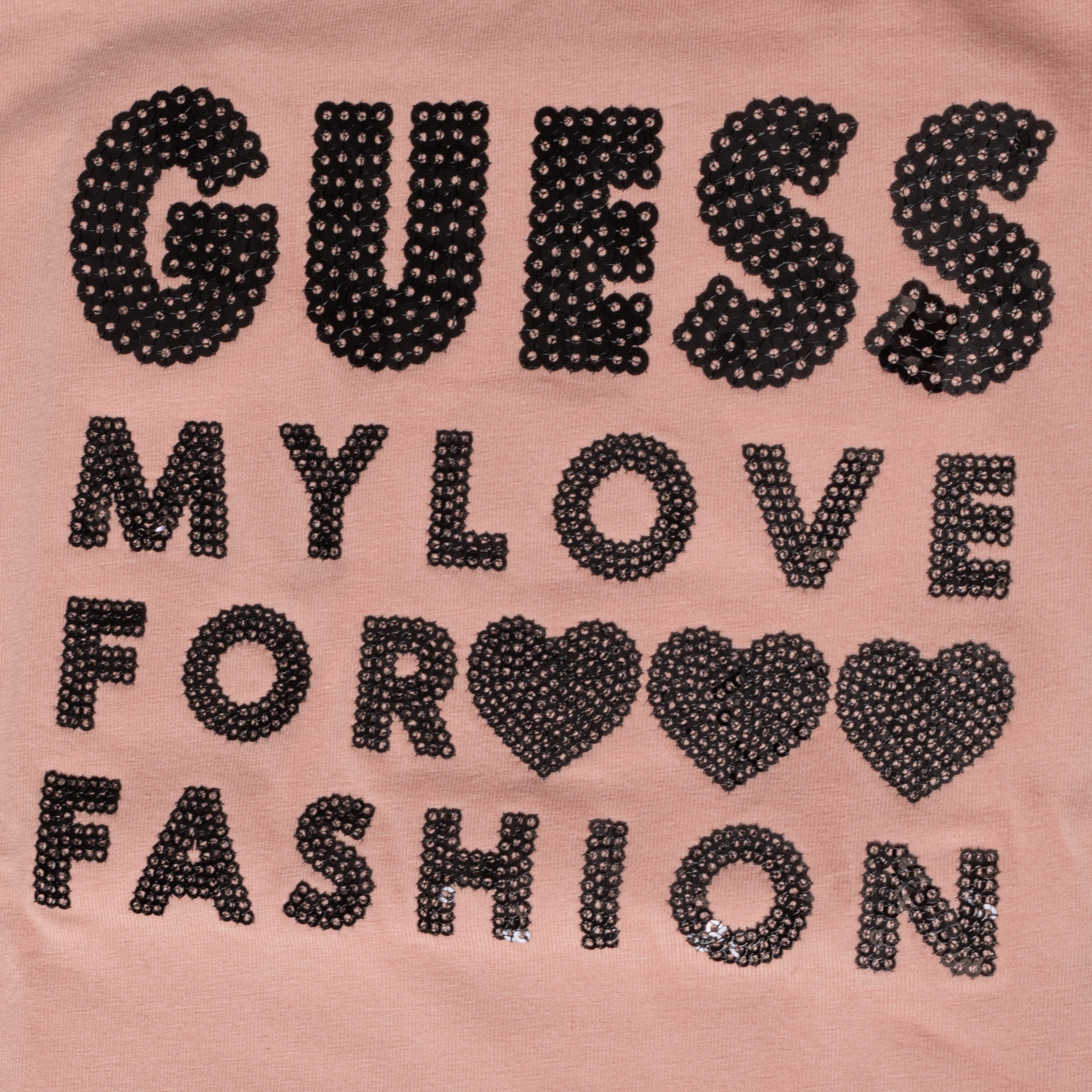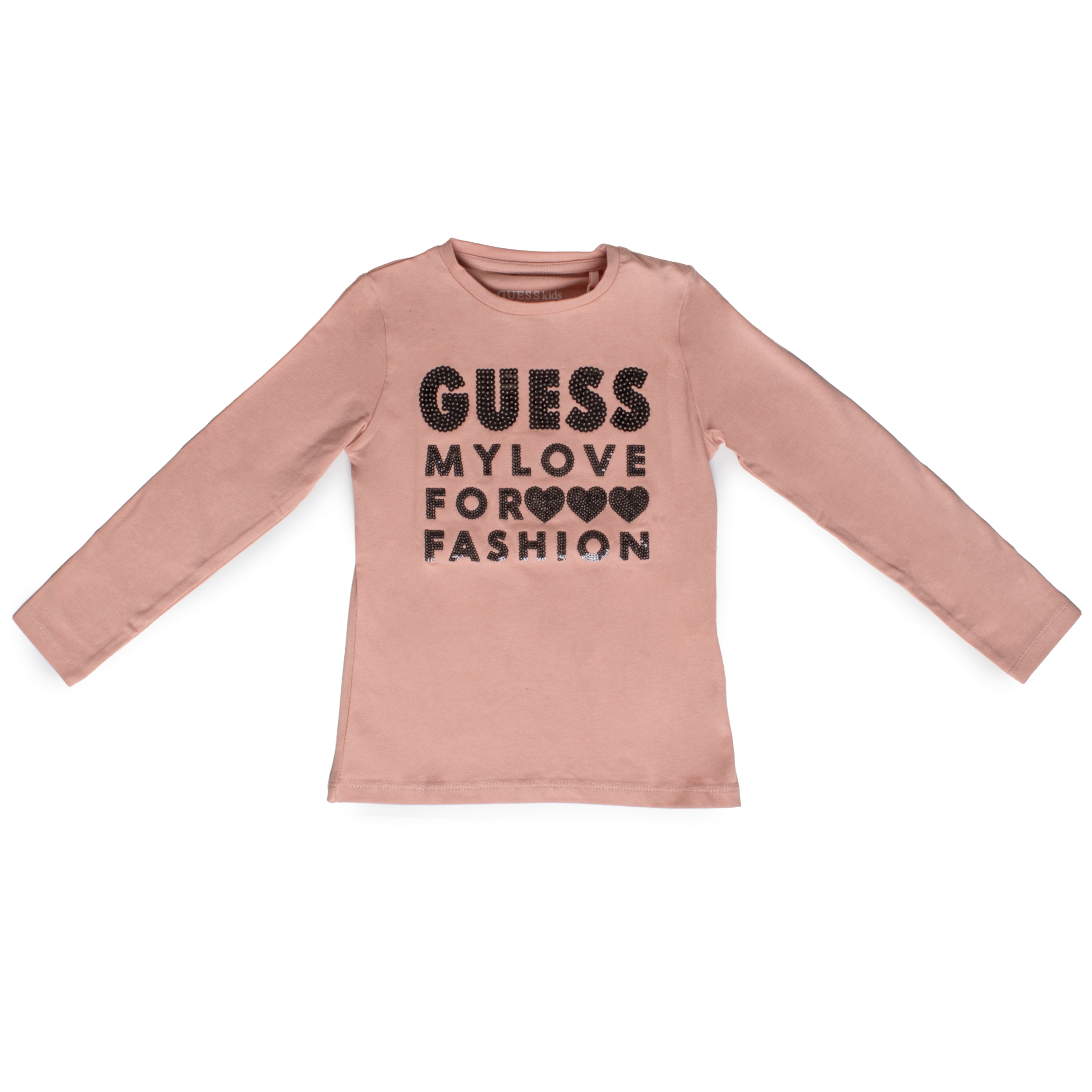 This T-SHIRT LS SEQUINS TEXT TEE by GUESS is a premium jersey garment featuring a structured long-sleeve silhouette and a classic crew neckline. The front is defined by a text graphic composed of shimmering sequins, adding a tactile dimension to the clean lines of the design and providing a sophisticated visual interest for the retail floor.