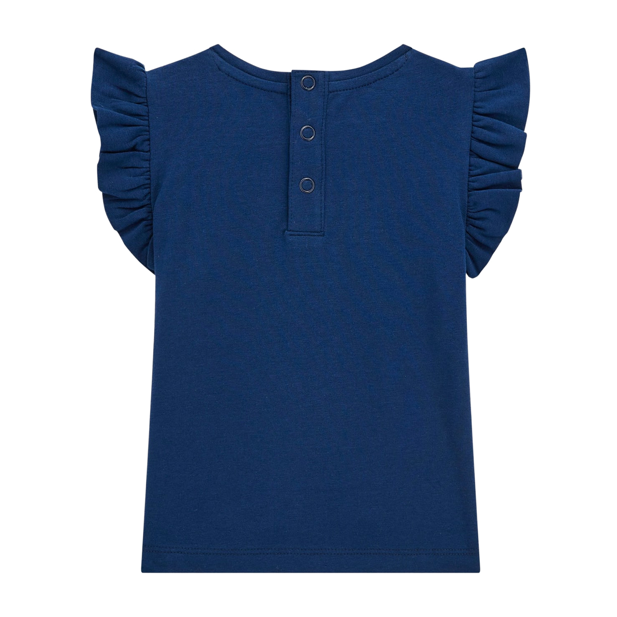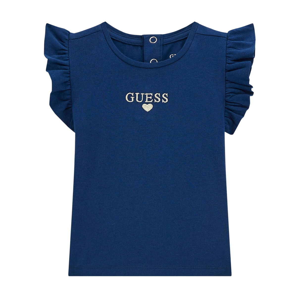 This T-SHIRT SS T-SHIRT WITH FRILLS by GUESS showcases a charming silhouette defined by its distinctive ruffled sleeves. The architecture of the garment features a clean crew neckline and a practical snap-button closure at the back, facilitating ease of wear. An embroidered logo with a heart motif sits prominently on the chest, signaling the brand's signature aesthetic through precise craftsmanship.