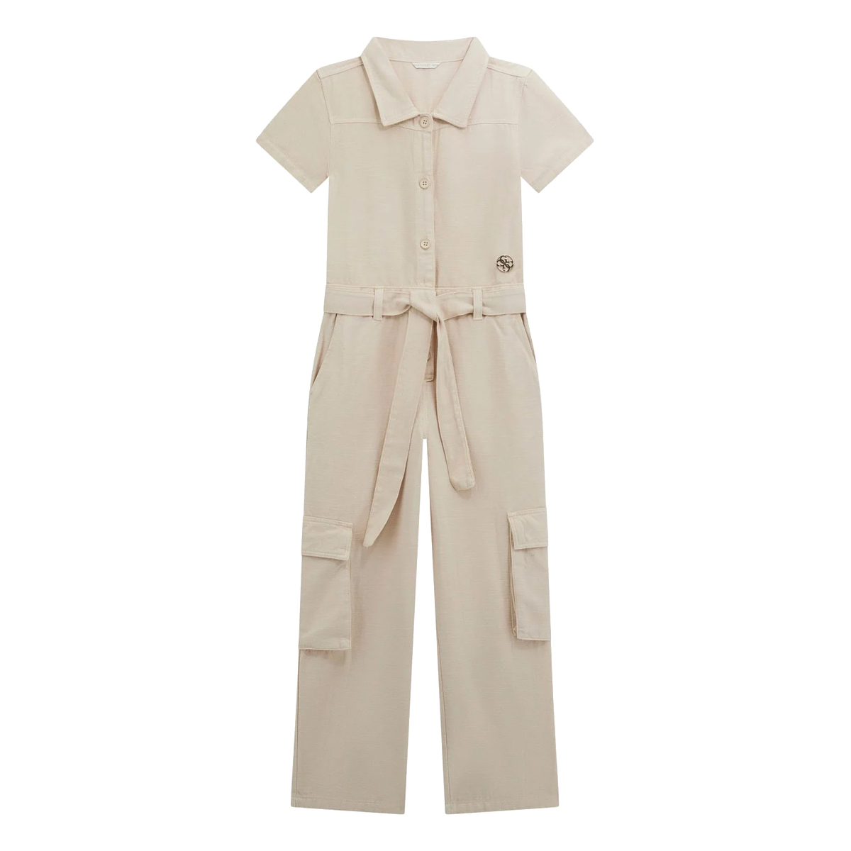 This jumpsuit GMT DYE TENCEL TWILL JUMPSUIT by GUESS is characterized by its exceptional softness and utility-inspired silhouette. The garment features short sleeves and a buttoned placket, complemented by a fabric tie-belt that creates a tailored waistline. Large utility pockets on the thighs add functional depth to the straight-leg profile.