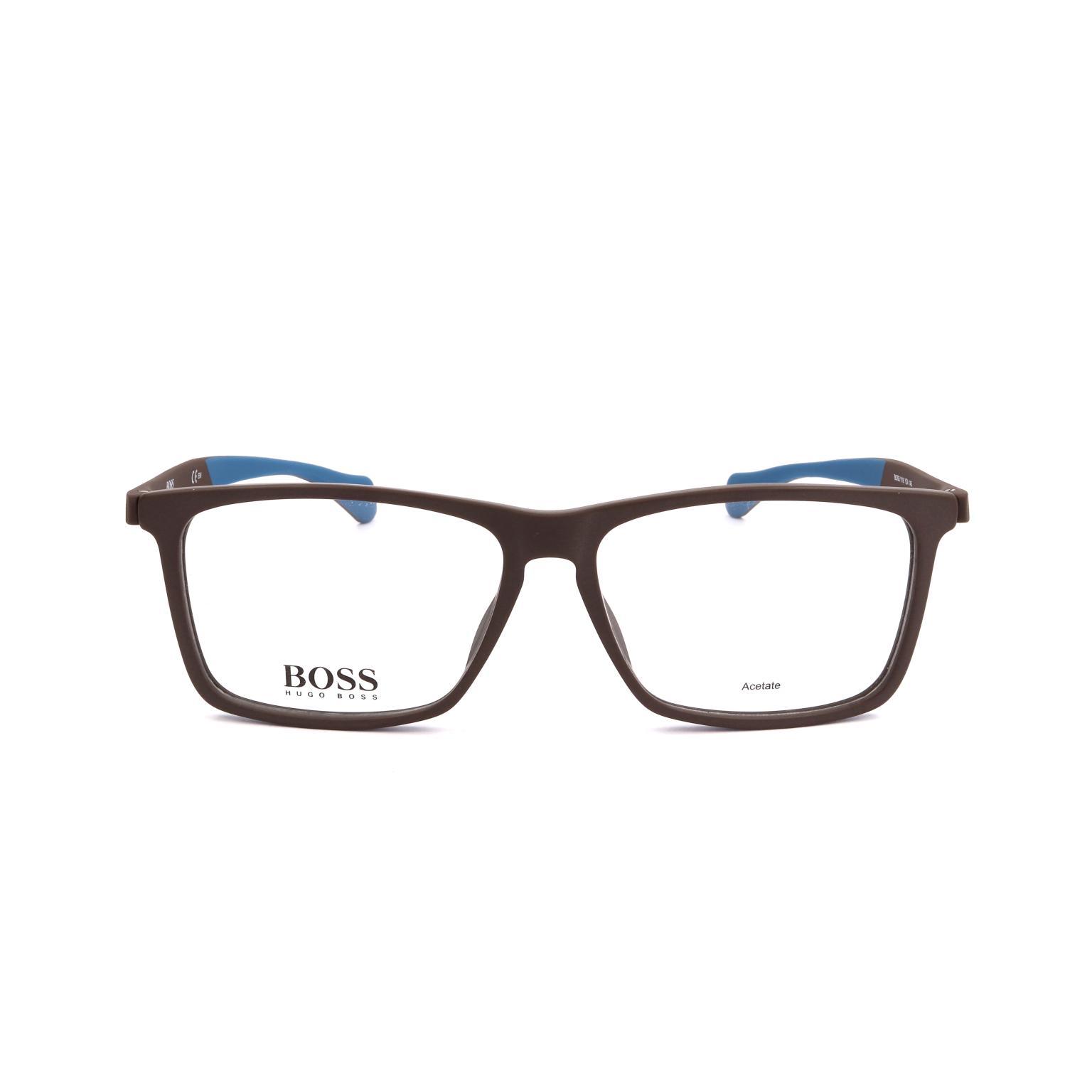 These eyewear frames by HUGO BOSS showcase a sophisticated square silhouette with a focus on structural integrity. The design features a robust bridge and integrated nose pads that emphasize a seamless, understated aesthetic. The temples transition smoothly from the front, maintaining a consistent thickness that speaks to a sturdy build.