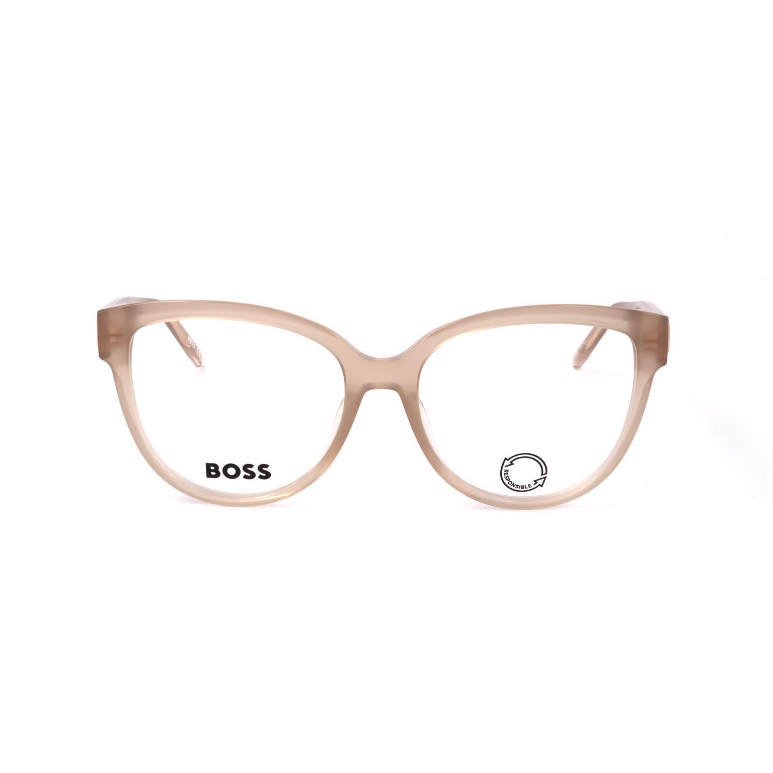 These HUGO BOSS glasses showcase a refined cat-eye silhouette that emphasizes a sharp, architectural aesthetic. The frame features a smooth, continuous surface with integrated nose pads, ensuring a sleek appearance from every angle. The temples are discreetly branded, reflecting a commitment to understated luxury and precise engineering in the construction of the hinges and joints.