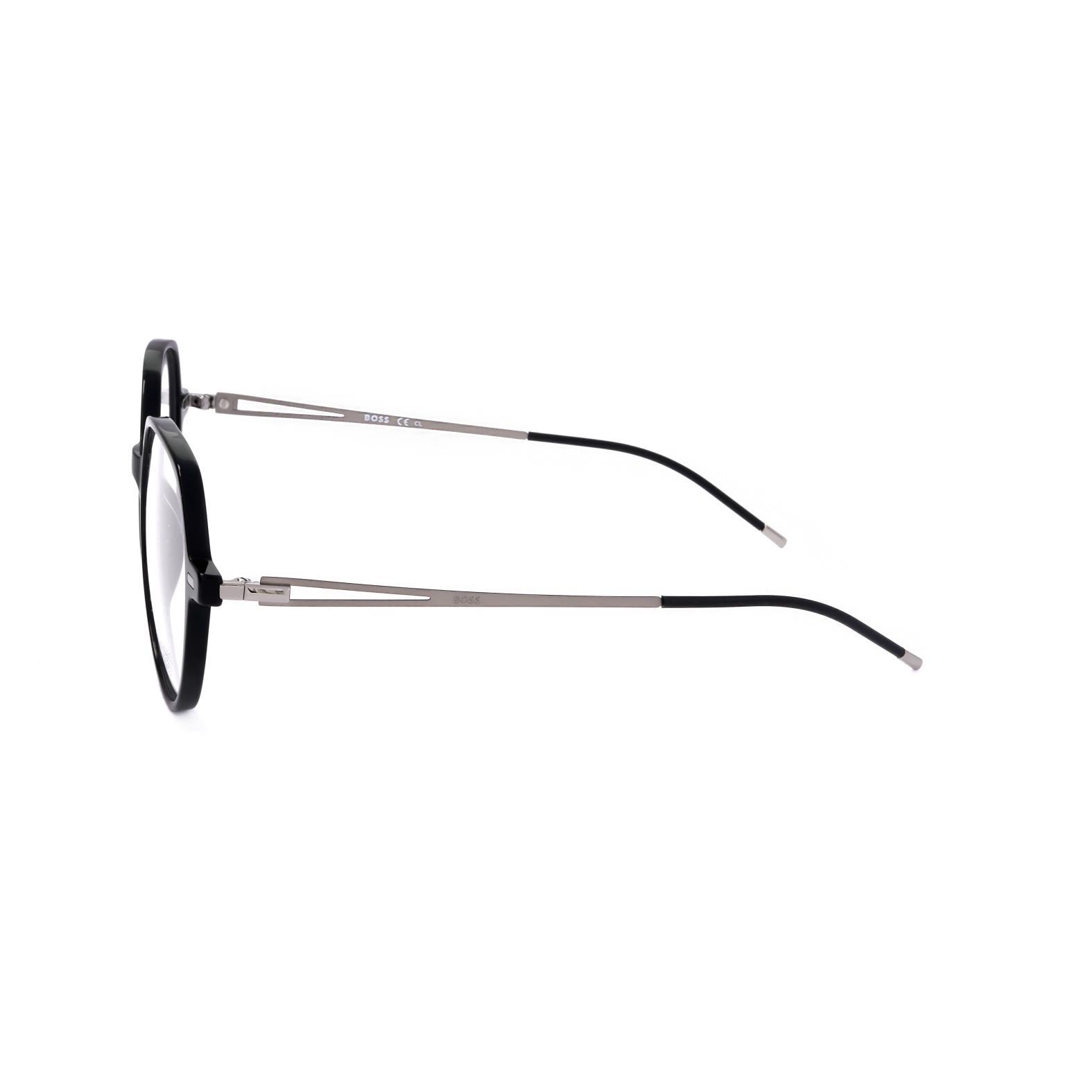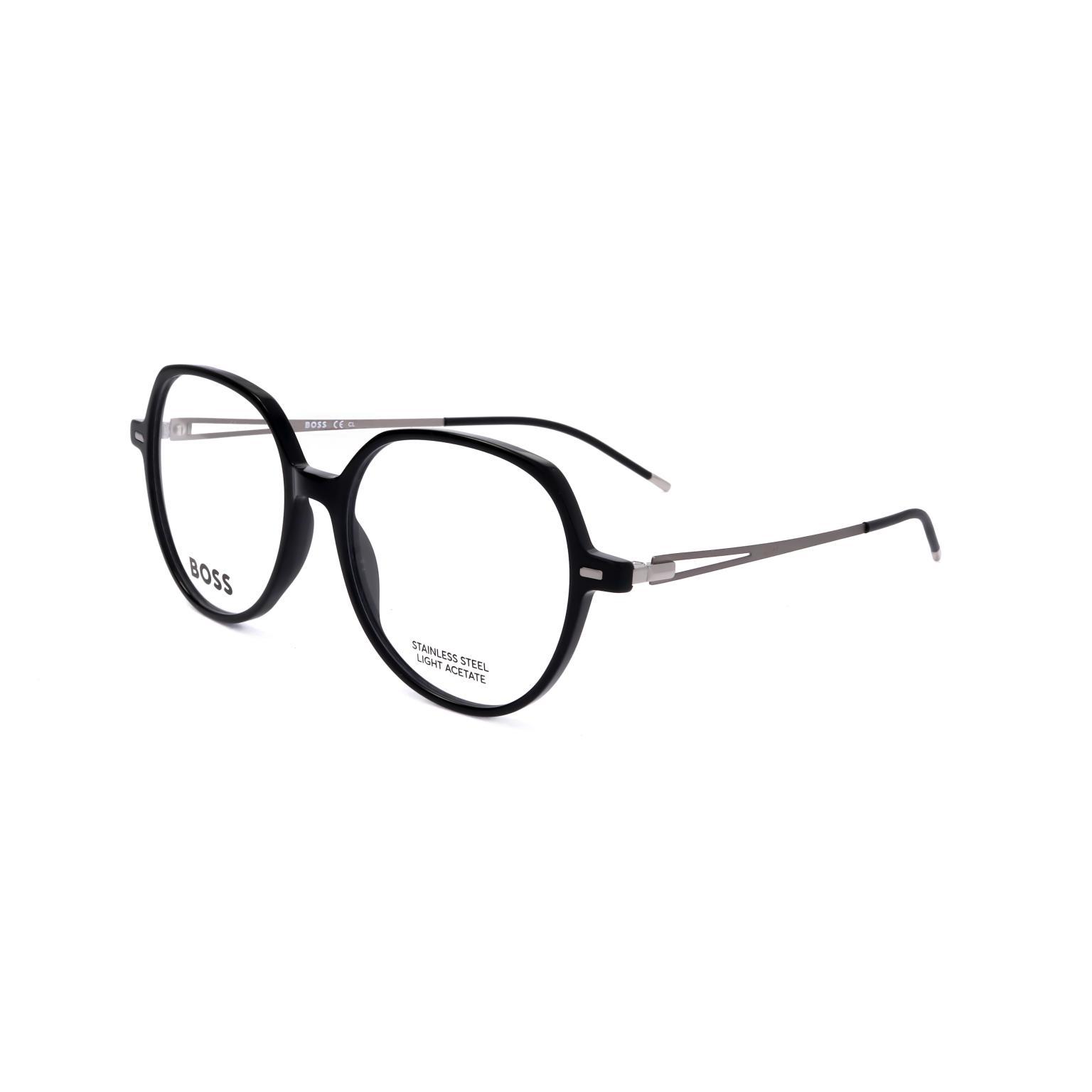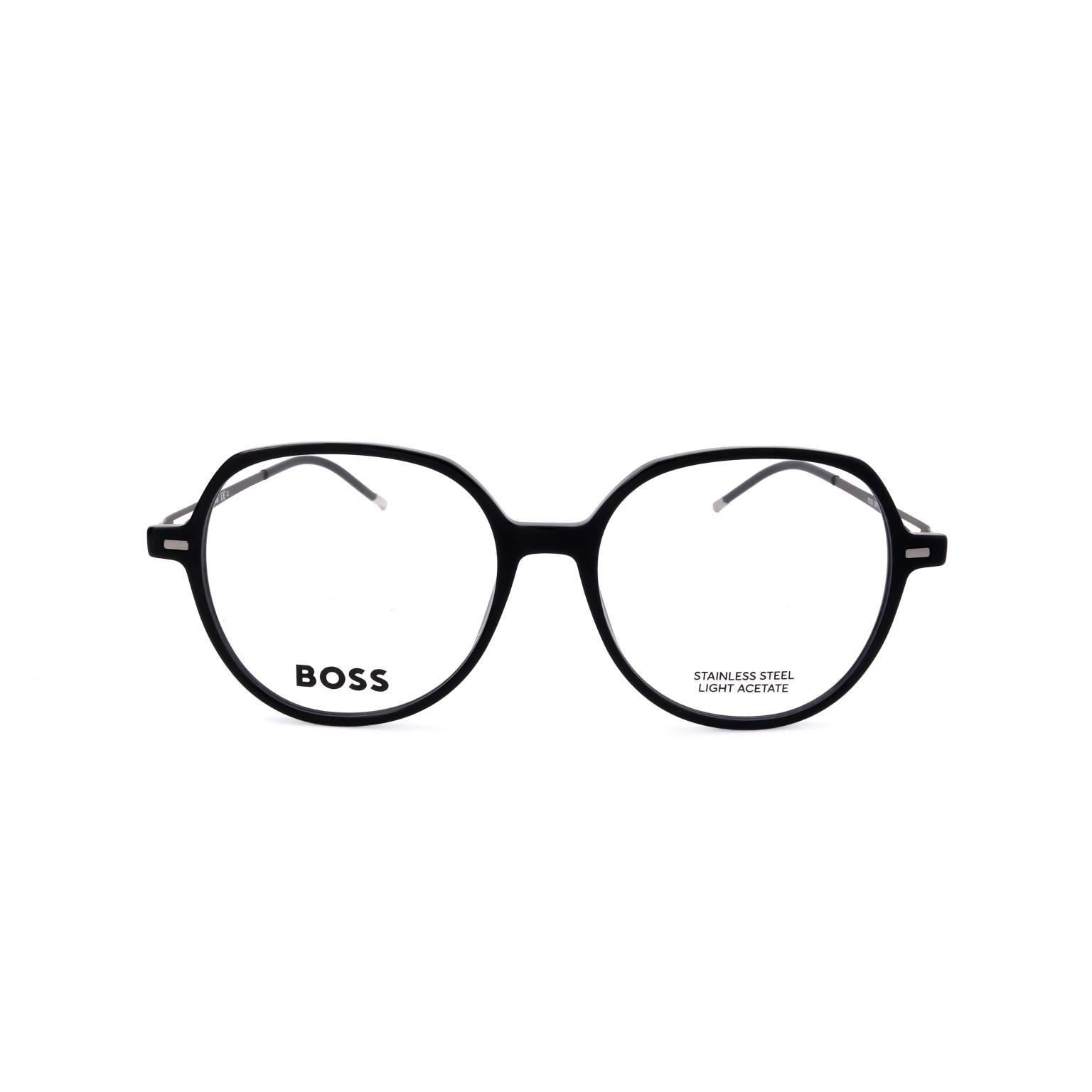 These HUGO BOSS glasses showcase a refined butterfly silhouette, emphasizing a bold architectural front paired with slender, minimalist temples. The contrast between the substantial rims and the delicate metal components reflects a contemporary approach to eyewear design, suitable for high-end retail collections.
