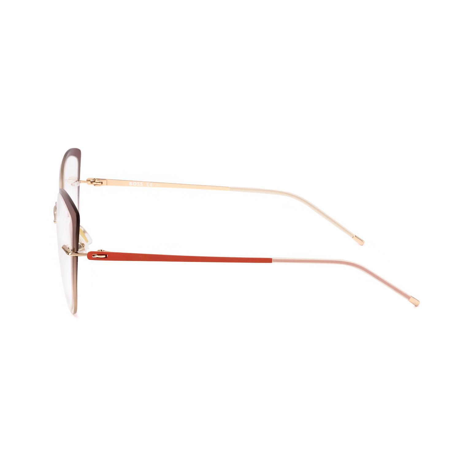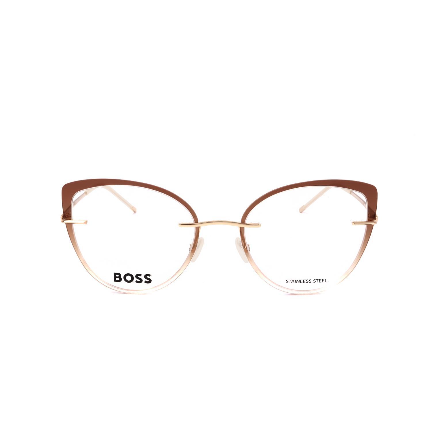 These occhiali by HUGO BOSS showcase a refined cat-eye shape with a distinctively thickened brow line that creates a sculptural silhouette. The design utilizes a 20mm bridge to provide a secure fit, while the 53mm lenses are framed by a delicate metallic structure that emphasizes a modern, airy aesthetic.