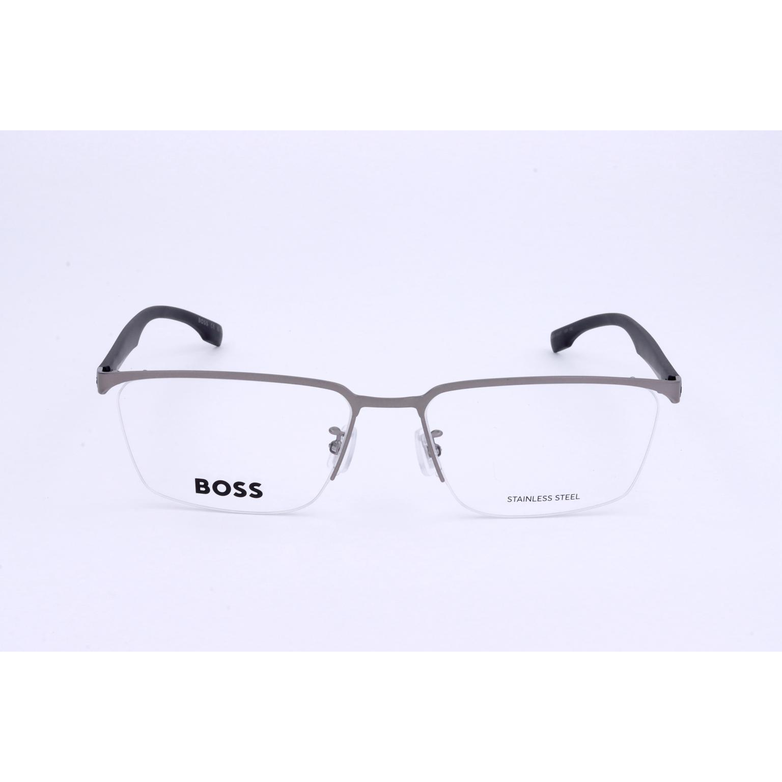 These HUGO BOSS eyewear frames showcase a distinct half-rim construction, designed for a refined and contemporary aesthetic. The angular lens shape is complemented by slim, sculpted temples and a subtle, robust bridge, reflecting a sleek design philosophy. Discreet BOSS branding is visible on the lens, affirming its premium origin.