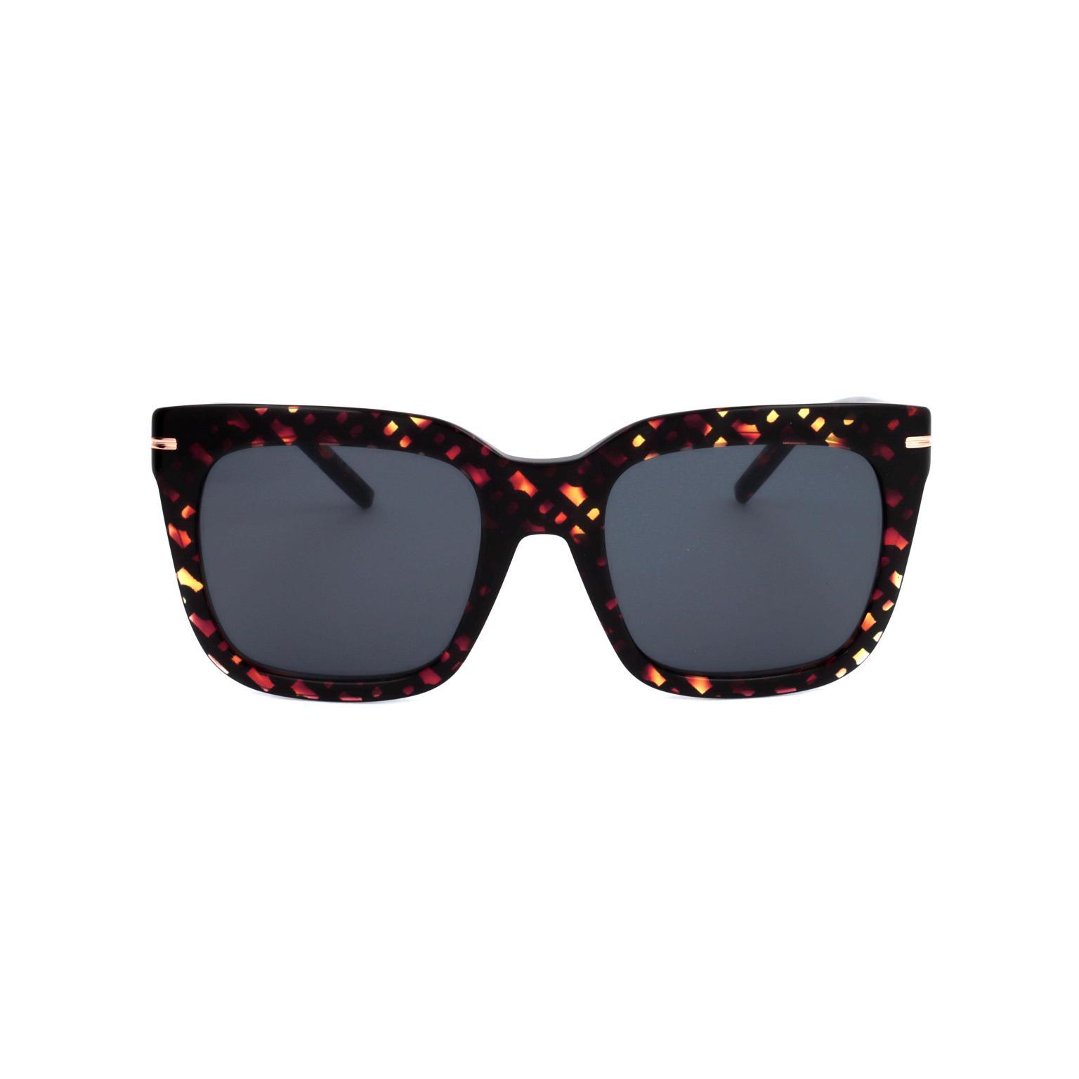 These sunglasses from HUGO BOSS offer a bold, rectangular silhouette with a subtly angled brow line, imparting a modern and assertive presence. The frame is distinguished by an intricate, speckled pattern that provides a rich visual texture, making each pair uniquely appealing. Dark, generous lenses ensure ample coverage and complement the frame's robust construction.