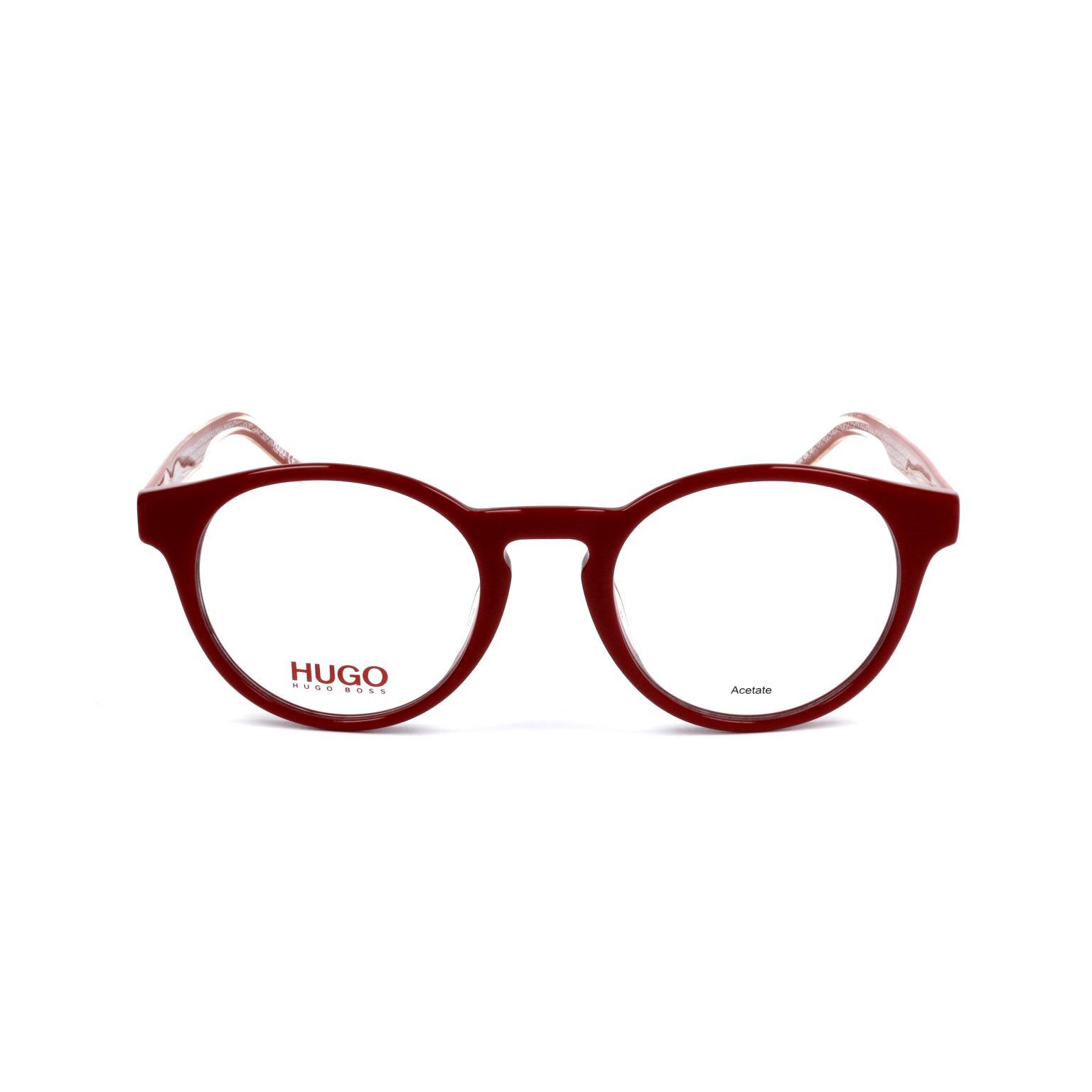These glasses by HUGO emphasize a bold, sculptural aesthetic through their thick rims and rounded lens shape. The design features a sturdy construction with a 21 mm bridge and 49 mm lens diameter, providing a stable fit for a variety of facial profiles. The integrated hinges ensure a seamless transition from the frame front to the temples.