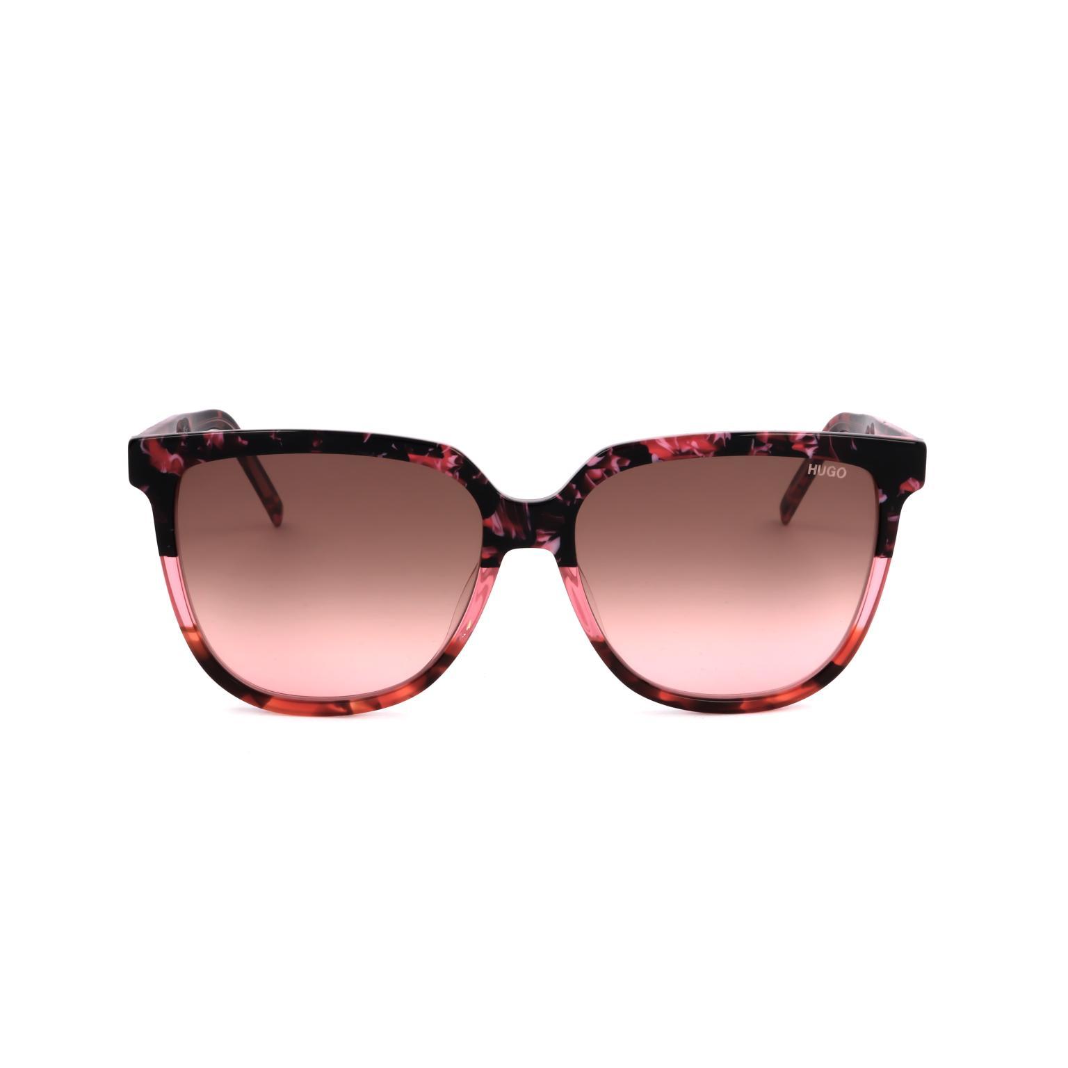 These occhiali by HUGO showcase a striking, oversized silhouette that emphasizes a bold aesthetic. The frame features a substantial upper rim that tapers into a more delicate lower profile, creating a balanced visual weight across the face. A subtle logo signature on the lens adds a discreet mark of quality to the overall construction, highlighting the attention to detail.